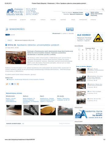 03.06.2013 Polskie Radio Białystok | Wiadomości | Wilno: Spotkanie rektorów uniwersytetów polskich Ramówka O nas Kontakt Radio online Sklep internetowy Patronaty Teraz na antenie: Najbliżej Ciebie Zaprasza: Wojciech Kujałowicz wiadomości program audycje kultura muzyka reportaż akcje Szukaj mniejszości reklama WIADOMOŚCI: Wiadomości | Łomża | Suwałki powrót Lubię to! Najnowsze informacje o korkach w naszych miastach i regionie Bądź pierwszym znajomym, który to lubi. Wilno ALE KORKI! Spotkanie rektorów uniwersytetów polskich 23 maja 2013, 20:05 KALENDARZ «< Pn Dyskusja o finansowaniu nauki zdominowała drugi dzień Konferencji Rektorów Uniwersytetów Polskich. Piętnastu uczestników obradowało w czwartek (23.05) w Wilnie. Jak tłumaczy rektor Uniwersytetu w Białymstoku prof. Leonard Etel w budżecie Narodowego Centrum Nauki powinno znaleźć się więcej pieniędzy na badania naukowe. Natomiast zdaniem przewodniczącego KRUP-u prof. Bronisława Marciniaka pieniądze, których jest za mało, >» Czerwiec 2013 Wt Śr Cz Pi So Nd 1 2 3 4 5 6 7 8 9 10 11 12 13 14 15 16 17 18 19 20 21 22 23 24 25 26 27 28 29 30 powinny trafiać do najlepszych. Rektorzy rozmawiali także o m.in. jakości kształcenia oraz podwyżkach dla pracowników naukowych. W Inne w dziale: Region Region: Wyniki sprawdzianu szóstoklasistów ramach spotkania odbyła się też prezentacja zamiejscowego Wydziału Ekonomiczno - Informatycznego Uniwersytetu w Białymstoku. 3 czerwca, 11:14 W piątek ostatni dzień obrad rektorów. (js/wsz) Jankielówka: Przyczyny śmierci ofiar piątkowej tragedii nadal nieznane Zobacz też: Białystok: Konferencja Rektorów Uniwersytetów Polskich 3 czerwca, 08:38 Zambrów: Nazwa ulicy inwestycyjną przeszkodą? 3 czerwca, 08:19 Kraj: OSA na plagiat Najważniejsze dzisiaj: 3 czerwca, 07:47 Wiadomości Kultura Region: Wyniki sprawdzianu szóstoklasistów Bielsk Podlaski: IX Kajakarstwo: Medale Konkurs Piosenki reprezentantów kraju i Ukraińskiej "Z Podlaskiej regionu w Poznaniu Krynicy" Sport Ale jazda Region: Śmiertelny wypadek na DK 19 Łomża: 90-lecie PZŁ 3 czerwca, 07:12 POLECAMY POLECAMY WASZE KOMENTARZE: (0) Dodaj komentarz Wygrana Jagiellonii na koniec sezonu www.radio.bialystok.pl/wiadomosci/index/id/99194 1/2