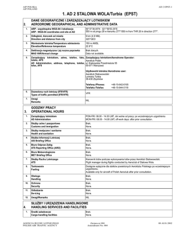 AIP POLSKA AIP POLAND AD 2 EPST-1 1. AD 2 STALOWA WOLA/Turbia (EPST) 2. DANE GEOGRAFICZNE I ZARZĄDZAJĄCY LOTNISKIEM AERODROME GEOGRAPHICAL AND ADMINISTRATIVE DATA 1. ARP - współrzędne WGS-84 i lokalizacja ARP - WGS-84 coordinates and site at AD 50°37’39.05”N 021°59’53.35”E 550 m od progu 28 w kierunku 277°/550 m from THR 28 in direction 277°. 2. Odległość, kierunek od miasta Direction and distance from city 9 km (4.9 NM). 325°GEO 3. Wzniesienie lotniska/Temperatura odniesienia Elevation/Reference temperature 150 m AMSL 22.9°C 4. Deklinacja magnetyczna i jej roczna poprawka MAG VAR/Annual change Brak danych. Data not available. 5. Zarządzający lotniskiem, adres, telefon, faks, teleks, AFS AD Administration, address, telephone, telefax, telex, AFS Zarządzający lotniskiem/Aerodrome Operator: Aeroklub Polski ul. Krakowskie Przedmieście 55 00-071 Warszawa Użytkownik lotniska:/Aerodrome user: Aeroklub Stalowowolski Lotnisko Turbia 39-430 Zbydniów Telefony:/Phones: Telefaks:/Telefax: 6. Dozwolony ruch lotniczy (IFR/VFR) Types of traffic permitted (IFR/VFR) VFR 7. Uwagi Remarks NIL 3. +48-15-642-6165 +48-15-844-0118 GODZINY PRACY OPERATIONAL HOURS 1. Zarządzający lotniskiem AD Administration PON-FRI: 08.00 - 14.00 LMT, dni wolne od pracy: po wcześniejszym uzgodnieniu MON-FRI: 08.00 - 14.00 LMT, off-work days: after prior consultation. 2. Służby celne i paszportowe Customs and immigration Brak. None. 3. Służby medyczne i sanitarne Health and sanitation Brak. None. 4. Służba Informacji Lotniczej AIS Briefing Office Brak. None. 5. Biuro Odpraw Załóg ATS Reporting Office (ARO) Brak. None. 6. Biuro Meteorologiczne MET Briefing Office Brak. None. 7. Służby Ruchu Lotniczego ATS Kierownik lotów podczas wykonywania lotów przez Aeroklub Stalowowolski. Flight manager during flights conducted by Aeroclub of Stalowa Wola. 8. Tankowanie Fueling Dostępne wyłącznie dla statków powietrznych Aeroklubu Polskiego po wcześniejszym uzgodnieniu. Available only for aircraft of Polish Aeroclub after prior consultation. 9. Obsługa Handling Brak. None. 10. Ochrona Security Brak. None. 11. Odladzanie De-icing Brak. None. 12. Uwagi/Remarks NIL 4. 1. SŁUŻBY I URZĄDZENIA HANDLINGOWE HANDLING SERVICES AND FACILITIES Środki załadowcze Cargo-handling facilities AGENCJA RUCHU LOTNICZEGO POLISH AIR TRAFFIC AGENCY Brak. None. Zmiana nr 004 Amendment No. 004 08 AUG 2002 AD 2 EPST-2 AIP POLSKA AIP POLAND 2. Rodzaje paliwa i oleju Fuel/oil types 1. Rodzaje paliwa:/Fuel grades: Avgas 100LL 2. Rodzaje oleju/Oil grades: Aero-shell W-100 3. Urządzenia do tankowania/Pojemność Fueling facilities/Capacity Dystrybutor ze zbiornikami o pojemności 40000 litrów (po wcześniejszym uzgodnieniu). Fuel dispencer and tanks of capacity of 40000 litres (after prior consultation). 4. Urządzenia do odladzania De-icing facilities Brak. None. 5. Możliwość hangarowania dla przylatujących stat- Ograniczona. Istnieje możliwość zakotwiczenia na płycie po wcześniejszym uzgodnieków powietrznych niu. Hangar space for visiting aircraft Limited. Aircraft may be anchored to the apron after prior consultation. 6. Urządzenia naprawcze dla przylatujących statków Brak. powietrznych None. Repair facilities for visiting aircraft 7. Uwagi Remarks 5. NIL OBSŁUGA PASAŻERSKA PASSENGER FACILITIES 1. Hotele Hotels Hotele w mieście. City hotels. 2. Restauracje Restaurants Restauracje w mieście. City restaurants. 3. Środki transportu Transportation Taksówki. Taxi. 4. Pomoc medyczna Medical facilities Szpitale w mieście. Municipal hospitals. 5. Usługi bankowe i pocztowe Bank and Post Office W mieście. In the city. 6. Informacja turystyczna Tourist Office Biura turystyczne w mieście. Tourist offices in the city. 7. Uwagi Remarks NIL 6. RATOWNICTWO I OCHRONA PRZECIWPOŻAROWA RESCUE AND FIRE FIGHTING SERVICES 1. Kategoria lotniska w zakresie ochrony przeciwBrak. pożarowej None. Aerodrome category for fire fighting 2. Wyposażenie ratownicze Rescue equipment 3. Możliwości usuwania uszkodzonych statków poBrak. wietrznych None. Capability for removal of disabled 4. Uwagi Remarks 7. Brak. None. NIL UŻYTKOWANIE LOTNISKA - URZĄDZENIA DO OCZYSZCZANIA SEASONAL AVAILABILITY - CLEARING 1. Rodzaj(e) urządzeń do oczyszczania Type(s) of clearing equipment Brak. None. 2. Kolejność oczyszczania Clearance priorities Patrz AD 1.2, punkt 2.9. See AD 1.2, point 2.9. 3. Uwagi Remarks NIL 08 AUG 2002 Zmiana nr 004 Amendment No. 004 AGENCJA RUCHU LOTNICZEGO POLISH AIR TRAFFIC AGENCY AIP POLSKA AIP POLAND 8. AD 2 EPST-3 PŁYTY, DROGI KOŁOWANIA, PUNKTY SPRAWDZANIA URZĄDZEŃ POKŁADOWYCH APRONS, TAXIWAYS AND CHECK LOCATIONS DATA 1. Nawierzchnia i nośność płyty Apron surface and strength 2. Szerokość drogi kołowania, nawierzchnia nośność Taxiway width, surface and strength 3. Punkt sprawdzania wysokościomierzy ACL location and elevation Brak. None. 4. Punkty sprawdzania VOR/INS VOR/INS checkpoints Brak. None. 5. Uwagi Remarks NIL 9. Trawiasta./Brak danych. Grass./Data not available. i Brak. None. PROWADZENIE NAZIEMNE, SYSTEM STEROWANIA ORAZ OZNAKOWANIE SURFACE MOVEMENT GUIDANCE AND CONTROL SYSTEM AND MARKINGS 1. Znaki identyfikacyjne miejsc postojowych, linie prowadzenia po drogach kołowania oraz wizualne systemy dokowania/parkowania na miejscach postojowych statków powietrznych Aircraft stand identification signs, TWY guide lines and visual docking/parking guidance system at aircraft stands 2. Oznakowanie i światła dróg startowych oraz dróg Brak. kołowania None. RWY and TWY markings and lights 3. Poprzeczki zatrzymania Stop bars Brak. None. 4. Uwagi Remarks NIL System prowadzenia na TWY/Taxiing guidance system: Brak./None. Wizualne oznaczenie położenia/Visual aids to location: Brak./None. Urządzenia sygnalizacji naziemnej/Indicators and ground signalling devices: Brak./None. PRZESZKODY LOTNISKOWE 10. AERODROME OBSTACLES W strefach podejścia i startu In approach/TKOF areas W kręgu nadlotnisko