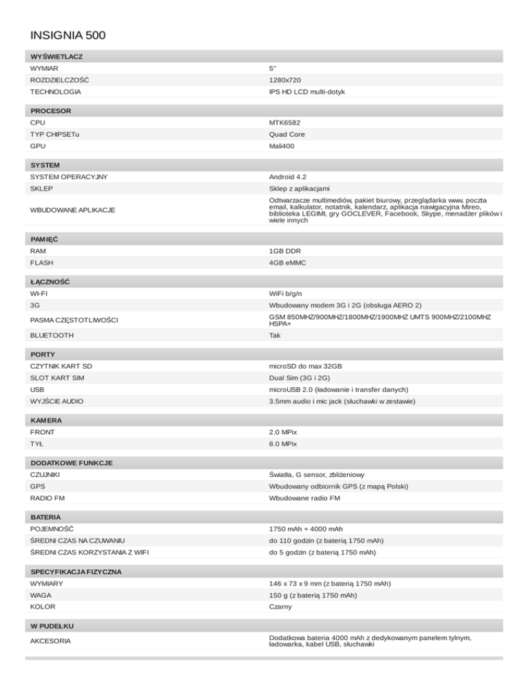 INSIGNIA 500 WYŚWIETLACZ WYMIAR 5'' ROZDZIELCZOŚĆ 1280x720 TECHNOLOGIA IPS HD LCD multi-dotyk PROCESOR CPU MTK6582 TYP CHIPSETu Quad Core GPU Mali400 SYSTEM SYSTEM OPERACYJNY Android 4.2 SKLEP Sklep z aplikacjami WBUDOWANE APLIKACJE Odtwarzacze multimediów, pakiet biurowy, przeglądarka www, poczta email, kalkulator, notatnik, kalendarz, aplikacja nawigacyjna Mireo, biblioteka LEGIMI, gry GOCLEVER, Facebook, Skype, menadżer plików i wiele innych PAM IĘĆ RAM 1GB DDR FLASH 4GB eMMC ŁĄCZNOŚĆ WI-FI WiFi b/g/n 3G Wbudowany modem 3G i 2G (obsługa AERO 2) PASMA CZĘSTOTLIWOŚCI GSM 850MHZ/900MHZ/1800MHZ/1900MHZ UMTS 900MHZ/2100MHZ HSPA+ BLUETOOTH Tak PORTY CZYTNIK KART SD microSD do max 32GB SLOT KART SIM Dual Sim (3G i 2G) USB microUSB 2.0 (ładowanie i transfer danych) WYJŚCIE AUDIO 3.5mm audio i mic jack (słuchawki w zestawie) KAM ERA FRONT 2.0 MPix TYŁ 8.0 MPix DODATKOWE FUNKCJE CZUJNIKI Światła, G sensor, zbliżeniowy GPS Wbudowany odbiornik GPS (z mapą Polski) RADIO FM Wbudowane radio FM BATERIA POJEMNOŚĆ 1750 mAh + 4000 mAh ŚREDNI CZAS NA CZUWANIU do 110 godzin (z baterią 1750 mAh) ŚREDNI CZAS KORZYSTANIA Z WIFI do 5 godzin (z baterią 1750 mAh) SPECYFIKACJA FIZYCZNA WYMIARY 146 x 73 x 9 mm (z baterią 1750 mAh) WAGA 150 g (z baterią 1750 mAh) KOLOR Czarny W PUDEŁKU AKCESORIA Dodatkowa bateria 4000 mAh z dedykowanym panelem tylnym, ładowarka, kabel USB, słuchawki EAN NUMER EAN 5906736068015 Specyfikacja techniczna, obrazy lub zdjęcia mogą ulec zmianie bez uprzedniego powiadomienia. Prosimy o kontakt z dostawcą w celu uzyskania dokładnych ofert. Produkty mogą nie być dostępne na wszystkich rynkach. Kolory i dołączone oprogramowanie mogą ulec zmianie bez wcześniejszego powiadomienia. Nazwy firm i produktów są znakami towarowymi należącymi do poszczególnych spółek. Niektóre funkcje, aplikacje lub usługi mogą być niedostępne na wszystkich rynkach i we wszystkich wersjach językowych.