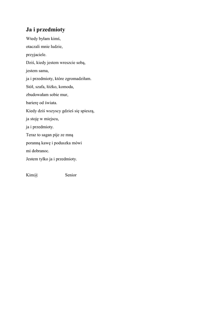Ja i przedmioty Wtedy byłam kimś, otaczali mnie ludzie, przyjaciele. Dziś, kiedy jestem wreszcie sobą, jestem sama, ja i przedmioty, które zgromadziłam. Stół, szafa, łóżko, komoda, zbudowałam sobie mur, barierę od świata. Kiedy dziś wszyscy gdzieś się spieszą, ja stoję w miejscu, ja i przedmioty. Teraz to sagan pije ze mną poranną kawę i poduszka mówi mi dobranoc. Jestem tylko ja i przedmioty. Kim@ Senior