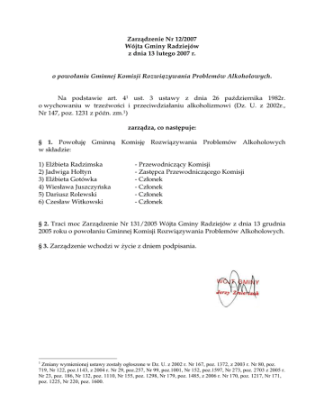 Zarządzenie Nr 12/2007 Wójta Gminy Radziejów z dnia 13 lutego 2007 r. o powołaniu Gminnej Komisji Rozwiązywania Problemów Alkoholowych. Na podstawie art. 41 ust. 3 ustawy z dnia 26 października 1982r. o wychowaniu w trzeźwości i przeciwdziałaniu alkoholizmowi (Dz. U. z 2002r., Nr 147, poz. 1231 z późn. zm.1) zarządza, co następuje: § 1. Powołuję Gminną Komisję Rozwiązywania Problemów Alkoholowych w składzie: 1) Elżbieta Radzimska 2) Jadwiga Hołtyn 3) Elżbieta Gotówka 4) Wiesława Juszczyńska 5) Dariusz Rolewski 6) Czesław Witkowski - Przewodniczący Komisji - Zastępca Przewodniczącego Komisji - Członek - Członek - Członek - Członek § 2. Traci moc Zarządzenie Nr 131/2005 Wójta Gminy Radziejów z dnia 13 grudnia 2005 roku o powołaniu Gminnej Komisji Rozwiązywania Problemów Alkoholowych. § 3. Zarządzenie wchodzi w życie z dniem podpisania. 1 Zmiany wymienionej ustawy zostały ogłoszone w Dz. U. z 2002 r. Nr 167, poz. 1372, z 2003 r. Nr 80, poz. 719, Nr 122, poz.1143, z 2004 r. Nr 29, poz.257, Nr 99, poz.1001, Nr 152, poz.1597, Nr 273, poz. 2703 z 2005 r. Nr 23, poz. 186, Nr 132, poz. 1110, Nr 155, poz. 1298, Nr 179, poz. 1485, z 2006 r. Nr 170, poz. 1217, Nr 171, poz. 1225, Nr 220, poz. 1600.