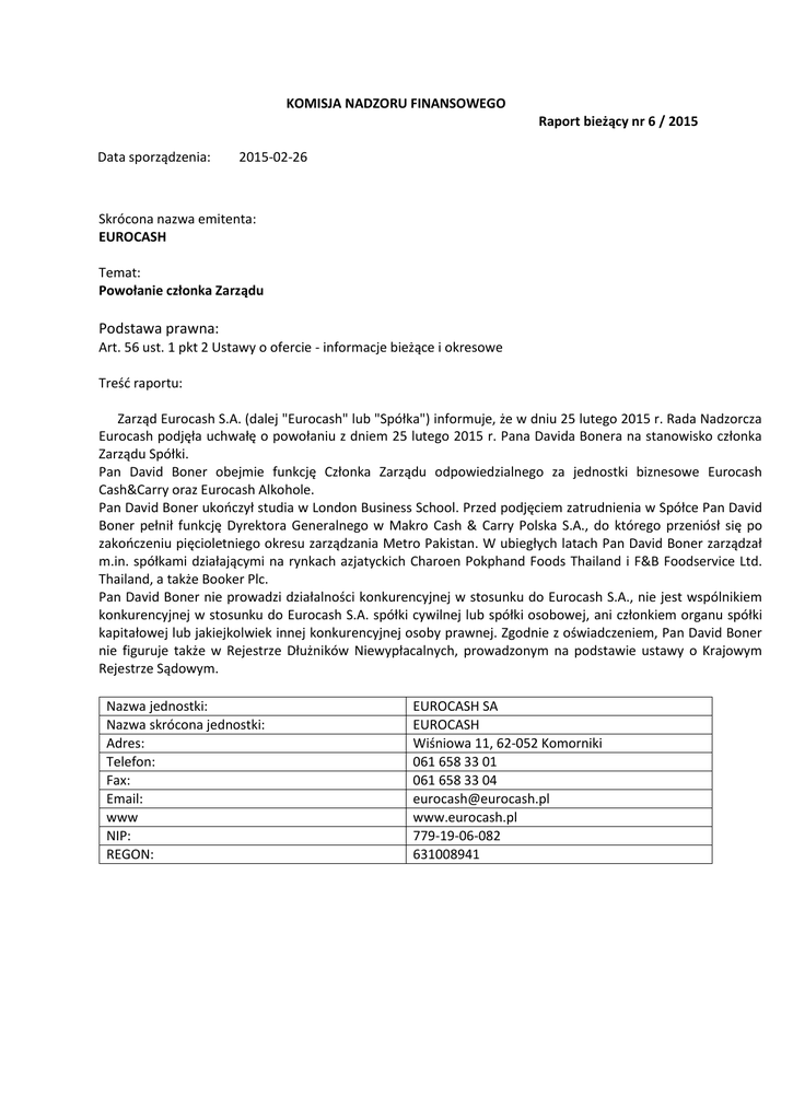 KOMISJA NADZORU FINANSOWEGO Raport bieżący nr 6 / 2015 Data sporządzenia: 2015-02-26 Skrócona nazwa emitenta: EUROCASH Temat: Powołanie członka Zarządu Podstawa prawna: Art. 56 ust. 1 pkt 2 Ustawy o ofercie - informacje bieżące i okresowe Treść raportu: Zarząd Eurocash S.A. (dalej "Eurocash" lub "Spółka") informuje, że w dniu 25 lutego 2015 r. Rada Nadzorcza Eurocash podjęła uchwałę o powołaniu z dniem 25 lutego 2015 r. Pana Davida Bonera na stanowisko członka Zarządu Spółki. Pan David Boner obejmie funkcję Członka Zarządu odpowiedzialnego za jednostki biznesowe Eurocash Cash&Carry oraz Eurocash Alkohole. Pan David Boner ukończył studia w London Business School. Przed podjęciem zatrudnienia w Spółce Pan David Boner pełnił funkcję Dyrektora Generalnego w Makro Cash & Carry Polska S.A., do którego przeniósł się po zakończeniu pięcioletniego okresu zarządzania Metro Pakistan. W ubiegłych latach Pan David Boner zarządzał m.in. spółkami działającymi na rynkach azjatyckich Charoen Pokphand Foods Thailand i F&B Foodservice Ltd. Thailand, a także Booker Plc. Pan David Boner nie prowadzi działalności konkurencyjnej w stosunku do Eurocash S.A., nie jest wspólnikiem konkurencyjnej w stosunku do Eurocash S.A. spółki cywilnej lub spółki osobowej, ani członkiem organu spółki kapitałowej lub jakiejkolwiek innej konkurencyjnej osoby prawnej. Zgodnie z oświadczeniem, Pan David Boner nie figuruje także w Rejestrze Dłużników Niewypłacalnych, prowadzonym na podstawie ustawy o Krajowym Rejestrze Sądowym. Nazwa jednostki: Nazwa skrócona jednostki: Adres: Telefon: Fax: Email: www NIP: REGON: EUROCASH SA EUROCASH Wiśniowa 11, 62-052 Komorniki 061 658 33 01 061 658 33 04 [email protected] www.eurocash.pl 779-19-06-082 631008941 PODPISY OSÓB REPREZENTUJĄCYCH SPÓŁKĘ Data 2014-02-26 2014-02-26 Imię i Nazwisko Jacek Owczarek Arnaldo Guerreiro Stanowisko/Funkcja Członek Zarządu Członek Zarządu Podpis