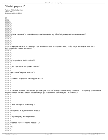 Szkoła Podstawowa w Łęknicy "Kwiat paproci" Autor: Wioletta Szreiber 21.05.2011. Zmieniony 21.05.2011. "Kwiat paproci" - kukiełkowe przedstawienie wg Józefa Ignacego Kraszewskiego. Lalkowy bohater - chłopiec - po wielu trudach zdobywa kwiat, który daje mu bogactwo, lecz jednocześnie stawia warunek: "Kto posiada listki cudne Ten zaprawdę wszystko może, Ale dzielić się nie wolno! Z nikim! Nigdy! W żadnej porze!" Chłopiec spełnia ten nakaz, pozwalając umrzeć w nędzy całej swej rodzinie. Z rozpaczy przemienia się w kamień. Po stu latach odczarowuje go szlachetna dziewczyna. A zatem: "Jeśli szczęścia odrobinę Pragniesz w życiu swoim mieć To pamięta,j nie zapomnij Dobroć serca - ważna rzecz". http://spleknica.info Kreator PDF Utworzono 8 March, 2017, 05:44 Szkoła Podstawowa w Łęknicy Po przedstawieniu odbyły się warsztaty teatralne. Na wstępie aktor zaznajamia dzieci z budową lalek. Potem dzieci odgrywają scenki zadane przez niego. Na koniec uczniowie sami tworzą etiudy teatralne. Przepiękne lalki wspaniale ich inspirują i pozwalają przeżyć wiele interesujących i śmiesznych scen. http://spleknica.info Kreator PDF Utworzono 8 March, 2017, 05:44 Szkoła Podstawowa w Łęknicy http://spleknica.info Kreator PDF Utworzono 8 March, 2017, 05:44