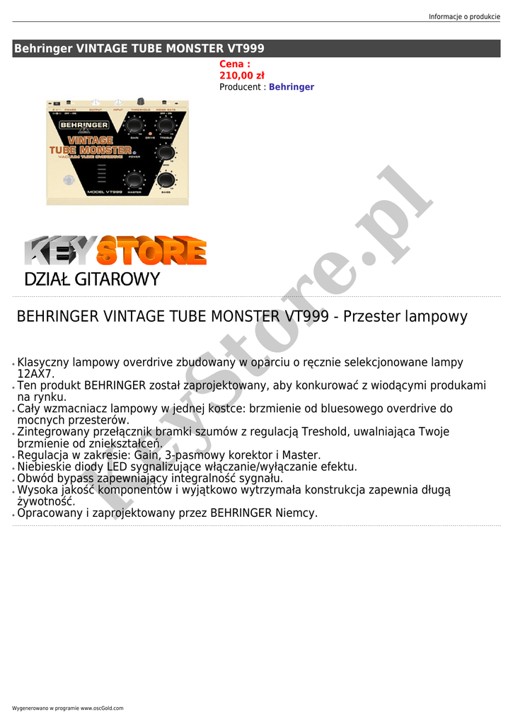 Informacje o produkcie Behringer VINTAGE TUBE MONSTER VT999 Cena : 210,00 zł or e. pl Producent : Behringer BEHRINGER VINTAGE TUBE MONSTER VT999 - Przester lampowy ● ● ● ● ● ● St ● ey ● Klasyczny lampowy overdrive zbudowany w oparciu o ręcznie selekcjonowane lampy 12AX7. Ten produkt BEHRINGER został zaprojektowany, aby konkurować z wiodącymi produkami na rynku. Cały wzmacniacz lampowy w jednej kostce: brzmienie od bluesowego overdrive do mocnych przesterów. Zintegrowany przełącznik bramki szumów z regulacją Treshold, uwalniająca Twoje brzmienie od zniekształceń. Regulacja w zakresie: Gain, 3-pasmowy korektor i Master. Niebieskie diody LED sygnalizujące włączanie/wyłączanie efektu. Obwód bypass zapewniający integralność sygnału. Wysoka jakość komponentów i wyjątkowo wytrzymała konstrukcja zapewnia długą żywotność. Opracowany i zaprojektowany przez BEHRINGER Niemcy. K ● Wygenerowano w programie www.oscGold.com