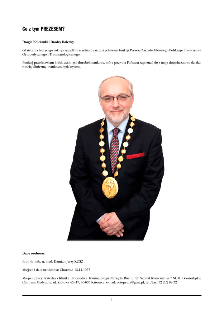 Co z tym PREZESEM? Drogie Koleżanki i Drodzy Koledzy, od stycznia bieżącego roku przypadł mi w udziale zaszczyt pełnienia funkcji Prezesa Zarządu Głównego Polskiego Towarzystwa Ortopedycznego i Traumatologicznego. Poniżej przedstawiam krótki życiorys i dorobek naukowy, które pozwolą Państwu zapoznać się z moją dotychczasową działalnością kliniczną i naukowo-dydaktyczną. Dane osobowe: Prof. dr hab. n. med. Damian Jerzy KUSZ Miejsce i data urodzenia: Chorzów, 13.11.1957 Miejsce pracy: Katedra i Klinika Ortopedii i Traumatologii Narządu Ruchu, SP Szpital Kliniczny nr 7 SUM, Górnośląskie Centrum Medyczne, ul. Ziołowa 45/47, 40-635 Katowice; e-mail: [email protected], tel./fax: 32 202 99 32 I Wykształcenie: 28.06.1982 – dyplom lekarza (Śląska Akademia Medyczna w Katowicach) 20.11.1985 – pierwszy stopień specjalizacji z ortopedii i traumatologii 05.04.1990 – drugi stopień specjalizacji z ortopedii i traumatologii 27.02.1992 – doktor nauk medycznych – ŚlAM – „Porównawcza ocena wyników leczenia operacyjnego wrodzonego zwichnięcia stawu biodrowego sposobem Degi oraz Saltera” Promotor: prof. zw. dr hab. n. med. Andrzej Tokarowski 03.12.1998 – doktor habilitowany nauk medycznych – ŚlAM – „Zastosowanie badania densytometrycznego w ocenie wyników endoprotezoplastyk stawu biodrowego z uwzględnieniem komputerowej symulacji rozkładów naprężeń w tkance kostnej okołoprotezowej” 12.01.2012 – tytuł naukowy profesora nauk medycznych Przebieg pracy zawodowej: 16.10.1982–31.07.1984–asystent stażysta i asystent w II Katedrze i Klinice Chirurgii Dziecięcej Wydziału Lekarskiego w Zabrzu ŚlAM 01.08.1984–30.11.2000–asystent, starszy asystent i adiunkt w Katedrze i Klinice Ortopedii Wydziału Lekarskiego w Zabrzu ŚlAM 01.12.2000 do nadal –kierownik Katedry i Kliniki Ortopedii i Traumatologii Narządu Ruchu Wydziału Lekarskiego w Katowicach ŚlAM – SUM (profesor nadzwyczajny SUM) Działalność dydaktyczna: 16.10.1982 do nadal –wykłady i ćwiczenia ze studentami Wydziałów Lekarskiego w Zabrzu i Katowicach, Wydziału Opieki Zdrowotnej oraz studentami amerykańskimi, z Tajwanu i Programu „Erasmus” Prowadzenie kursów szkoleniowych dla ortopedów – traumatologów, m.in. z Indii, Rosji, Ukrainy i Polski Działalność organizacyjna: Przewodniczący Komitetu Organizacyjnego Sympozjów „Koksartroza”, „Biomechanika w implantologii”, „Całkowita endoprotezoplastyka pierwotna i rewizyjna kolana w znacznych deformacjach i destrukcjach stawu” oraz Międzynarodowego Sympozjum Traumatologicznego Przynależność do organizacji naukowych: Polskie Towarzystwo Ortopedyczne i Traumatologiczne, Polish Spine Society, Polskie Towarzystwo Chirurgii Artroskopowej, Polskie Towarzystwo Chirurgii Ręki, European Federation of National Associations of Orthopedics and Traumatology oraz International Society of Orthopaedic Surgery and Traumatology Funkcje dodatkowe: Członek, II i I Wiceprezes Zarządu Głównego Polskiego Towarzystwa Ortopedycznego i Traumatologicznego Wiceprezes Polskiego Towarzystwa Inżynierii Medycznej Przedstawiciel Śląskiego Uniwersytetu Medycznego w Radzie Naukowej Centrum Inżynierii Biomedycznej Politechniki Śląskiej w Gliwicach Członek Komitetu Redakcyjnego czasopism: „Chirurgia Narządów Ruchu i Ortopedia Polska”, „Ortopedia Traumatologia Rehabilitacja”, „Kwartalnik Ortopedyczny”, „Artroskopia i Chirurgia Stawów” oraz „Journal of the American Academy of Orthopaedic Surgeons – Poland Edition” Od 2001 członek bądź przewodniczący Komisji Egzaminacyjnej CEM w Warszawie dla kandydatów na specjalistów z ortopedii i traumatologii Konsultant Wojewódzki z Ortopedii i Traumatologii w latach 2002–2010 II Promotorstwo: Promotor 12 obronionych rozpraw doktorskich i 2 prac magisterskich Ważniejsze wyróżnienia: 1994, 2003, 2009, 2010, 2012 – Nagrody Rektora ŚlAM-SUM 2003 – Nagroda za plakat „Latent periphery deep vein thrombosis after total hip replacement” – VI Kongres EFORT w Helsinkach 2004 – Medal Komisji Edukacji Narodowej za szczególne zasługi dla oświaty i wychowania, przyznany Decyzją Ministra Edukacji Narodowej i Sportu 2005 – Wyróżnienie plakatu “The use of ultrasonographic estimation of humerus heads elevation in the subacromial impingement syndrome” – VII Kongres EFORT w Lizbonie 2006 – Artykuł „Peripheral nerve compression neuropathy after fractures of the distal radius” Redakcja Czasopisma uznała za jedną z 10 najbardziej interesujących prac opublikowanych przez „Journal of Hand Surgery (Br.)” w tym roku, a autorzy zostali zaproszeni do jej przedstawienia w Atenach na Kongresie „European Federation of the Societies for Surgery of the Hand” w 2007, podczas osobnej Sesji, w której prezentowano 10 najlepszych publikacji. 2007 – Brązowy Krzyż Zasługi przyznany przez Prezydenta Rzeczypospolitej Polskiej 2008 – Odznaka Zasłużony dla Śląskiego Uniwersytetu Medycznego w Katowicach 2010 – Order Zasłużony dla Województwa Śląskiego przyznany przez Wojewodę Śląskiego 2011 – Medal za szczególny wkład w rozwój współpracy naukowej ortopedów Polski i Ukrainy, przyznany przez Prezesa PTO i Tr. Stan rodzinny: Żona Ewa – dr n. med., specjalista chorób dziecięcych Synowie Błażej i Marcin – absolwent i student II roku Śląskiego Uniwersytetu Medycznego w Katowicach Dorobek naukowy: Artykuły opublikowane w recenzowanych czasopismach naukowych krajowych i zagranicznych 1. Tokarowski A., Papież M., Kusz D.: Anomalie rozwojowe ścięgien mięśni piszczelowych we wrodzonej stopie końsko-szpotawej. Chir. Narz. Ruchu Ortop. Pol., 1986; 51(5): 398–400 2. Tokarowski A., Kusz D., Berezowski K.: Radiologiczna ocena stawu biodrowego po osteotomii miednicy sposobem Saltera. Chir. Narz. Ruchu Ortop. Pol., 1989; 54(2): 89–92 3. Kusz D., Tokarowski A.: Porównawcza ocena wyników leczenia operacyjnego wrodz