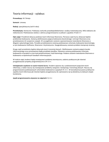Teoria informacji - sylabus: Prowadzący: M. Śmieja Semestr: zimowy Rodzaj: specjalistyczny (od III roku) Prerekwizyty: Konieczne: Podstawy rachunku prawdopodobieństwa i analizy matematycznej. Mile widziane ale niekonieczne: Podstawowa wiedza z zakresu programowania w jednym z języków: R lub C++ Opis zajęć: Przedmiot dotyczy podstaw teorii informacji Shannona. Pierwsza część kursu dotyczyć będzie problemów kodowania. Zostaną zdefiniowane pojęcia kodowania bezstratnego i entropii Shannona oraz przedstawione ich wzajemne związki. W szczególności zostanie zaprezentowane twierdzenie Shannona o długości optymalnego kodu. Ponadto przedstawione zostaną podstawowe schematy kodowania bezstratnego, w tym kodowanie Huffmana, Shannona i Arytmetyczne. Zasygnalizowany zostanie problem kompresji stratnej. Druga część przedmiotu będzie dotyczyła teorii transmisji danych. Zdefiniowane zostanie pojęcie kanału informacyjnego oraz przestawione będę przykłady kanałów. Pokazane zostaną podstawowe schematy kodowania w kanałach w tym kod powtórzeniowy i kod Hamminga. Podane zostanie twierdzenie Shannona o kodowaniu w dyskretnych kanałach informacyjnych. W trakcie zajęć studenci będą rozwiązywać problemy teoretyczne, zadania praktyczne jak również przygotowywać projekty programistyczne w R i C++. Umiejętności uzyskane w czasie trwania kursu: Student zapozna się z podstawowymi pojęciami teorii informacji, a także nauczy się rozwiązywać problemy związane z kompresją i transmisją danych. Nauczy się programowania podstawowych schematów kodowania w językach R i C++. W konsekwencji pozna praktyczne aspekty teorii informacji jak również będzie przygotowany do zajmowania się tą dziedziną na dalszym etapie kształcenia. Języki programowania używane na zajęciach: R, C++