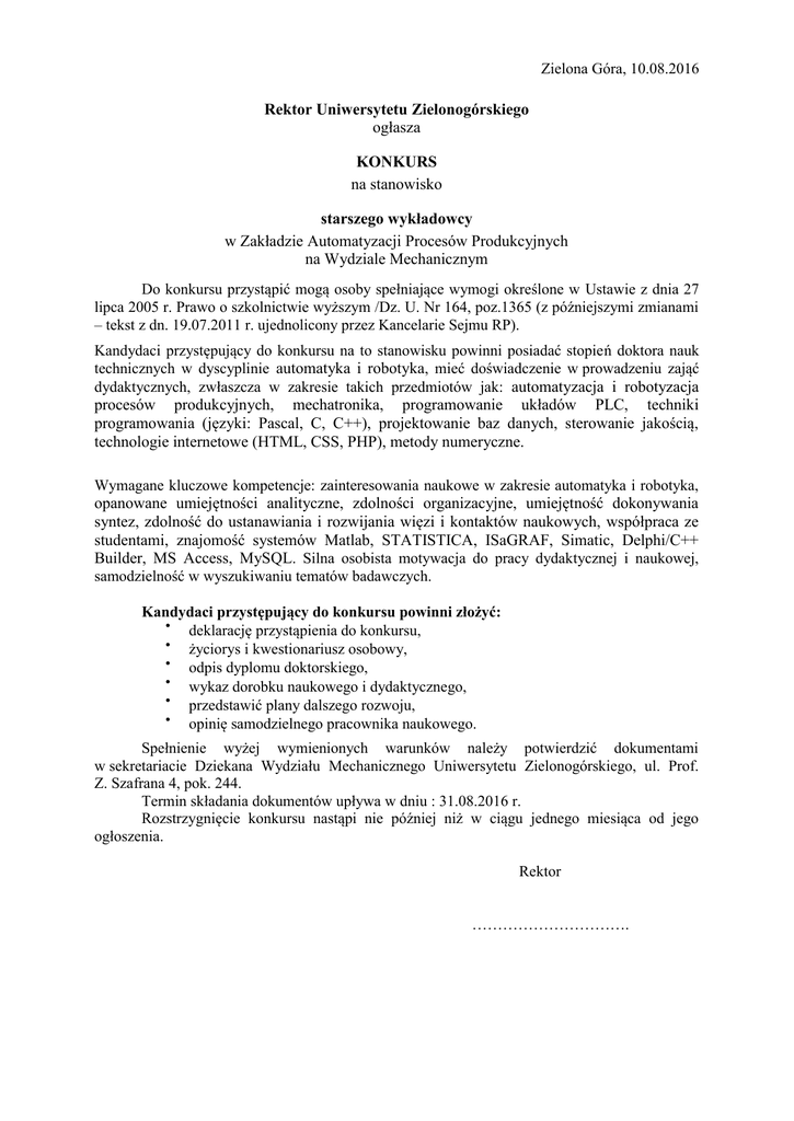 Zielona Góra, 10.08.2016 Rektor Uniwersytetu Zielonogórskiego ogłasza KONKURS na stanowisko starszego wykładowcy w Zakładzie Automatyzacji Procesów Produkcyjnych na Wydziale Mechanicznym Do konkursu przystąpić mogą osoby spełniające wymogi określone w Ustawie z dnia 27 lipca 2005 r. Prawo o szkolnictwie wyższym /Dz. U. Nr 164, poz.1365 (z późniejszymi zmianami – tekst z dn. 19.07.2011 r. ujednolicony przez Kancelarie Sejmu RP). Kandydaci przystępujący do konkursu na to stanowisku powinni posiadać stopień doktora nauk technicznych w dyscyplinie automatyka i robotyka, mieć doświadczenie w prowadzeniu zająć dydaktycznych, zwłaszcza w zakresie takich przedmiotów jak: automatyzacja i robotyzacja procesów produkcyjnych, mechatronika, programowanie układów PLC, techniki programowania (języki: Pascal, C, C++), projektowanie baz danych, sterowanie jakością, technologie internetowe (HTML, CSS, PHP), metody numeryczne. Wymagane kluczowe kompetencje: zainteresowania naukowe w zakresie automatyka i robotyka, opanowane umiejętności analityczne, zdolności organizacyjne, umiejętność dokonywania syntez, zdolność do ustanawiania i rozwijania więzi i kontaktów naukowych, współpraca ze studentami, znajomość systemów Matlab, STATISTICA, ISaGRAF, Simatic, Delphi/C++ Builder, MS Access, MySQL. Silna osobista motywacja do pracy dydaktycznej i naukowej, samodzielność w wyszukiwaniu tematów badawczych. Kandydaci przystępujący do konkursu powinni złożyć: deklarację przystąpienia do konkursu, życiorys i kwestionariusz osobowy, odpis dyplomu doktorskiego, wykaz dorobku naukowego i dydaktycznego, przedstawić plany dalszego rozwoju, opinię samodzielnego pracownika naukowego. Spełnienie wyżej wymienionych warunków należy potwierdzić dokumentami w sekretariacie Dziekana Wydziału Mechanicznego Uniwersytetu Zielonogórskiego, ul. Prof. Z. Szafrana 4, pok. 244. Termin składania dokumentów upływa w dniu : 31.08.2016 r. Rozstrzygnięcie konkursu nastąpi nie później niż w ciągu jednego miesiąca od jego ogłoszenia. Rektor ………………………….