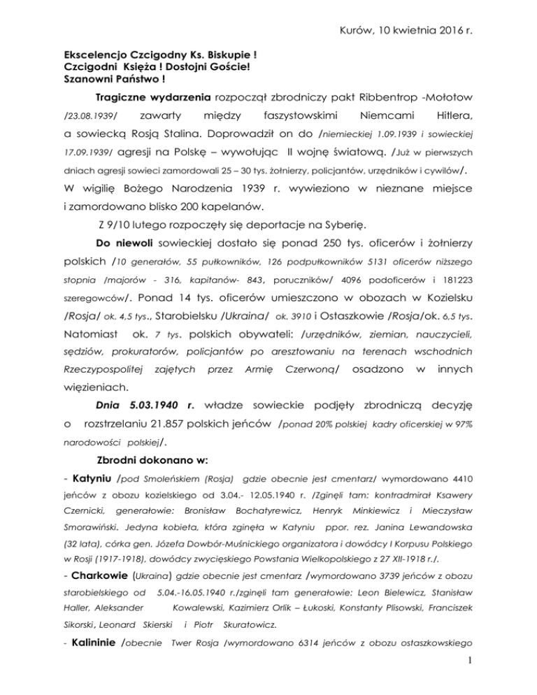 Kurów, 10 kwietnia 2016 r. Ekscelencjo Czcigodny Ks. Biskupie ! Czcigodni Księża ! Dostojni Goście! Szanowni Państwo ! Tragiczne wydarzenia rozpoczął zbrodniczy pakt Ribbentrop -Mołotow /23.08.1939/ zawarty między faszystowskimi Niemcami Hitlera, a sowiecką Rosją Stalina. Doprowadził on do /niemieckiej 1.09.1939 i sowieckiej 17.09.1939/ agresji na Polskę – wywołując II wojnę światową. /Już w pierwszych dniach agresji sowieci zamordowali 25 – 30 tys. żołnierzy, policjantów, urzędników i cywilów /. W wigilię Bożego Narodzenia 1939 r. wywieziono w nieznane miejsce i zamordowano blisko 200 kapelanów. Z 9/10 lutego rozpoczęły się deportacje na Syberię. Do niewoli sowieckiej dostało się ponad 250 tys. oficerów i żołnierzy polskich /10 generałów, 55 pułkowników, 126 podpułkowników 5131 oficerów niższego stopnia /majorów - 316, kapitanów- 843, poruczników/ 4096 podoficerów i 181223 szeregowców/. Ponad 14 tys. oficerów umieszczono w obozach w Kozielsku /Rosja/ ok. 4,5 tys., Starobielsku /Ukraina/ ok. 3910 i Ostaszkowie /Rosja/ok. 6,5 tys. Natomiast ok. 7 tys. polskich obywateli: /urzędników, ziemian, nauczycieli, sędziów, prokuratorów, policjantów po aresztowaniu na terenach wschodnich Rzeczypospolitej zajętych przez Armię Czerwoną/ osadzono w innych więzieniach. Dnia 5.03.1940 r. władze sowieckie podjęły zbrodniczą decyzję o rozstrzelaniu 21.857 polskich jeńców /ponad 20% polskiej kadry oficerskiej w 97% narodowości polskiej/. Zbrodni dokonano w: - Katyniu /pod Smoleńskiem (Rosja) gdzie obecnie jest cmentarz/ wymordowano 4410 jeńców z obozu kozielskiego od 3.04.- 12.05.1940 r. /Zginęli tam: kontradmirał Ksawery Czernicki, generałowie: Bronisław Bochatyrewicz, Henryk Smorawiński. Jedyna kobieta, która zginęła w Katyniu Minkiewicz i Mieczysław ppor. rez. Janina Lewandowska (32 lata), córka gen. Józefa Dowbór-Muśnickiego organizatora i dowódcy I Korpusu Polskiego w Rosji (1917-1918), dowódcy zwycięskiego Powstania Wielkopolskiego z 27 XII-1918 r./. - Charkowie (Ukraina) gdzie obecnie jest cmentarz /wymordowano 3739 jeńców z obozu starobielskiego od 5.04.-16.05.1940 r./zginęli tam generałowie: Leon Bielewicz, Stanisław Haller, Aleksander Kowalewski, Kazimierz Orlik – Łukoski, Konstanty Plisowski, Franciszek Sikorski, Leonard Skierski - i Piotr Skuratowicz. Kalininie /obecnie Twer Rosja /wymordowano 6314 jeńców z obozu ostaszkowskiego 1 od 4.04.-16.05.1940 r./ Policjantów, żołnierzy Korpusu Ochrony Pogranicza, Żandarmerii Wojskowej, Służby Więziennej, oficerów wywiadu i kontrwywiadu. Ich cmentarz jest w Miednoje. Rozstrzelania uniknęło 258 oficerów wytypowanych na podstawie różnych kryteriów. /Tych o sympatiach komunistycznych np. płk. Zygmunt Berling. Oszczędzono tez niektórych specjalistów np. prof. Stanisław Świaniewicz z Wilna. Ekspert od gospodarki sowieckiej i niemieckiej. Władysław Anders z uwagi na to, że był znanym generałem niemal od razu trafił do więzienia Łubianka w Moskwie. Tam doczekał się porozumienia Sikorski-Majski W lipcu 1941 r. i został dowódcą armii polskiej ZSRR/. Mordowano ich w więzieniach lub nad grobami, strzałem w tył głowy bez sądu /profesorów, i wyroku, lekarzy, kapelanów /24/ i oficerów prawników, innych wyznań /6/ WP, inżynierów, policjantów, nauczycieli, oficerów artystów, rez. urzędników, - elitę narodu polskiego. Stawiającym opór wiązano ręce sznurem, często oplatając nim szyję ofiary i zarzucając płaszcz. Ciała niektórych ofiar nosiły ślady przekłuć bagnetem. Zniknięcie tysięcy oficerów polskich usiłował wyjaśnić w czasie pobytu w Moskwie w grudniu 1941 r. premier i wódz naczelny Władysław Sikorski. /Stalin cynicznie wówczas wyjaśnił, że uciekli z obozów do Mandżurii/. Była to najohydniejsza zbrodnia na bezbronnych jeńcach wojennych w dziejach nowożytnej Europy. Z 12/13.04.1940 r. deportowano do Kazachstanu 320 tys. członków ich rodzin. Hitler i jego potworne zbrodnie zostały osądzone i potępione. Stalin winien pozostaje nadal śmierci milionów ofiar w tym setek tysięcy Polaków bezkarny. Spośród 5 mln obywateli, których straciła Polska podczas II wojny światowej o tych z Katynia nawet nie wolno było pamiętać. Federacjo Rosyjska, zgodnie z prawem międzynarodowym następco prawny Rosji Sowieckiej, której funkcjonariusze dokonali tej zbrodni: - kiedy uznasz, że zbrodnia katyńska to ludobójstwo, które się nie przedawnia, a nie zwykła zbrodnia kryminalna, która ulega przedawnieniu, - kiedy odtajnisz akta prokuratorsko - sądowe tej sprawy, - kiedy wskażesz winnych tej zbrodni, - kiedy potwierdzisz prawnie niewinność ofiar, - kiedy powiesz zwykłe słowo przepraszam. 2 Od soboty 10.04.2010 r. Katyń symbolizuje również katastrofę lotniczą pod Smoleńskiem. Ten niedokończony lot przypomniał ponownie światu o zbrodni katyńskiej. Pamiętamy o najlepszych Synach Narodu Polskiego poległych i pomordowanych na „Wschodzie” na „nieludzkiej ziemi” na terenie Związku Sowieckiego: - ofiarach rzezi wołyńskiej, polskich dworów i zaścianków z lat 1917-1919, przejmująco opisanej w debiutanckiej autobiograficznej powieści „Pożoga” Zofii Kossak – Szczuckiej urodzonej w pobliskim Kośminie gm. Żyrzyn. - ofiarach operacji antykułackiej z lat 1930-1931 i „Wielkiego Głodu” z lat 1932 – 1933 na Ukrainie i w Kazachstanie, wśród których byli również Polacy. - ofiarach eksterminacji Polaków z lat 1937-1938 kiedy zostało aresztowanych i rozstrzelanych 111 tys. naszych rodaków – pięć razy więcej niż w Katyniu oraz mniej więcej tyle ile w Oświęcimiu. - ofiarach czterech deportacji z Kresów Wschodnich Rzeczypospolitej /10 luty 1940 r. ok. 220 tys. osób, 13 kwietnia 1940 r. 320 tys. osób, czerwiec/lipiec 1940 r. ok. 240 tys. osób, czerwiec 1941 r. ok. 300 tys. osób. Razem ponad 1 mln na Sybir i do Kazachstanu. Około 400 tys. po