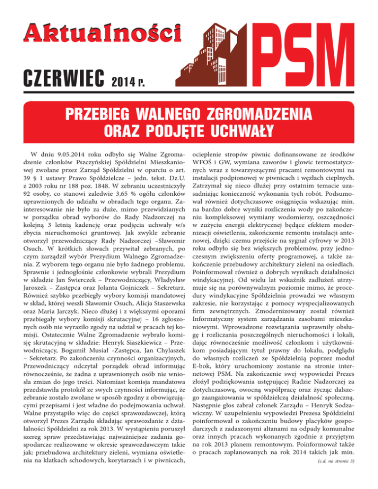 CZERWIEC 2014 r. Przebieg Walnego Zgromadzenia oraz podjęte uchwały W dniu 9.05.2014 roku odbyło się Walne Zgromadzenie członków Pszczyńskiej Spółdzielni Mieszkaniowej zwołane przez Zarząd Spółdzielni w oparciu o art. 39 § 1 ustawy Prawo Spółdzielcze – jedn. tekst. Dz.U. z 2003 roku nr 188 poz. 1848. W zebraniu uczestniczyły 92 osoby, co stanowi zaledwie 3,65 % ogółu członków uprawnionych do udziału w obradach tego organu. Zainteresowanie nie było za duże, mimo przewidzianych w porządku obrad wyborów do Rady Nadzorczej na kolejną 3 letnią kadencję oraz podjęcia uchwały w/s zbycia nieruchomości gruntowej. Jak zwykle zebranie otworzył przewodniczący Rady Nadzorczej –Sławomir Osuch. W krótkich słowach przywitał zebranych, po czym zarządził wybór Prezydium Walnego Zgromadzenia. Z wyborem tego organu nie było żadnego problemu. Sprawnie i jednogłośnie członkowie wybrali Prezydium w składzie Jan Świerczek – Przewodniczący, Władysław Jaroszek – Zastępca oraz Jolanta Gojniczek – Sekretarz. Również szybko przebiegły wybory komisji mandatowej w skład, której weszli Sławomir Osuch, Alicja Staszewska oraz Maria Jarczyk. Nieco dłużej i z większymi oporami przebiegały wybory komisji skrutacyjnej – 16 zgłoszonych osób nie wyraziło zgody na udział w pracach tej komisji. Ostatecznie Walne Zgromadzenie wybrało komisję skrutacyjną w składzie: Henryk Siaszkiewicz – Przewodniczący, Bogumił Musiał -Zastępca, Jan Chylaszek – Sekretarz. Po zakończeniu czynności organizacyjnych, Przewodniczący odczytał porządek obrad informując równocześnie, że żadna z uprawnionych osób nie wniosła zmian do jego treści. Natomiast komisja mandatowa przedstawiła protokół ze swych czynności informując, że zebranie zostało zwołane w sposób zgodny z obowiązującymi przepisami i jest władne do podejmowania uchwał. Walne przystąpiło więc do części sprawozdawczej, którą otworzył Prezes Zarządu składając sprawozdanie z działalności Spółdzielni za rok 2013. W wystąpieniu poruszył szereg spraw przedstawiając najważniejsze zadania gospodarcze realizowane w okresie sprawozdawczym takie jak: przebudowa architektury zieleni, wymiana oświetlenia na klatkach schodowych, korytarzach i w piwnicach, ocieplenie stropów piwnic dofinansowane ze środków WFOŚ i GW, wymiana zaworów i głowic termostatycznych wraz z towarzyszącymi pracami remontowymi na instalacji podpionowej w piwnicach i węzłach cieplnych. Zatrzymał się nieco dłużej przy ostatnim temacie uzasadniając konieczność wykonania tych robót. Podsumował również dotychczasowe osiągnięcia wskazując min. na bardzo dobre wyniki rozliczenia wody po zakończeniu kompleksowej wymiany wodomierzy, oszczędności w zużyciu energii elektrycznej będące efektem modernizacji oświetlenia, zakończenie remontu instalacji antenowej, dzięki czemu przejście na sygnał cyfrowy w 2013 roku odbyło się bez większych problemów, przy jednoczesnym zwiększeniu oferty programowej, a także zakończenie przebudowy architektury zieleni na osiedlach. Poinformował również o dobrych wynikach działalności windykacyjnej. Od wielu lat wskaźnik zadłużeń utrzymuje się na porównywalnym poziomie mimo, że procedury windykacyjne Spółdzielnia prowadzi we własnym zakresie, nie korzystając z pomocy wyspecjalizowanych firm zewnętrznych. Zmodernizowany został również Informatyczny system zarządzania zasobami mieszkaniowymi. Wprowadzone rozwiązania usprawniły obsługę i rozliczania poszczególnych nieruchomości i lokali, dając równocześnie możliwość członkom i użytkownikom posiadającym tytuł prawny do lokalu, podglądu do własnych rozliczeń ze Spółdzielnią poprzez moduł E-bok, który uruchomiony zostanie na stronie internetowej PSM. Na zakończenie swej wypowiedzi Prezes złożył podziękowania ustępującej Radzie Nadzorczej za dotychczasową, owocną współpracę oraz życząc dalszego zaangażowania w spółdzielczą działalność społeczną. Następnie głos zabrał członek Zarządu – Henryk Sodzawiczny. W uzupełnieniu wypowiedzi Prezesa Spółdzielni poinformował o zakończeniu budowy placyków gospodarczych z zadaszonymi altanami na odpady komunalne oraz innych pracach wykonanych zgodnie z przyjętym na rok 2013 planem remontowym. Poinformował także o pracach zaplanowanych na rok 2014 takich jak min. (c.d. na stronie 3) Bezpieczne mieszkanie – spokojne wakacje! Rozpoczął się czas wakacyjnych wyjazdów urlopowych. Dla jednych jest to okres wypoczynku, dla innych większe możliwości kradzieży cudzego mienia. Mieszkanie pozostawione bez opieki i często niedostatecznie zabezpieczone staje się łatwym łupem. Co należy zrobić by ustrzec mieszkanie przez włamaniem, kradzieżą, a także innymi zdarzeniami losowymi. Po pierwsze należy wybrać dobrą i sprawdzoną firmę ubezpieczeniową, która w razie nieszczęścia bez większych problemów zrekompensuje nam poniesione straty. Po drugie przed złodziejami mogą nas ustrzec solidne drzwi wejściowe z równie solidnymi zamkami i blokadą antywyważeniową. Często w naszej gazetce apelujemy o zachowanie dobrosąsiedzkich stosunków. W atmosferze zgody, wzajemnego poszanowania i zaufania nie tylko żyje się lepiej na co dzień, ale również w czasie naszego wyjazdu, uwaga i czujność sąsiada może skutecznie wypłoszyć złodzieja i ustrzec mieszkanie przez kradzieżą. Dlatego warto wyjeżdżając na urlop powierzyć mieszkanie zaufanemu sąsiadowi lub zaprzyjaźnionej osobie, która nie tylko opróżni skrzynkę pocztową, podleje kwiaty, ale może również wieczorem zapalić światło stwarzając pozory przebywania w mieszkaniu. Wreszcie czynności, o których nie można zapomnieć opuszczając mieszkanie, w przeciwnym bowiem razie narażamy wszystkich mieszkańców budynku na niebezpieczeństwo pożaru lub wybuchu gazu. Przed wyniesieniem z mieszkania ostat