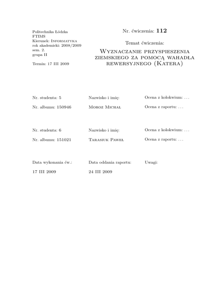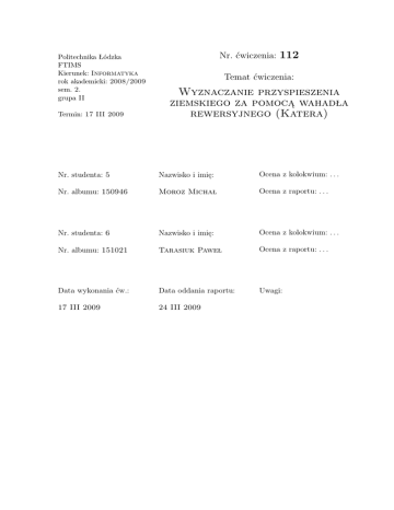 Politechnika Łódzka FTIMS Kierunek: Informatyka rok akademicki: 2008/2009 sem. 2. grupa II Termin: 17 III 2009 Nr. ćwiczenia: 112 Temat ćwiczenia: Wyznaczanie przyspieszenia ziemskiego za pomocą wahadła rewersyjnego (Katera) Nr. studenta: 5 Nazwisko i imię: Ocena z kolokwium: . . . Nr. albumu: 150946 Moroz Michał Ocena z raportu: . . . Nr. studenta: 6 Nazwisko i imię: Ocena z kolokwium: . . . Nr. albumu: 151021 Tarasiuk Paweł Ocena z raportu: . . . Data wykonania ćw.: Data oddania raportu: Uwagi: 17 III 2009 24 III 2009 Streszczenie Sprawozdanie z ćwiczenia, którego celem jest wyznaczenie przyspieszenia ziemskiego za pomocą wahadła rewersyjnego. Przedstawiono opis zastosowanej metody, wyniki wykonanych pomiarów, poparte wykresem obliczenia wraz z rachunkiem błędów oraz wnioski. Opis metody W celu przeprowadzenia pomiarów użyto dwuosiowego wahadła fizycznego z nieruchomą masą umieszczoną za jedną z osi (O1 ), oraz drugiej, takiej samej masy, o regulowanym położeniu na ramieniu wahadła. W celu przybliżonego dopasowania odległości przesuwanej masy od osi O1 wykorzystano rysy na ramieniu wahadła, po czym pomiar był weryfikowany za pomocą przymiaru liniowego. Regulacja położenia ruchomej masy odbywała się na odcinku między osią O1 a O2 . Zasadą pomiaru było mierzenie wartości określonej liczby okresów poziomych drgań wahadła za pomocą stopera. Dla każdej pozycji ruchomej masy wykonywano pomiary dla obu osi zawieszenia wahadła. Uzyskane dane pomiarowe służą wyznaczeniu dwóch takich odległości między ruchomą masą a O1 , dla których okresy drgań są jednakowe dla obu osi. Dla obu tych odległości okres drgań powinien mieć tą samą wartość T , pozwalającą oszacować przyspieszenie ziemskie 2 ze wzoru g = 4πT 2lzr , gdzie lzr to długość zredukowana wahadła. Za pomocą specjalnego przymiaru liniowego dokonany został także pomiar długości zredukowanej wahadła, czyli odległości między O1 a O2 . Michał Moroz i Paweł Tarasiuk, ćw. 112 2/5 Wyniki pomiaru Zmierzone czasy n = 20 okresów drgań dla każdej z osi (t1 dla osi O1 oraz t2 dla O2 ) oraz dla zbadanych x (odległości ruchomej masy od osi O1 ) wynoszą odpowiednio: nr. 1 2 3 4 5 6 7 8 9 10 11 12 13 14 15 16 17 18 19 20 21 22 23 24 25 26 x [m] 0, 032 0, 043 0, 055 0, 066 0, 075 0, 085 0, 096 0, 105 0, 115 0, 125 0, 135 0, 145 0, 155 0, 175 0, 195 0, 215 0, 235 0, 256 0, 275 0, 295 0, 315 0, 326 0, 335 0, 345 0, 356 0, 365 t1 [s] 25, 5 25, 5 25, 3 25, 1 25, 1 24, 9 24, 8 24, 7 24, 8 24, 6 24, 5 24, 5 24, 4 24, 3 24, 3 24, 3 24, 2 24, 3 24, 3 24, 4 24, 6 24, 7 25, 0 25, 0 25, 3 25, 4 t2 [s] 25, 3 24, 0 22, 8 21, 2 21, 3 21, 1 20, 7 20, 7 20, 5 20, 3 20, 3 20, 4 20, 5 20, 7 21, 2 21, 5 21, 9 22, 5 22, 9 23, 4 24, 1 24, 3 24, 5 24, 8 25, 1 25, 3 Pomiar długości zredukowanej wahadła dał natomiast wynik: lzr = 0, 400 ± 0, 001 m Zamieszczony poniżej wykres przedstawia zależność czasu dwudziestu okresów od odległości x dla każdej z osi. Znajdują się na nim punkty pomiarowe dla osi O1 i O2 oraz dopasowane do tych punktów krzywe: odpowiednio t1 (x) i t2 (x). Michał Moroz i Paweł Tarasiuk, ćw. 112 3/5 26 25 t [s] 24 23 22 21 20 t1(x) t2(x) 5 10 15 20 25 30 35 40 x [cm] Odczytuję z wykresu rzędne punktów przecięcia krzywych (tA dla xA ≈ 0, 0312 m oraz tB dla xB ≈ 0, 3736 m): tA ≈ 25, 60 s tB ≈ 25, 59 s Obliczenia Obliczam okres T potrzebny do wyznaczenia przyspieszenia ziemskiego: T = tA + tB ≈ 1, 28 s 2·n Oraz wynikającą z niego wartość przyspieszenia ziemskiego (korzystając ze zmierzonego wcześniej lzr ): g= Michał Moroz i Paweł Tarasiuk, ćw. 112 4π 2 lzr m ≈ 9, 64 2 2 T s 4/5 B| . Zgodnie ze wzorem pozwalającym oszacować błąd wielkości złożoPrzyjmuję ∆T = |tA −t 2 nej na podstawie błędów cząstkowych, otrzymuję: ∆g = g ∆lzr 2∆T + lzr T ≈ 0, 03 m s2 Ostatecznie z przeprowadzonych pomiarów wynika wartość: g = 9, 64 ± 0, 03 m s2 Wnioski Tablicowa wartość przyspieszenia ziemskiego, która wynosi 9, 80665 m s2 , nie znalazła się w granicach wskazanej wartości z błędem. Trudno jednakże uważać to za niepowodzenie doświadczenia - otrzymanie wyniku o zaledwie 2% mniejszego od rzeczywistej wartości to bardzo dobry rezultat jak na warunki laboratoryjne. Największym problemem jest zatem niedoszacowanie błędu jakim obciążony jest wynik doświadczenia - jest to skutek przypadkowej zgodności wartości rzędnych dwóch punktów przecięcia krzywych. Przy tej samej dokładności pomiarów różnica |tA −tB | mogła być większa, skutkując większymi ∆T oraz ∆g - tak aby końcowy wynik obliczeń wskazywał na większy zakres prawdopodobnych wartości. Metodę pomiaru przyspieszenia ziemskiego zdecydowanie należy uznać za skuteczną - prosta postać wzorów końcowych pozwala na minimalizację nakładania się błędów z pomiarów bezpośrednich. Jako potencjalne źródło błędów należy wyróżnić czas reakcji na upłynięcie odpowiedniej liczby okresów drgań wahadła, który mógł mieć wpływ na wyniki pomiarów stoperem (stoper był włączany i wyłączany ręcznie, zatem niedokładność ludzkich zmysłów może mieć znaczenie). Długie ramię wahadła pozwoliło ograniczyć pomiary do badania wychyleń mniejszych niż 7 ◦ . Siły tarcia zauważalnie skracały tor ruchu wahadła, jednakże nie powinno mieć to istotnego wpływu na czas pomiędzy jego maksymalnymi wychyleniami. Siła Coriolisa także jest o kilka rzędów wielkości zbyt mała, aby mogła wpłynąć na aparaturę pomiarową. Bibliografia • Praca zbiorowa pod red. Grzegorza Derfla, Instrukcje do ćwiczeń i Pracowni Fizycznej, Instytut Fizyki Politechniki Łódzkiej, Łódź 1998 • David Halliday, Robert Resnick, Jearl Walker, Podstawy fizyki T. 2., Wydawnictwo Naukowe PWN, Warszawa 2005 • Fundamental Physical Constants from National Institute of Standards and Technology (http://physics.nist.gov/cuu/Co