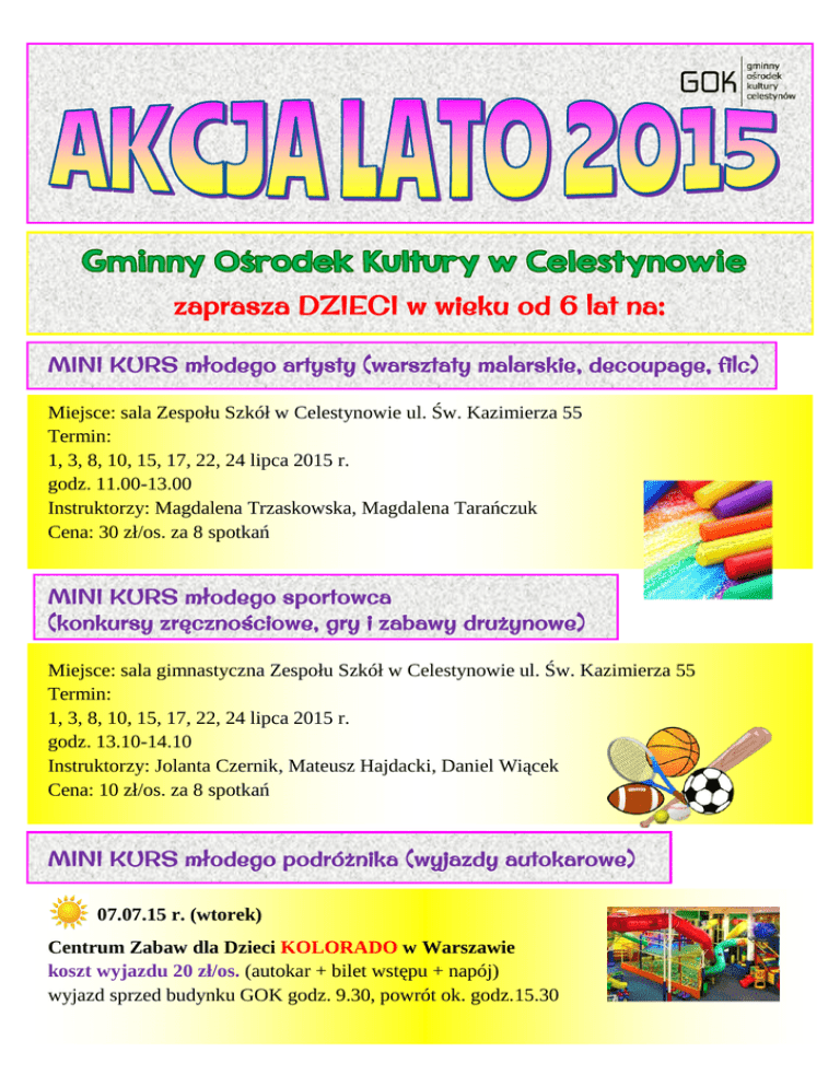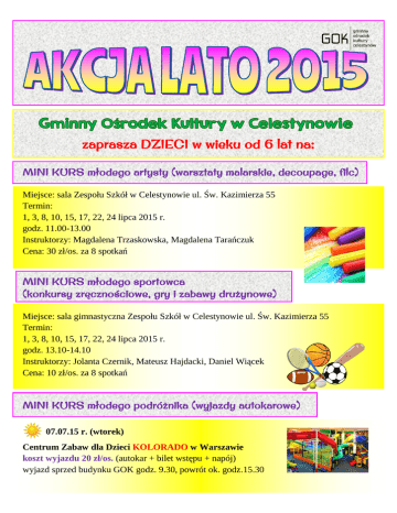 zaprasza DZIECI w wieku od 6 lat na: MINI KURS młodego artysty (warsztaty malarskie, decoupage, filc) Miejsce: sala Zespołu Szkół w Celestynowie ul. Św. Kazimierza 55 Termin: 1, 3, 8, 10, 15, 17, 22, 24 lipca 2015 r. godz. 11.00-13.00 Instruktorzy: Magdalena Trzaskowska, Magdalena Tarańczuk Cena: 30 zł/os. za 8 spotkań MINI KURS młodego sportowca (konkursy zręcznościowe, gry i zabawy drużynowe) Miejsce: sala gimnastyczna Zespołu Szkół w Celestynowie ul. Św. Kazimierza 55 Termin: 1, 3, 8, 10, 15, 17, 22, 24 lipca 2015 r. godz. 13.10-14.10 Instruktorzy: Jolanta Czernik, Mateusz Hajdacki, Daniel Wiącek Cena: 10 zł/os. za 8 spotkań MINI KURS młodego podróżnika (wyjazdy autokarowe) 07.07.15 r. (wtorek) Centrum Zabaw dla Dzieci KOLORADO w Warszawie koszt wyjazdu 20 zł/os. (autokar + bilet wstępu + napój) wyjazd sprzed budynku GOK godz. 9.30, powrót ok. godz.15.30 09.07.15 r. (czwartek) Stadion Narodowy w Warszawie: trasa ekskluzywna (zwiedzanie szatni, ławek zawodników, loży VIP, trasy piłkarza, trybun, punktu widokowego) koszt wyjazdu 20 zł/os. (autokar + bilet wstępu + przewodnik) wyjazd sprzed budynku GOK godz. 9.45, powrót ok. godz. 14.00 14.07.15 r. (wtorek) Kino Cinema City Sadyba w Warszawie Film animowany 2D pt. „W głowie się nie mieści” Premiera: 1 lipca 2015 r. koszt wyjazdu 20 zł/os. (autokar + bilet wstępu) wyjazd sprzed budynku GOK godz. 10.30, powrót ok. godz. 15.00 16.07.15 r. (czwartek) - Pijalnia Czekolady E. Wedel w Warszawie Warsztaty czekoladowe: dekorowanie Torcika Wedlowskiego, degustacja mlecznej czekolady z bitą śmietaną - Państwowe Muzeum Archeologiczne w Warszawie – zwiedzanie ekspozycji z przewodnikiem koszt wyjazdu 35 zł/os. (autokar + bilety wstępu + przewodnik + warsztaty czekoladowe) wyjazd sprzed budynku GOK godz. 10.00, powrót ok. godz. 15.00 21.07.15 r. (wtorek) Gospodarstwo Agroturystyczne w ZOFININIE „Od ziarenka do bochenka” W programie: - zwiedzanie gospodarstwa: zwierzęta hodowlane, maszyny oraz urządzenia rolnicze, - gry i zabawy: przejażdżka wozem, skoki na trampolinach, warzywne wyścigi, układnie rolniczych puzzli, słomiany labirynt, itp. - ognisko koszt wyjazdu 35 zł/os. (autokar + bilet wstępu + kiełbaska + pieczywo) wyjazd sprzed budynku GOK godz. 8.30, powrót ok. godz. 15.30 23.07.15 r. (czwartek) Gospodarstwo Agroturystyczne „KURKOWO” w Rudzie Tarnowskiej W programie: - zwiedzanie gospodarstwa - warsztaty cukiernicze „Fabryka Słodyczy” – robimy lizaki - bańkowe szaleństwo - puszczanie baniek mydlanych - gry, zabawy, konkursy z animatorem - grill koszt wyjazdu 35 zł/os. (autokar + bilet wstępu + warsztaty cukiernicze + kiełbaska i pieczywo), wyjazd sprzed budynku GOK godz. 9.00, powrót ok. godz. 15.00 ZAPISY w GOK w Celestynowie ul. Regucka 1, od pn. do pt. w godz. 10.00-18.00, tel. 22 789 71 02 e-mail: [email protected] www.gok.itsmedia.pl