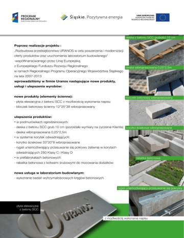 deska z betonu SCC grubości 10 cm Poprzez realizacje projektu : „Rozbudowa przedsiębiorstwa URANOS w celu poszerzenia i modernizacji oferty produktów oraz uruchomienia laboratorium budowlanego” -współfinansowanego przez Unię Europejską z Europejskiego Funduszu Rozwoju Regionalnego deska wibroprasowana 0,25*2,5m w ramach Regionalnego Programu Operacyjnego Województwa Śląskiego na lata 2007-2013 wprowadziliśmy w firmie Uranos następujące nowe produkty, usługi i ulepszenia wyrobów: nowe produkty (elementy ścienne): bloczek betonowy wibroprasowany - płyta elewacyjna z betonu SCC z możliwością wykonania napisu - bloczek betonowy ścienny 12*25*38 wibroprasowany ulepszenia produktów: · w podmurówkach ogrodzeniowych: - deska z betonu SCC grub.10 cm (pozostałe wymiary na życzenie Klienta) korytko ściekowe wibroprasowane - deska wibroprasowana 0,25*2,5m · w systemie korytek odwadniających: - korytko ściekowe 33*20*8 wibroprasowane - rygiel uniemożliwiający przesuwanie się pokrywy żeliwnej w korytach odwadniających 250 Klasy C i Klasy D · w prefabrykatach betonowych: rabatka betonowa - rabatka betonowa z kotwami śrubowymi do mocowania dodatków nowa usługa w laboratorium budowlanym: - wykonanie badań wytrzymałościowych kręgów betonowych rygiel uniemożliwiający przesuwanie się pokrywy płyta elewacyjna z betonu SCC z możliwością wykonania napisu