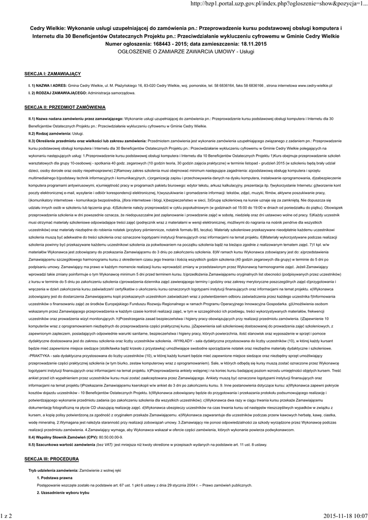 http://bzp1.portal.uzp.gov.pl/index.php?ogloszenie=show&pozycja=1... Cedry Wielkie: Wykonanie usługi uzupełniającej do zamówienia pn.: Przeprowadzenie kursu podstawowej obsługi komputera i Internetu dla 30 Beneficjentów Ostatecznych Projektu pn.: Przeciwdziałanie wykluczeniu cyfrowemu w Gminie Cedry Wielkie Numer ogłoszenia: 168443 - 2015; data zamieszczenia: 18.11.2015 OGŁOSZENIE O ZAMIARZE ZAWARCIA UMOWY - Usługi SEKCJA I: ZAMAWIAJĄCY I. 1) NAZWA I ADRES: Gmina Cedry Wielkie, ul. M. Płażyńskiego 16, 83-020 Cedry Wielkie, woj. pomorskie, tel. 58 6836164, faks 58 6836166 , strona internetowa www.cedry-wielkie.pl I. 2) RODZAJ ZAMAWIAJĄCEGO: Administracja samorządowa. SEKCJA II: PRZEDMIOT ZAMÓWIENIA II.1) Nazwa nadana zamówieniu przez zamawiającego: Wykonanie usługi uzupełniającej do zamówienia pn.: Przeprowadzenie kursu podstawowej obsługi komputera i Internetu dla 30 Beneficjentów Ostatecznych Projektu pn.: Przeciwdziałanie wykluczeniu cyfrowemu w Gminie Cedry Wielkie. II.2) Rodzaj zamówienia: Usługi. II.3) Określenie przedmiotu oraz wielkości lub zakresu zamówienia: Przedmiotem zamówienia jest wykonanie zamówienia uzupełniającego związanego z zadaniem pn.: Przeprowadzenie kursu podstawowej obsługi komputera i Internetu dla 30 Beneficjentów Ostatecznych Projektu pn.: Przeciwdziałanie wykluczeniu cyfrowemu w Gminie Cedry Wielkie polegających na wykonaniu następujących usług: 1.Przeprowadzenie kursu podstawowej obsługi komputera i Internetu dla 10 Beneficjentów Ostatecznych Projektu 1)Kurs obejmuje przeprowadzenie szkoleń warsztatowych dla grupy 10-osobowej - spotkania 40 godz. zegarowych (10 godzin teoria, 30 godzin zajęcia praktyczne) w terminie listopad - grudzień 2015 (w szkoleniu będą brały udział dzieci, osoby dorosłe oraz osoby niepełnosprawne) 2)Ramowy zakres szkolenia musi obejmować minimum następujące zagadnienia: a)podstawową obsługę komputera i sprzętu multimedialnego b)podstawy technik informacyjnych i komunikacyjnych, c)organizację zapisu i przechowywania danych na dysku komputera, instalowanie oprogramowania, d)zabezpieczenie komputera programami antywirusowymi, e)umiejętność pracy w programach pakietu biurowego: edytor tekstu, arkusz kalkulacyjny, prezentacja itp. f)wykorzystanie Internetu: g)tworzenie kont poczty elektronicznej e-mail, wysyłanie i odbiór korespondencji elektronicznej, h)wyszukiwanie i gromadzenie informacji: tekstów, zdjęć, muzyki, filmów, aktywne poszukiwanie pracy, i)komunikatory internetowe - komunikacja bezpośrednia, j)fora internetowe i blogi, k)bezpieczeństwo w sieci, 3)Grupę szkoleniową na kursie uznaje się za zamkniętą. Nie dopuszcza się udziału innych osób w szkoleniu lub łączenia grup. 4)Szkolenie należy przeprowadzić w cyklu popołudniowym (w godzinach od 15:00 do 19:00 w dniach od poniedziałku do piątku). Obowiązek przeprowadzenia szkolenia w dni powszednie oznacza, że niedopuszczalne jest zaplanowanie i prowadzenie zajęć w sobotę, niedzielę oraz dni ustawowo wolne od pracy. 5)Każdy uczestnik musi otrzymać materiały szkoleniowe odpowiadające treści zajęć (podręcznik wraz z materiałami w wersji elektronicznej, możliwymi do nagrania na nośnik pendrive dla wszystkich uczestników) oraz materiały niezbędne do robienia notatek (przybory piśmiennicze, notatnik formatu B5, teczka). Materiały szkoleniowe przekazywane nieodpłatnie każdemu uczestnikowi szkolenia muszą być adekwatne do treści szkolenia oraz oznaczone logotypami instytucji finansujących oraz informacjami na temat projektu. 6)Materiały wykorzystywane podczas realizacji szkolenia powinny być przekazywane każdemu uczestnikowi szkolenia za pokwitowaniem na początku szkolenia bądź na bieżąco zgodnie z realizowanym tematem zajęć. 7)1 kpl. w/w materiałów Wykonawca jest zobowiązany do przekazania Zamawiającemu do 3 dniu po zakończeniu szkolenia. 8)W ramach kursu Wykonawca zobowiązany jest do: a)przedstawienia Zamawiającemu szczegółowego harmonogramu kursu z określeniem czasu jego trwania i ilością wszystkich godzin szkolenia (40 godzin zegarowych dla grupy) w terminie do 5 dni po podpisaniu umowy. Zamawiający ma prawo w każdym momencie realizacji kursu wprowadzić zmiany w przedstawionym przez Wykonawcę harmonogramie zajęć. Jeżeli Zamawiający wprowadzi takie zmiany poinformuje o tym Wykonawcę minimum 5 dni przed terminem kursu. b)przedłożenia Zamawiającemu oryginalnych list obecności (podpisywanych przez uczestników) z kursu w terminie do 5 dniu po zakończeniu szkolenia c)prowadzenia dziennika zajęć zawierającego terminy i godziny oraz zakresy merytoryczne poszczególnych zajęć d)przygotowania i wręczenia w dzień zakończenia kursu zaświadczeń/ certyfikatów o ukończeniu kursu oznaczonych logotypami instytucji finansujących oraz informacjami na temat projektu. e)Wykonawca zobowiązany jest do dostarczenia Zamawiającemu kopii przekazanych uczestnikom zaświadczeń wraz z potwierdzeniem odbioru zaświadczenia przez każdego uczestnika f)Informowania uczestników o finansowaniu zajęć ze środków Europejskiego Funduszu Rozwoju Regionalnego w ramach Programu Operacyjnego Innowacyjna Gospodarka. g)Umożliwienia osobom wskazanym przez Zamawiającego przeprowadzenia w każdym czasie kontroli realizacji zajęć, w tym w szczególności ich przebiegu, treści wykorzystywanych materiałów, frekwencji uczestników oraz prowadzenia wizyt monitorujących. h)Przestrzegania zasad bezpieczeństwa i higieny pracy obowiązujących przy realizacji przedmiotu zamówienia. i)Zapewnienie 10 komputerów wraz z oprogramowaniem niezbędnych do przeprowadzenia części praktycznej kursu. j)Zapewnienia sali szkoleniowej dostosowanej do prowadzenia zajęć szkoleniowych, z zapewnionym zapleczem, posiadających odpowiednie warunki sanitarne, bezpieczeństwa i higieny pracy, których powierzchnia, ilość stanowisk oraz wyposażenie w sprzęt i pomoce dydaktyczne d