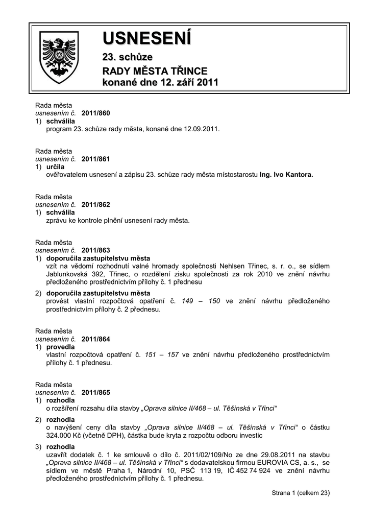 USNESENÍ 23. schůze RADY MĚSTA TŘINCE konané dne 12. září 2011 Rada města usnesením č. 2011/860 1) schválila program 23. schůze rady města, konané dne 12.09.2011. Rada města usnesením č. 2011/861 1) určila ověřovatelem usnesení a zápisu 23. schůze rady města místostarostu Ing. Ivo Kantora. Rada města usnesením č. 2011/862 1) schválila zprávu ke kontrole plnění usnesení rady města. Rada města usnesením č. 2011/863 1) doporučila zastupitelstvu města vzít na vědomí rozhodnutí valné hromady společnosti Nehlsen Třinec, s. r. o., se sídlem Jablunkovská 392, Třinec, o rozdělení zisku společnosti za rok 2010 ve znění návrhu předloženého prostřednictvím přílohy č. 1 přednesu 2) doporučila zastupitelstvu města provést vlastní rozpočtová opatření č. 149 – 150 ve znění návrhu předloženého prostřednictvím přílohy č. 2 přednesu. Rada města usnesením č. 2011/864 1) provedla vlastní rozpočtová opatření č. 151 – 157 ve znění návrhu předloženého prostřednictvím přílohy č. 1 přednesu. Rada města usnesením č. 2011/865 1) rozhodla o rozšíření rozsahu díla stavby „Oprava silnice II/468 – ul. Těšínská v Třinci“ 2) rozhodla o navýšení ceny díla stavby „Oprava silnice II/468 – ul. Těšínská v Třinci“ o částku 324.000 Kč (včetně DPH), částka bude kryta z rozpočtu odboru investic 3) rozhodla uzavřít dodatek č. 1 ke smlouvě o dílo č. 2011/02/109/No ze dne 29.08.2011 na stavbu „Oprava silnice II/468 – ul. Těšínská v Třinci“ s dodavatelskou firmou EUROVIA CS, a. s., se sídlem ve městě Praha 1, Národní 10, PSČ 113 19, IČ 452 74 924 ve znění návrhu předloženého prostřednictvím přílohy č. 1 přednesu. Strana 1 (celkem 23) Rada města usnesením č. 2011/866 1) rozhodla o výběru nejvhodnější nabídky dle pořadí nabídek, které stanovila a předložila radě města hodnotící komise, za účelem zadání veřejné zakázky malého rozsahu na akci „Sportovní areál Tyra – stavební úpravy hřiště“ takto: 1. D 5, akciová společnost, Třinec, Průmyslová 1026, Třinec 2. L.GREKO, s. r. o., Konská 468, Třinec 3. Beskydská stavební, a. s., Frýdecká 225, Třinec IČ 476 74 539 IČ 476 79 352 IČ 286 18 891 2) rozhodla uzavřít smlouvu o dílo č. 2011/02/115/No na akci „Sportovní areál Tyra - stavební úpravy hřiště“ mezi městem Třinec a firmou D 5, akciová společnost, Třinec, se sídlem ve městě Třinec, Průmyslová 1026, PSČ 739 61, IČ 476 74 539, ve znění návrhu předloženého prostřednictvím přílohy č. 1 přednesu. Rada města usnesením č. 2011/867 1) rozhodla o výběru nejvhodnější nabídky dle pořadí nabídek, které stanovila a předložila radě města hodnotící komise, za účelem zadání veřejné zakázky malého rozsahu na vypracování projektové dokumentace „Rekonstrukce ul. Dukelská v Třinci“ takto: 1. Stanislav Kawulok, Vendryně 931 2. Ing. Antonín Pechal, CSc., Ovocná 341/12, Brno 3. Projekční kancelář VIAPROJEKT, s. r. o., Na obvodu 1098/41, Ostrava IČ 134 42 635 IČ 105 49 439 IČ 253 50 323 2) rozhodla uzavřít smlouvu o dílo č. 2011/02/117/No na vypracování projektové dokumentace „Rekonstrukce ul. Dukelská v Třinci“ mezi městem Třinec a Stanislavem Kawulokem, se sídlem v obci Vendryně 931, PSČ 739 95, IČ 134 42 635, ve znění návrhu předloženého prostřednictvím přílohy č. 1 přednesu. Rada města usnesením č. 2011/868 1) rozhodla o výběru nejvhodnější nabídky dle pořadí nabídek, které stanovila a předložila radě města hodnotící komise, za účelem zadání veřejné zakázky malého rozsahu na vypracování projektové dokumentace Sídliště nad „Hradčany“ - ul. Lidická, ul. Koperníkova, ul. Beskydská a ul. Slezská v Třinci takto: 1. Stanislav Kawulok, Vendryně 931 2. AL-VO ATELIÉR, s. r. o., Košařiska 73 3. DELTA Třinec, s. r. o., Autobusové nádraží 534, Třinec IČ 134 42 635 IČ 278 43 343 IČ 607 78 288 2) rozhodla uzavřít smlouvu o dílo č. 2011/02/118/No na vypracování projektové dokumentace Sídliště nad „Hradčany“ - ul. Lidická, ul. Koperníkova, ul. Beskydská a ul. Slezská v Třinci mezi městem Třinec a Stanislavem Kawulokem, se sídlem v obci Vendryně 931, PSČ 739 95, IČ 134 42 635, ve znění návrhu předloženého prostřednictvím přílohy č. 1 přednesu. Strana 2 (celkem 23) Rada města usnesením č. 2011/869 1) rozhodla uzavřít smlouvu o dílo č. 2011/02/119/No na vypracování projektové dokumentace „Parkovací místa – ul. Slezská v Třinci“ mezi městem Třinec a zpracovatelem projektové dokumentace Projekční kancelář VIAPROJEKT, s. r. o., se sídlem ve městě Ostrava, Na obvodu 1098/41, PSČ 703 00, IČ 253 50 323, ve znění návrhu předloženého prostřednictvím přílohy č. 1 přednesu. Rada města usnesením č. 2011/870 1) rozhodla uzavřít v rámci stavby „Umístění uvítacích tabulí“ smlouvu č. 2011/02/114/Du o právu provést stavbu na pozemku parc. č. 636 v katastrálním území Vendryně mezi městem Třinec a paní K. F. K., bytem Třinec, ve znění návrhu předloženého prostřednictvím přílohy č. 1 přednesu. Rada města usnesením č. 2011/871 1) doporučila zastupitelstvu města rozhodnout o bezúplatném přijetí spoluvlastnických podílů ke stavbě vodovodu pod označením „Prodloužení vodovodního řadu v lokalitě Třinec-Oldřichovice - pod lanovkou“ umístěné na pozemcích p. č. 1929/1, 1929/2, 1944/6, 1944/7, 1944/10, 1944/11, 1944/12, 2459/1, 2459/2 a 3442/1 v katastrálním území Oldřichovice u Třince, v obci Třinec od těchto spoluvlastníků stavby: a) b) c) d) e) pan M. P., bytem Třinec (podíl 10,64%), pan P. N., bytem Milíkov a paní E. N., bytem Třinec (podíl 10,64%), paní B. H., bytem Jablunkov (podíl 10,64%), pan J. S. a paní O. S., oba by