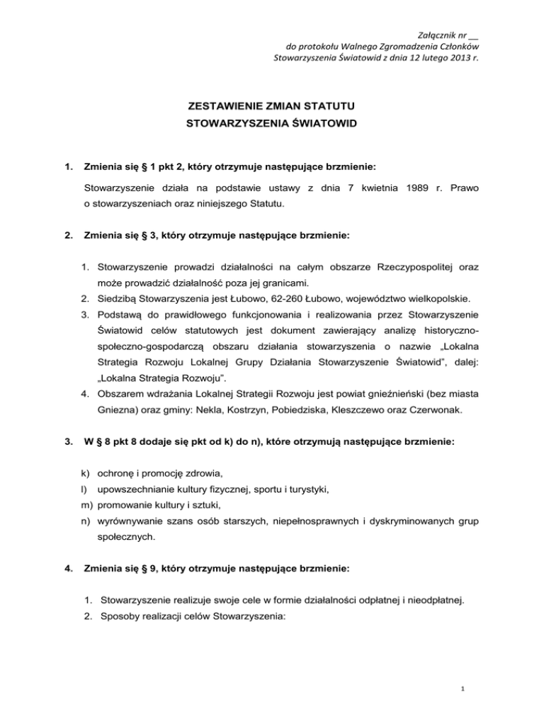 Załącznik nr __ do protokołu Walnego Zgromadzenia Członków Stowarzyszenia Światowid z dnia 12 lutego 2013 r. ZESTAWIENIE ZMIAN STATUTU STOWARZYSZENIA ŚWIATOWID 1. Zmienia się § 1 pkt 2, który otrzymuje następujące brzmienie: Stowarzyszenie działa na podstawie ustawy z dnia 7 kwietnia 1989 r. Prawo o stowarzyszeniach oraz niniejszego Statutu. 2. Zmienia się § 3, który otrzymuje następujące brzmienie: 1. Stowarzyszenie prowadzi działalności na całym obszarze Rzeczypospolitej oraz może prowadzić działalność poza jej granicami. 2. Siedzibą Stowarzyszenia jest Łubowo, 62-260 Łubowo, województwo wielkopolskie. 3. Podstawą do prawidłowego funkcjonowania i realizowania przez Stowarzyszenie Światowid celów statutowych jest dokument zawierający analizę historycznospołeczno-gospodarczą obszaru działania stowarzyszenia o nazwie „Lokalna Strategia Rozwoju Lokalnej Grupy Działania Stowarzyszenie Światowid”, dalej: „Lokalna Strategia Rozwoju”. 4. Obszarem wdrażania Lokalnej Strategii Rozwoju jest powiat gnieźnieński (bez miasta Gniezna) oraz gminy: Nekla, Kostrzyn, Pobiedziska, Kleszczewo oraz Czerwonak. 3. W § 8 pkt 8 dodaje się pkt od k) do n), które otrzymują następujące brzmienie: k) ochronę i promocję zdrowia, l) upowszechnianie kultury fizycznej, sportu i turystyki, m) promowanie kultury i sztuki, n) wyrównywanie szans osób starszych, niepełnosprawnych i dyskryminowanych grup społecznych. 4. Zmienia się § 9, który otrzymuje następujące brzmienie: 1. Stowarzyszenie realizuje swoje cele w formie działalności odpłatnej i nieodpłatnej. 2. Sposoby realizacji celów Stowarzyszenia: 1 Załącznik nr __ do protokołu Walnego Zgromadzenia Członków Stowarzyszenia Światowid z dnia 12 lutego 2013 r. 1. Organizowanie, wspieranie i finansowanie organizacji na terenie gmin zrzeszonych imprez naukowo-edukacyjnych, a także imprez o charakterze kulturalnym i promocyjnym, promującym Gminy, Stowarzyszenie oraz jego cele. 2. Organizowanie członków Stowarzyszenia oraz społeczeństwa, w zakresie tworzenia na terenie gmin zrzeszonych trwałej infrastruktury technicznej i społecznej, przyczyniającej się do poprawy warunków pracy i życia. 3. Występowanie przed organami społecznymi, organizacjami administracji podmiotami rządowej i gospodarczymi, samorządowej, instytucjami finansowymi i innymi jednostkami organizacyjnymi z inicjatywami związanymi z celami i zadaniami statutowymi Stowarzyszenia. 4. Wyrażanie opinii na temat uregulowań prawnych obowiązujących w gminach zrzeszonych, a także projektów przyszłych uregulowań. 5. Prowadzenie działalności charytatywnej na terenie gmin zrzeszonych. 6. Prowadzenie działalności wydawniczej, w tym wydawanie lokalnego czasopisma. 7. Organizowanie, wspieranie i finansowanie: a) przedsięwzięć o charakterze informacyjnym lub szkoleniowym, w tym seminariów, szkoleń, konferencji i konkursów, b) imprez kulturalnych, takich jak festiwale, targi, pokazy i wystawy, służących zwłaszcza promocji regionu i jego tożsamości kulturowej, c) działalności propagandowej, promocyjnej, informacyjnej, poligraficznej i naukowej w tym: opracowywanie i druk broszur, folderów i plakatów, opracowywanie i rozpowszechnianie materiałów audiowizualnych, tworzenie stron internetowych, przygotowywanie i rozpowszechnianie innych materiałów o charakterze reklamowym lub promocyjnym. 8. Prowadzenie doradztwa w zakresie przygotowania projektów inwestycyjnych związanych z realizacją LSR. 9. Współpracę i wymianę doświadczeń z instytucjami publicznymi i organizacjami pozarządowymi działającymi w zakresie objętym celem Stowarzyszenia na poziomie krajowymi i międzynarodowym. 10. Prowadzenie innych działań przewidzianych dla LGD w przepisach aktów prawnych powołanych w § 1 ust. 2 Statutu z uwzględnieniem zmian ustawodawczych. 2 Załącznik nr __ do protokołu Walnego Zgromadzenia Członków Stowarzyszenia Światowid z dnia 12 lutego 2013 r. 11. Wspieranie inicjatyw w zakresie rozwoju rynku produktów regionalnych i lokalnych. 12. Prowadzenie innych działań sprzyjających realizacji statutowych celów Stowarzyszenia. 5. Zmienia się § 19 pkt 3, który otrzymuje następujące brzmienie: Mandat członka: Zarządu, Komisji Rewizyjnej, Rady Projektowej wygasa przed upływem kadencji z powodu: a) ustania członkostwa w Stowarzyszeniu w odniesieniu do osoby fizycznej, b) ustania członkostwa w Stowarzyszeniu osoby prawnej, która delegowała osobę fizyczną do składu organu, c) pisemnej rezygnacji, d) odwołania przez Walne Zgromadzenie Członków uchwałą podjętą 2/3 głosów. 6. Zmienia się § 20, który otrzymuje następujące brzmienie: 1. Walne Zgromadzenie Członków, zwane dalej Walnym Zgromadzeniem jest najwyższym organem Stowarzyszenia. 2. W Walnym Zgromadzeniu winna uczestniczyć co najmniej połowa członków uprawnionych do głosowania w pierwszym terminie, a w drugim terminie, który może być wyznaczony co najmniej piętnaście minut później tego samego dnia - może ono skutecznie obradować bez względu na liczbę uczestników z tym, że drugi termin zebrania należy podać w zaproszeniu. 3. W Walnym Zgromadzeniu uczestniczą z głosem stanowiącym wszyscy członkowie zwyczajni Stowarzyszenia. 4. Osoby fizyczne uczestniczą w Walnym Zgromadzeniu z głosem stanowiącym osobiście. 5. Osoby prawne uczestniczą w Walnym Zgromadzeniu z głosem stanowiącym przez swoich przedstawicieli. 6. W Walnym Zgromadzeniu uczestniczą z głosem doradczym: członkowie wspierający, honorowi oraz zaproszeni goście. 7. Zmienia się § 21 pkt 7, który otrzymuje następujące brzmienie: 3 Załącznik nr __ do protokołu Walnego Zgromadzenia Członków Stowarzyszenia Światowid z dnia 12 lutego 2013 r. O miejscu, terminie i porządku obrad Walnego Zgromadzenia Zarząd zawiadamia członków na 14 dni przed terminem Walnego Zgromadzenia dołączając porządek obrad. Bieg 14-dniowego termi