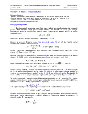 Kaźmierowski C., Zakład Gleboznawstwa i Teledetekcji Gleb UAM Poznań grudzień 2012 Gleboznawstwo Odczyn i kwasowość Ćwiczenie 6: Odczyn i kwasowość gleb Zalecana literatura: „Badania ekologiczno –gleboznawcze” – Bednarek i in., PWN 2004, str PWN, str. 198-206 „Geneza, analiza i klasyfikacja gleb”. Mocek A., Drzymała S., Wyd. UP w Poznaniu, 2010. „Gleboznawstwo” - red. S. Zawadzki, PWRiL, W-wa, strony 220-229 www.au.poznan.pl/kgir/dydaktyka/w-3.doc Iloczyn jonowy wody Czysta woda źle przewodzi prąd elektryczny, jednak tzw. „woda ultraczysta” wykazuje pewną choć znikomo małą przewodność. Stanowi to dowód, Ŝe woda jest słabym elektrolitem, który w nieznacznym stopniu ulega rozpadowi na kationy wodoru i aniony wodorotlenowe: H2O ⇔ H+ + OHDysocjacja wody przebiega wg reakcji: 2H2O ⇔ H3O+ + OHZgodnie z prawem działania mas, stała dysocjacji wody (K) tak jak dla kaŜdej reakcji odwracalnej wyraŜona jest równaniem: K= [ H + ] × [OH − ] = 1.8 × 10 −16 (dla t = 22°C) [ H 2 O] Liczba cząsteczek dysocjowanych jest znikomo mała (niespełna dwie milionowe części grama w 1 litrze wody, tj. 1000 g). MnoŜąc stałą dysocjacji wody przez stęŜenie molowe wody [H2O] uzyskujemy iloczyn dwóch stałych: K i [H2O], a więc kolejną stałą nazywaną iloczynem jonowym wody (Kw): Kw = K×[H2O] = [H+] × [OH-] Masa 1 mola wody wynosi 18 g, a stęŜenie molowe wody: [ H 2O] = Kw = 1.8 × 10-16 × 55.5 = 1 × 10-14 1000 = 55,5 mola / litr 18 (22°C) Iloczyn jonowy wody Kw określa zaleŜność między stęŜeniami jonów H+ i OH- bez względu na źródło pochodzenia jonów (z wody, kwasu lub zasady). Z powyŜszych równań wynika, Ŝe w danej temperaturze iloczyn stęŜeń jonów H+ i OH- jest wielkością stałą. Ze stałości Kw wynika takŜe, Ŝe o ile razy zwiększy się stęŜenie H+, tyle razy zmaleje stęŜenie jonów OH-. W wyniku dysocjacji z kaŜdej cząsteczki wody powstaje jeden jon H+ i jeden jon OH-, stąd w czystej wodzie stęŜenia jonów wodorowych i wodorotlenowych są jednakowe ([H+] = [OH-]), a równanie Kw = [H+] * [OH-], zapisać moŜna w postaci: Kw = [H+]2 = 10-14 Tak więc w czystej wodzie stęŜenie jonów wodorowych (i wodorotlenowych) wynosi: [ H+] = [ OH-] = √10-14 = 10-7 mol/l Roztwór, w którym stęŜenie jonów [H+] = [OH-] ma odczyn obojętny. Do scharakteryzowania kwasowości bądź zasadowości roztworu wystarczy znajomość jonów wodorowych, a stęŜenie jonów OH- oblicza się: [OH − ] = Kw [H]+ Kaźmierowski C., Zakład Gleboznawstwa i Teledetekcji Gleb UAM Poznań grudzień 2012 Gleboznawstwo Odczyn i kwasowość + -7 - -7 + - [H ] > 10 , [OH ] < 10 , ⇒[H ] > [OH ] roztwór jest kwaśny; [H+] < 10-7, [OH-] > 10-7, ⇒ [H+] < [OH-] roztwór jest zasadowy; + - -7 [H ] = [OH ] = 10 O odczynie gleby decyduje relacja ilościowa jonów H+ i OH- - przy przewadze jonów H+ roztwór określamy jako kwaśny, a przy przewadze jonów OH- jako zasadowy. Przykład obliczeń: 1. + [ H ] = 10 −10 mol / l , 10 −14 [OH ] = −10 = 10 − 4 mol / l , 10 − [H+] < [OH-] – roztwór zasadowy 2. [ H + ] = 10 −5 mol / l , [OH − ] = [H+] > [OH-] - roztwór kwaśny 10 −14 = 10 −9 −5 10 mol / l , W celu uproszczenia zapisu stęŜenia jonów wodorowych, wykazującego bardzo duŜą rozpiętość, stosowany jest wykładnik stęŜenia jonów wodorowych – tzw. pH (Sörensen 1909). pH jest to ujemny logarytm dziesiętny ze stęŜenia jonów wodorowych: [H+] = 10-pH po zlogarytmowaniu ⇒ log [H+] = -pH lub pH = - log[H+] . Przykłady: 1. [H+] = 10-7; log [H+] = -7; pH = 7 2. [H+] = 10-2; log [H+] = -2; pH = 2 3. [H+] = 5,3 *10-5; log [H+] = log 5,3 -5log10 = 0,72 -5 = -4,28; pH = 4,28 4. pH = 6,4; jakie jest stęŜenie jonów wodorowych; [H+] = 10-6,4 = 4*10-7 mol/l 5. [OH-] = 2,5*10-3 mol /l. pH? 10 −14 [H+ ] = = 4 * 10 −12 −3 2 ,5* 10 log[ H + ] = log 4 − 12 log 10 = 0,6 − 12 = −11,4 pH = 11,4 ODCZYN GLEBY Odczynem gleb nazywamy stęŜenie jonów wodorowych w roztworze glebowym wyraŜone w molach na litr. Dla określenia odczynu gleb uŜywa się symbolu pH. Odczyn wyraŜa stosunek jonów wodorowych [H+] do jonów wodorotlenowych [OH-]. Do oznaczenia odczynu gleb (pH) stosowane są metody kolorymetryczne (o dokładności na poziomie połowy jednostki pH) oraz metody potencjometryczne. Rys.1 Pomiar pH-metrem Helliga (tzw. kwasomierzem): W zagłębieniu porcelanowej płytki umieścić próbkę gleby o objętości <1 ml, dodać kilka kropel wskaźnika, chwilę odczekać, następnie przelać roztwór do rowka wychodzącego zagłębienia (przechylając płytkę) i określić odczyn na podstawie barwy. Wskaźnik przyjmuje kolor ciemnoczerwony przy pH = 4, jasnoczerwony przy pH = 5, Ŝółty przy pH = 6, jasnozielony przy pH =7 oraz ciemnozielony przy pH = 8. zdjęcie: http://www.moj-ogrodnik.pl Kaźmierowski C., Zakład Gleboznawstwa i Teledetekcji Gleb UAM Poznań grudzień 2012 Gleboznawstwo Odczyn i kwasowość Wykonanie oznaczenia metoda potencjometryczną 1. Z analizowanej próbki odwaŜyć dwa razy po 10 g powietrznie suchej gleby (w odpowiednio oznakowanych naczyniach plastikowych o pojemności 20÷30 ml i średnicy ok. 3 cm (jeden oznaczony jako woda drugi jako KCL), 2. do naczynia oznaczonego jako woda dodać 10 ml wody destylowanej, do naczynia oznaczonego jako KCL dodać 10 ml 1M KCL po czym wymieszać zawartość naczyń bagietkami lub wytrząsając zamknięte naczynia, 3. pozostawić do następnego dnia, 4. po wykalibrowaniu pH-metru odczytywać skorygowane termicznie wartości pH zanurzając elektrodę na ok. 1 cm poniŜej powierzchni cieczy, 5. co 50 pomiarów naleŜy ponownie kalibrować ph-metr. Sprzęt: waga o dokładności 0,01g, woda destylowana, 1M KCL, bagietki plastikowe, pH-metr wraz z elektrodą, bufory do kalibracji, tryskawka. Określanie odczynu na podstawie pomiaru pH Odczyn Bardzo kwaśny Kwaśny Lekko kwaśny Obojętny Zasadowy pH w wodzie <5 5,0 - 6,0 6,1 – 6,7 6,8 – 7,4 > 7