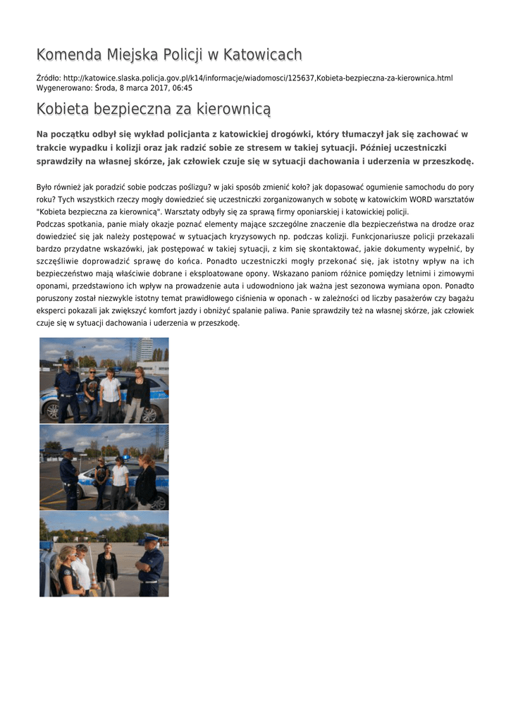 Komenda Miejska Policji w Katowicach Źródło: http://katowice.slaska.policja.gov.pl/k14/informacje/wiadomosci/125637,Kobieta-bezpieczna-za-kierownica.html Wygenerowano: Środa, 8 marca 2017, 06:45 Kobieta bezpieczna za kierownicą Na początku odbył się wykład policjanta z katowickiej drogówki, który tłumaczył jak się zachować w trakcie wypadku i kolizji oraz jak radzić sobie ze stresem w takiej sytuacji. Później uczestniczki sprawdziły na własnej skórze, jak człowiek czuje się w sytuacji dachowania i uderzenia w przeszkodę. Było również jak poradzić sobie podczas poślizgu? w jaki sposób zmienić koło? jak dopasować ogumienie samochodu do pory roku? Tych wszystkich rzeczy mogły dowiedzieć się uczestniczki zorganizowanych w sobotę w katowickim WORD warsztatów "Kobieta bezpieczna za kierownicą". Warsztaty odbyły się za sprawą firmy oponiarskiej i katowickiej policji. Podczas spotkania, panie miały okazje poznać elementy mające szczególne znaczenie dla bezpieczeństwa na drodze oraz dowiedzieć się jak należy postępować w sytuacjach kryzysowych np. podczas kolizji. Funkcjonariusze policji przekazali bardzo przydatne wskazówki, jak postępować w takiej sytuacji, z kim się skontaktować, jakie dokumenty wypełnić, by szczęśliwie doprowadzić sprawę do końca. Ponadto uczestniczki mogły przekonać się, jak istotny wpływ na ich bezpieczeństwo mają właściwie dobrane i eksploatowane opony. Wskazano paniom różnice pomiędzy letnimi i zimowymi oponami, przedstawiono ich wpływ na prowadzenie auta i udowodniono jak ważna jest sezonowa wymiana opon. Ponadto poruszony został niezwykle istotny temat prawidłowego ciśnienia w oponach - w zależności od liczby pasażerów czy bagażu eksperci pokazali jak zwiększyć komfort jazdy i obniżyć spalanie paliwa. Panie sprawdziły też na własnej skórze, jak człowiek czuje się w sytuacji dachowania i uderzenia w przeszkodę. Zainstaluj wtyczkę Flash, aby zobaczyć odtwarzacz. pobierz film - 28.49 MB Ocena: 1/5 (1) Tweetnij