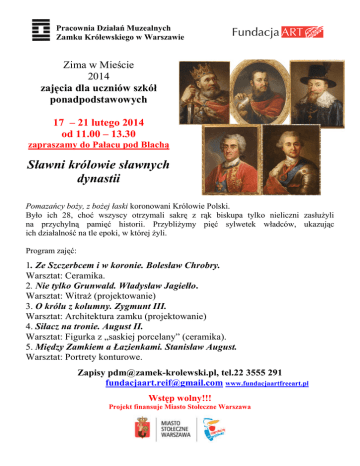Pracownia Działań Muzealnych Zamku Królewskiego w Warszawie Zima w Mieście 2014 zajęcia dla uczniów szkół ponadpodstawowych 17 – 21 lutego 2014 od 11.00 – 13.30 zapraszamy do Pałacu pod Blachą Sławni królowie sławnych dynastii Pomazańcy boży, z bożej łaski koronowani Królowie Polski. Było ich 28, choć wszyscy otrzymali sakrę z rąk biskupa tylko nieliczni zasłużyli na przychylną pamięć historii. Przybliżymy pięć sylwetek władców, ukazując ich działalność na tle epoki, w której żyli. Program zajęć: 1. Ze Szczerbcem i w koronie. Bolesław Chrobry. Warsztat: Ceramika. 2. Nie tylko Grunwald. Władysław Jagiełło. Warsztat: Witraż (projektowanie) 3. O królu z kolumny. Zygmunt III. Warsztat: Architektura zamku (projektowanie) 4. Siłacz na tronie. August II. Warsztat: Figurka z „saskiej porcelany” (ceramika). 5. Między Zamkiem a Łazienkami. Stanisław August. Warsztat: Portrety konturowe. Zapisy [email protected], tel.22 3555 291 [email protected] www.fundacjaartfreeart.pl Wstęp wolny!!! Projekt finansuje Miasto Stołeczne Warszawa