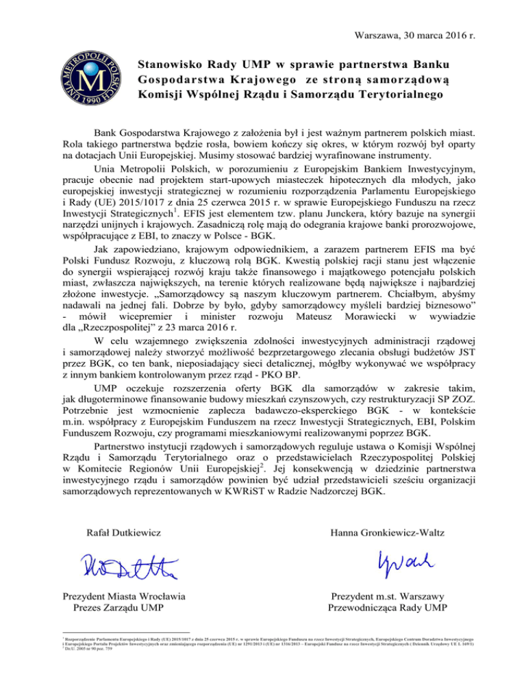 Warszawa, 30 marca 2016 r. Stanowisko Rady UMP w sprawie partnerstwa Banku Gospodarstwa Krajowego ze stroną samorządową Komisji Wspólnej Rządu i Samorządu Terytorialnego Bank Gospodarstwa Krajowego z założenia był i jest ważnym partnerem polskich miast. Rola takiego partnerstwa będzie rosła, bowiem kończy się okres, w którym rozwój był oparty na dotacjach Unii Europejskiej. Musimy stosować bardziej wyrafinowane instrumenty. Unia Metropolii Polskich, w porozumieniu z Europejskim Bankiem Inwestycyjnym, pracuje obecnie nad projektem start-upowych miasteczek hipotecznych dla młodych, jako europejskiej inwestycji strategicznej w rozumieniu rozporządzenia Parlamentu Europejskiego i Rady (UE) 2015/1017 z dnia 25 czerwca 2015 r. w sprawie Europejskiego Funduszu na rzecz Inwestycji Strategicznych1. EFIS jest elementem tzw. planu Junckera, który bazuje na synergii narzędzi unijnych i krajowych. Zasadniczą rolę mają do odegrania krajowe banki prorozwojowe, współpracujące z EBI, to znaczy w Polsce - BGK. Jak zapowiedziano, krajowym odpowiednikiem, a zarazem partnerem EFIS ma być Polski Fundusz Rozwoju, z kluczową rolą BGK. Kwestią polskiej racji stanu jest włączenie do synergii wspierającej rozwój kraju także finansowego i majątkowego potencjału polskich miast, zwłaszcza największych, na terenie których realizowane będą największe i najbardziej złożone inwestycje. „Samorządowcy są naszym kluczowym partnerem. Chciałbym, abyśmy nadawali na jednej fali. Dobrze by było, gdyby samorządowcy myśleli bardziej biznesowo” - mówił wicepremier i minister rozwoju Mateusz Morawiecki w wywiadzie dla „Rzeczpospolitej” z 23 marca 2016 r. W celu wzajemnego zwiększenia zdolności inwestycyjnych administracji rządowej i samorządowej należy stworzyć możliwość bezprzetargowego zlecania obsługi budżetów JST przez BGK, co ten bank, nieposiadający sieci detalicznej, mógłby wykonywać we współpracy z innym bankiem kontrolowanym przez rząd - PKO BP. UMP oczekuje rozszerzenia oferty BGK dla samorządów w zakresie takim, jak długoterminowe finansowanie budowy mieszkań czynszowych, czy restrukturyzacji SP ZOZ. Potrzebnie jest wzmocnienie zaplecza badawczo-eksperckiego BGK - w kontekście m.in. współpracy z Europejskim Funduszem na rzecz Inwestycji Strategicznych, EBI, Polskim Funduszem Rozwoju, czy programami mieszkaniowymi realizowanymi poprzez BGK. Partnerstwo instytucji rządowych i samorządowych reguluje ustawa o Komisji Wspólnej Rządu i Samorządu Terytorialnego oraz o przedstawicielach Rzeczypospolitej Polskiej w Komitecie Regionów Unii Europejskiej2. Jej konsekwencją w dziedzinie partnerstwa inwestycyjnego rządu i samorządów powinien być udział przedstawicieli sześciu organizacji samorządowych reprezentowanych w KWRiST w Radzie Nadzorczej BGK. Rafał Dutkiewicz Hanna Gronkiewicz-Waltz Prezydent Miasta Wrocławia Prezes Zarządu UMP Prezydent m.st. Warszawy Przewodnicząca Rady UMP 1 Rozporządzenie Parlamentu Europejskiego i Rady (UE) 2015/1017 z dnia 25 czerwca 2015 r. w sprawie Europejskiego Funduszu na rzecz Inwestycji Strategicznych, Europejskiego Centrum Doradztwa Inwestycyjnego i Europejskiego Portalu Projektów Inwestycyjnych oraz zmieniającego rozporządzenia (UE) nr 1291/2013 i (UE) nr 1316/2013 – Europejski Fundusz na rzecz Inwestycji Strategicznych ( Dziennik Urzędowy UE L 169/1) 2 Dz.U. 2005 nr 90 poz. 759