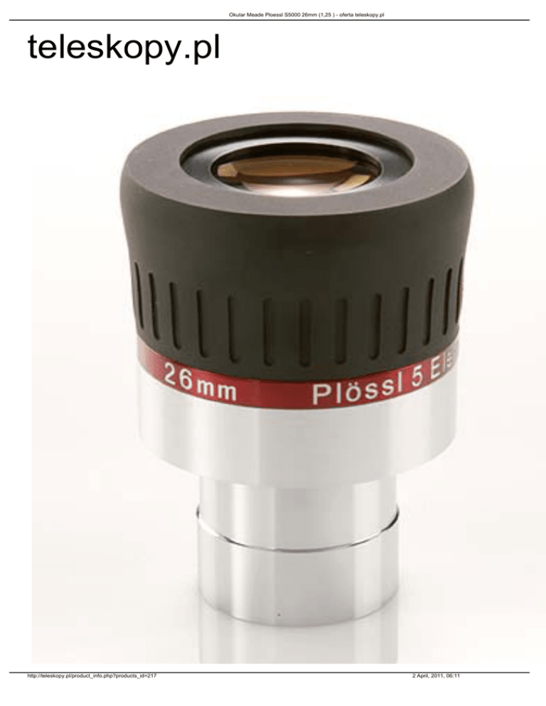 Okular Meade Ploessl S5000 26mm (1,25 ) - oferta teleskopy.pl teleskopy.pl http://teleskopy.pl/product_info.php?products_id=217 2 April, 2011, 06:11 Okular Meade Ploessl S5000 26mm (1,25 ) - oferta teleskopy.pl Okulary Ploessl firmy Meade Seria 5000 to rezultat ulepszonego zaprojektowania klasycznej konstrukcji okularów. SkBadaj si z 5-6 elementów optycznych, o okoBo 40% lepiej koryguj aberracj chromatyczn i dziki temu zmniejszeniu ulega dystorsja obrazu - osignito w ten sposób prawie pBaskie pole widzenia przy dobrym kontra[cie i szerokim polu widzenia. Parametry techniczne • Ogniskowa - 26mm • Zrednica oprawy - 1,25'' • Pole widzenia - 60° Gwarancja 2 lata gwarancji http://teleskopy.pl/product_info.php?products_id=217 2 April, 2011, 06:11