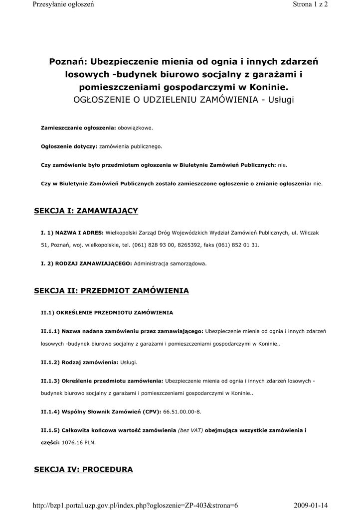 Przesyłanie ogłoszeń Strona 1 z 2 Poznań: Ubezpieczenie mienia od ognia i innych zdarzeń losowych -budynek biurowo socjalny z garaŜami i pomieszczeniami gospodarczymi w Koninie. OGŁOSZENIE O UDZIELENIU ZAMÓWIENIA - Usługi Zamieszczanie ogłoszenia: obowiązkowe. Ogłoszenie dotyczy: zamówienia publicznego. Czy zamówienie było przedmiotem ogłoszenia w Biuletynie Zamówień Publicznych: nie. Czy w Biuletynie Zamówień Publicznych zostało zamieszczone ogłoszenie o zmianie ogłoszenia: nie. SEKCJA I: ZAMAWIAJĄCY I. 1) NAZWA I ADRES: Wielkopolski Zarząd Dróg Wojewódzkich Wydział Zamówień Publicznych, ul. Wilczak 51, Poznań, woj. wielkopolskie, tel. (061) 828 93 00, 8265392, faks (061) 852 01 31. I. 2) RODZAJ ZAMAWIAJĄCEGO: Administracja samorządowa. SEKCJA II: PRZEDMIOT ZAMÓWIENIA II.1) OKREŚLENIE PRZEDMIOTU ZAMÓWIENIA II.1.1) Nazwa nadana zamówieniu przez zamawiającego: Ubezpieczenie mienia od ognia i innych zdarzeń losowych -budynek biurowo socjalny z garaŜami i pomieszczeniami gospodarczymi w Koninie.. II.1.2) Rodzaj zamówienia: Usługi. II.1.3) Określenie przedmiotu zamówienia: Ubezpieczenie mienia od ognia i innych zdarzeń losowych budynek biurowo socjalny z garaŜami i pomieszczeniami gospodarczymi w Koninie.. II.1.4) Wspólny Słownik Zamówień (CPV): 66.51.00.00-8. II.1.5) Całkowita końcowa wartość zamówienia (bez VAT) obejmująca wszystkie zamówienia i części: 1076.16 PLN. SEKCJA IV: PROCEDURA http://bzp1.portal.uzp.gov.pl/index.php?ogloszenie=ZP-403&strona=6 2009-01-14 Przesyłanie ogłoszeń Strona 2 z 2 IV.1) TRYB UDZIELENIA ZAMÓWIENIA: Zamówienie z wolnej ręki IV.2) INFORMACJE ADMINISTRACYJNE Zamówienie dotyczy projektu/programu finansowanego ze środków Unii Europejskiej: nie SEKCJA V: UDZIELENIE ZAMÓWIENIA V.1) DATA UDZIELENIA ZAMÓWIENIA: 05.01.2009. V.2) LICZBA OTRZYMANYCH OFERT: 1. V.3) NAZWA I ADRES WYKONAWCY, KTÓREMU UDZIELONO ZAMÓWIENIA: INTERRISK TOWARZYSTWO UBEZPIECZEŃ S.A. VIENNA INSURANCE GROUP ODDZIAŁ W POZNANIU, UL. GÓRKI 7, 60-204 POZNAŃ, kraj/woj. wielkopolskie. V.4) INFORMACJA O CENIE WYBRANEJ OFERTY ORAZ O NIE PODLEGAJĄCYCH ODRZUCENIU OFERTACH Z NAJNIśSZĄ I NAJWYśSZĄ CENĄ (bez VAT) Cena wybranej oferty: 1076.16 Oferta z najniŜszą ceną: 1076.16 oferta z najwyŜszą ceną: 1076.16 Waluta: PLN. http://bzp1.portal.uzp.gov.pl/index.php?ogloszenie=ZP-403&strona=6 2009-01-14