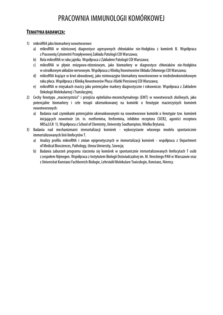 PRACOWNIA IMMUNOLOGII KOMÓRKOWEJ TEMATYKA BADAWCZA: 1) mikroRNA jako biomarkery nowotworowe: a) mikroRNA w różnicowej diagnostyce agresywnych chłoniaków nie-Hodgkina z komórek B. Współpraca z Pracownią Cytometrii Przepływowej Zakładu Patologii COI Warszawa; b) Rola mikroRNA w raku jajnika. Współpraca z Zakładem Patologii COI Warszawa; c) mikroRNA w płynie mózgowo-rdzeniowym, jako biomarkery w diagnostyce chłoniaków nie-Hodgkina w ośrodkowym układzie nerwowym. Współpraca z Kliniką Nowotworów Układu Chłonnego COI Warszawa; d) mikroRNA krążące w krwi obwodowej, jako nieinwazyjne biomarkery nowotworowe w niedrobnokomórkowym raku płuca. Współpraca z Kliniką Nowotworów Płuca i Klatki Piersiowej COI Warszawa; e) mikroRNA w mięsakach macicy jako potencjalne markery diagnostyczne i rokownicze. Współpraca z Zakładem Onkologii Molekularnej i Translacyjnej. 2) Cechy fenotypu „macierzystości” i przejścia epitelialno-mezenchymalnego (EMT) w nowotworach złośliwych, jako potencjalne biomarkery i cele terapii ukierunkowanej na komórki o fenotypie macierzystych komórek nowotworowych: a) Badania nad czynnikami potencjalnie ukierunkowanymi na nowotworowe komórki o fenotypie tzw. komórek inicjujących nowotwór (m. in. metformina, fenformina, inhibitor receptora CXCR2, agoniści receptora NR5a2/LR 1). Współpraca z School of Chemistry, University Southampton, Wielka Brytania. 3) Badania nad mechanizmami immortalizacji komórek - wykorzystanie własnego modelu spontanicznie immortalizowanych linii limfocytów T. a) Analizy profilu mikroRNA i zmian epigenetycznych w immortalizacji komórek - współpraca z Department of Medical Biosciences, Pathology, Umea University, Szwecja; b) Badania zaburzeń programu starzenia się komórek w spontanicznie immortalizowanych limfocytach T osób z zespołem Nijmegen. Współpraca z Instytutem Biologii Doświadczalnej im. M. Nenckiego PAN w Warszawie oraz z Universitat Konstanz Fachbereich Biologie, Lehrstuhl Molekulare Toxicologie, Konstanz, Niemcy.