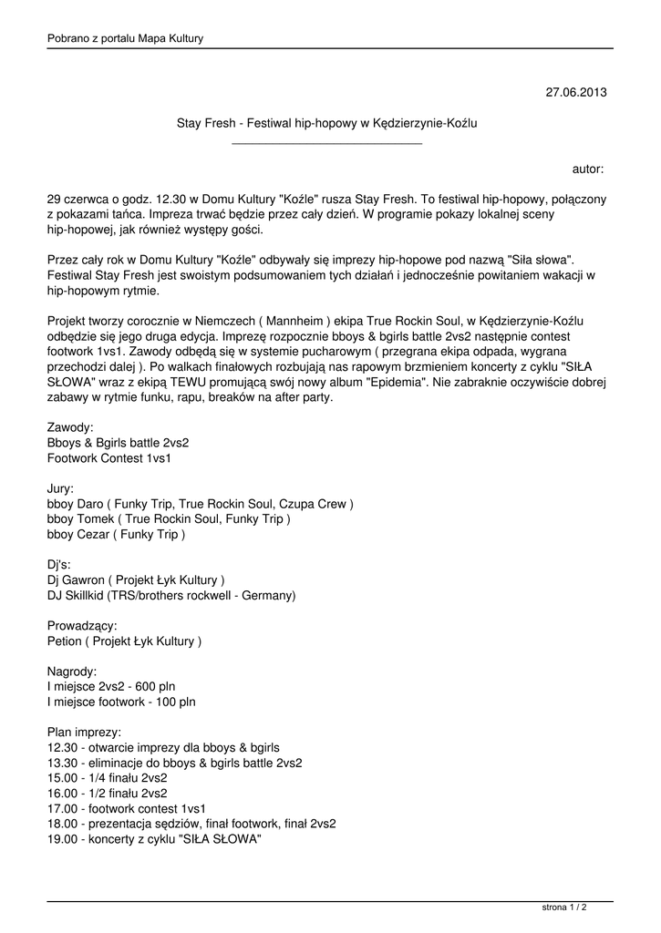 Pobrano z portalu Mapa Kultury 27.06.2013 Stay Fresh - Festiwal hip-hopowy w Kędzierzynie-Koźlu ____________________________ autor: 29 czerwca o godz. 12.30 w Domu Kultury "Koźle" rusza Stay Fresh. To festiwal hip-hopowy, połączony z pokazami tańca. Impreza trwać będzie przez cały dzień. W programie pokazy lokalnej sceny hip-hopowej, jak również występy gości. Przez cały rok w Domu Kultury "Koźle" odbywały się imprezy hip-hopowe pod nazwą "Siła słowa". Festiwal Stay Fresh jest swoistym podsumowaniem tych działań i jednocześnie powitaniem wakacji w hip-hopowym rytmie. Projekt tworzy corocznie w Niemczech ( Mannheim ) ekipa True Rockin Soul, w Kędzierzynie-Koźlu odbędzie się jego druga edycja. Imprezę rozpocznie bboys & bgirls battle 2vs2 następnie contest footwork 1vs1. Zawody odbędą się w systemie pucharowym ( przegrana ekipa odpada, wygrana przechodzi dalej ). Po walkach finałowych rozbujają nas rapowym brzmieniem koncerty z cyklu "SIŁA SŁOWA" wraz z ekipą TEWU promującą swój nowy album "Epidemia". Nie zabraknie oczywiście dobrej zabawy w rytmie funku, rapu, breaków na after party. Zawody: Bboys & Bgirls battle 2vs2 Footwork Contest 1vs1 Jury: bboy Daro ( Funky Trip, True Rockin Soul, Czupa Crew ) bboy Tomek ( True Rockin Soul, Funky Trip ) bboy Cezar ( Funky Trip ) Dj's: Dj Gawron ( Projekt Łyk Kultury ) DJ Skillkid (TRS/brothers rockwell - Germany) Prowadzący: Petion ( Projekt Łyk Kultury ) Nagrody: I miejsce 2vs2 - 600 pln I miejsce footwork - 100 pln Plan imprezy: 12.30 - otwarcie imprezy dla bboys & bgirls 13.30 - eliminacje do bboys & bgirls battle 2vs2 15.00 - 1/4 finału 2vs2 16.00 - 1/2 finału 2vs2 17.00 - footwork contest 1vs1 18.00 - prezentacja sędziów, finał footwork, finał 2vs2 19.00 - koncerty z cyklu "SIŁA SŁOWA" strona 1 / 2 Pobrano z portalu Mapa Kultury Gościnnie wystąpią: Żeton Banita TEWU 21.00 - koncerty z cyklu "SIŁA SŁOWA": Czincz-Czu Akumu Dudel STX NARS KDF ŁUKUZŁOTYCHŁOPAK 22.00 - After Party strona 2 / 2