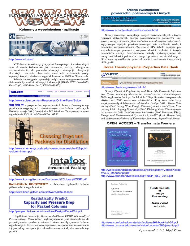 Ocena zwilżalności powierzchni polimerowych i innych Kolumny z wypełnieniem - aplikacje http://www.vff.com/ VFF dostarcza różne typy wypełnień usypowych i strukturalnych oraz akcesoria kolumnowe jak: zraszacze, ruszty, odemglacze, uszczelnienia itp. do procesów absorpcji , desorpcji, destylacji, ekstrakcji, suszenia, chłodzenia, nawilżania, uzdatniania wody, separacji kropel, odsalania - wyprodukowane w 100% w Niemczech. Również udostępnia i sprzedaje dedykowane oprogramowanie do obliczania hydrauliki, absorpcji i desorpcji (DURANIT® inert-balls, DuraTop®, VFF-Twin-Pak®, VFF-NetBall®) http://www.sulzer.com/en/Resources/Online-Tools/Sulcol SULCOL™ - program do projektowania kolumn z firmowym wypełnieniem usypowym i strukturalnym oraz kolumn półkowych. Ostatnia wersja 3.0 (również dla MS Windows 7) wprowadza nowe wypełnienia F-Grid i MellapakPlus 602.Y. http://www.accudynetest.com/resources.html Strony zawierają kompilacje danych doświadczalnych i teoretycznych dotyczących energii powierzchniowej polimerów (the surface energy of plastic films and other non-absorptive substrates), krytycznego napięcia powierzchniowego, kąta zwilżania wodą i parametru rozpuszczalności Hansena (HSP); tabele napięcia powierzchniowego, parametru rozpuszczalności, lepkości i innych parametrów cieczy. Przedstawiono metody wykorzystywane do oceny zwilżalności polimerów i innych powierzchni nie chłonnych. Oferowane są możliwości przeszukiwania i sortowania tematycznej bibliografii. Korea Thermophysical Properties Data Bank http://www.cheric.org/research/kdb/ Strony Chemical Engineering and Materials Research Information Center zawierają właściwości termofizyczne i równowagowe 2000 węglowodorów i gazów lekkich, 200 polimerów i rozpuszczalników oraz 2000 roztworów elektrolitów. Przy tworzeniu bazy współpracowały 4 laboratoria: Molecular Design LAB , Korea University (Prof. Jeong Won Kang); Thermodynamics and Green Processing LAB., Sogang University (Prof. Ki-Pung Yoo); Thermophysical properties LAB, Seoul National University (Prof. Hwayong Kim); Energy and Environmental System LAB, KAIST (Prof. Heoun Lee) pod patronatem Ministry of Knowledge Economy, Republic of Korea. OPEN ACCESS – Transformata Fouriera http://www.chemengr.ucsb.edu/~ceweb/courses/che128/pdf/1r -column-intern.pdf http://waveletsandsubbandcoding.org/Repository/VetterliKovac evic95_Manuscript.pdf http://www.fourierandwavelets.org/FWSP_a3.2_2013.pdf http://www.koch-glitsch.com/Document%20Library/KGSP.pdf Koch-Glitsch KG-TOWER™ - obliczanie hydrauliki kolumn półkowych i z wypełnieniem: http://www.koch-glitsch.com/software/default.aspx http://people.clarkson.edu/~wwilcox/Design/PackdCol.pdf Uogólniona korelacja Sherwoooda-Ekerta GPDC (Generalized Pressure-Drop Correlation) wykorzystywana jest standardowo do przewidywania spadku ciśnienia i stanu zachłystywania kolumn wypełnionych. Przedstawiono poprawne i niepoprawne zastosowania tej procedury interpolacji i zaktualizowano metodę dla nowych wypełnień. http://see.stanford.edu/materials/lsoftaee261/book-fall-07.pdf http://www.cs.ucla.edu/~soatto/vision/courses/268/jana-fip.pdf Opracował dr inż. Józef Zioło