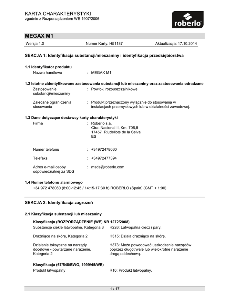 KARTA CHARAKTERYSTYKI zgodnie z Rozporządzeniem WE 1907/2006 MEGAX M1 Wersja 1.0 Numer Karty: H51187 Aktualizacja: 17.10.2014 SEKCJA 1: Identyfikacja substancji/mieszaniny i identyfikacja przedsiębiorstwa 1.1 Identyfikator produktu Nazwa handlowa : MEGAX M1 1.2 Istotne zidentyfikowane zastosowania substancji lub mieszaniny oraz zastosowania odradzane Zastosowanie : Powłoki rozpuszczalnikowe substancji/mieszaniny Zalecane ograniczenia stosowania : Produkt przeznaczony wyłącznie do stosowania w instalacjach przemysłowych lub w działalności zawodowej. 1.3 Dane dotyczące dostawcy karty charakterystyki Firma : Roberlo s.a. Ctra. Nacional II, Km. 706,5 17457 Riudellots de la Selva ES Numer telefonu : +34972478060 Telefaks : +34972477394 Adres e-mail osoby odpowiedzialnej za SDS : [email protected] 1.4 Numer telefonu alarmowego +34 972 478060 (8:00-12:45 / 14:15-17:30 h) ROBERLO (Spain) (GMT + 1:00) SEKCJA 2: Identyfikacja zagrożeń 2.1 Klasyfikacja substancji lub mieszaniny Klasyfikacja (ROZPORZĄDZENIE (WE) NR 1272/2008) Substancje ciekłe łatwopalne, Kategoria 3 H226: Łatwopalna ciecz i pary. Drażniące na skórę, Kategoria 2 H315: Działa drażniąco na skórę. Działanie toksyczne na narządy docelowe - powtarzane narażenie, Kategoria 2 H373: Może powodować uszkodzenie narządów poprzez długotrwałe lub wielokrotne narażenie drogą oddechową. Klasyfikacja (67/548/EWG, 1999/45/WE) Produkt łatwopalny R10: Produkt łatwopalny. 1 / 17 KARTA CHARAKTERYSTYKI zgodnie z Rozporządzeniem WE 1907/2006 MEGAX M1 Wersja 1.0 Numer Karty: H51187 Aktualizacja: 17.10.2014 2.2 Elementy oznakowania Oznakowanie (ROZPORZĄDZENIE (WE) NR 1272/2008) Piktogramy określające : rodzaj zagrożenia Hasło ostrzegawcze : Uwaga Zwroty wskazujące rodzaj zagrożenia : H226 H373 Łatwopalna ciecz i pary. Może powodować uszkodzenie narządów poprzez długotrwałe lub wielokrotne narażenie drogą oddechową. Działa drażniąco na skórę. H315 Zwroty wskazujące środki ostrożności : Zapobieganie: P210 P260 P260 P280 Przechowywać z dala od źródeł ciepła, gorących powierzchni, źródeł iskrzenia, otwartego ognia i innych źródeł zapłonu. Nie palić. Nie wdychać par. Nie wdychać rozpylonej cieczy. Stosować rękawice ochronne/ odzież ochronną/ ochronę oczu/ ochronę twarzy. Reagowanie: P303 + P361 + P353 W PRZYPADKU KONTATKU ZE SKÓRĄ (lub z włosami): Natychmiast zdjąć całą zanieczyszczoną odzież. Spłukać skórę pod strumieniem wody/prysznicem. P370 + P378 W przypadku pożaru: Użyć suchy piasek, suche proszki gaśnicze lub pianę alkoholoodporną do gaszenia. Magazynowanie: P403 Przechowywać w dobrze wentylowanym miejscu. Usuwanie: P501 Zawartość/ pojemnik usuwać do autoryzowanego zakładu utylizacji odpadów. 2.3 Inne zagrożenia Ta substancja/mieszanina nie zawiera składników uważanych albo za trwałe, podlegające bioakumulacji i toksyczne, albo bardzo trwałe i podlegające bardzo silnej bioakumulacji (vPvB) na poziomie 0,1% bądź powyżej. SEKCJA 3: Skład/informacja o składnikach 3.2 Mieszaniny Typ związku : Farba 2 / 17 KARTA CHARAKTERYSTYKI zgodnie z Rozporządzeniem WE 1907/2006 MEGAX M1 Wersja 1.0 Numer Karty: H51187 Aktualizacja: 17.10.2014 Składniki niebezpieczne Nazwa Chemiczna Nr CAS Nr WE Numer rejestru Klasyfikacja (67/548/EWG) octan n-butylu 123-86-4 R10 204-658-1 R66 01R67 2119485493-29 ksylen (mieszanina izomerów) 1330-20-7 R10 215-535-7 Xn; R20/21 01Xi; R38 2119488216-32 Klasyfikacja (ROZPORZĄDZEN IE (WE) NR 1272/2008) Flam. Liq.3; H226 STOT SE3; H336 Flam. Liq.3; H226 Acute Tox.4; H332 Acute Tox.4; H312 Skin Irrit.2; H315 Eye Irrit.2; H319 STOT SE3; H335 STOT RE2; H373 Asp. Tox.1; H304 Nafta o niskiej 64742-95-6 R10 Flam. Liq.3; H226 temperaturze wrzenia – 265-199-0 N; R51/53 Skin Irrit.2; H315 nieokreślona 01R67 STOT SE3; H336 2119455851-35 Xi; R38 Asp. Tox.1; H304 Xn; R65 Aquatic Chronic2; H411 etylobenzen 100-41-4 F; R11 Flam. Liq.2; H225 202-849-4 Xn; R20 Acute Tox.4; H332 STOT RE2; H373 Asp. Tox.1; H304 Substancje o granicy narażenia zawodowego na stanowisku pracy : ester 2108-65-6 R10 Flam. Liq.3; H226 metoksypropylowy 203-603-9 kwasu octowego 012119475791-29 Stężenie (%) >= 5 - < 10 >= 5 - < 10 >= 1 - < 2,5 >= 1 - < 2 >= 2,5 - < 5 Wyjaśnienia skrótów znajdują się w sekcji 16. SEKCJA 4: Środki pierwszej pomocy 4.1 Opis środków pierwszej pomocy Porady ogólne : Usunąć z zagrożonej strefy. Zasięgnąć porady medycznej. Przedstawić lekarzowi dołączoną Kartę Charakterystyki Substancji Niebezpiecznej. W przypadku wdychania : Przenieść na świeże powietrze w przypadku wdychania pyłu lub dymów z przegrzania lub spalania. Jeśli objawy utrzymują się, wezwać lekarza. 3 / 17 KARTA CHARAKTERYSTYKI zgodnie z Rozporządzeniem WE 1907/2006 MEGAX M1 Wersja 1.0 Numer Karty: H51187 Aktualizacja: 17.10.2014 W przypadku kontaktu ze skórą : Natychmiast zdjąć skażone obuwie i ubranie. Zmyć mydłem i dużą ilością wody. W przypadku kontaktu z oczami : Zapobiegawczo przemyć oczy wodą. Usunąć szkła (szkło) kontaktowe. Zabezpieczyć nieuszkodzone oko. W trakcie przemywania należy szeroko otwierać oczy. Jeśli podrażnienie oczu utrzymuje się, skonsultować się ze specjalistą. W przypadku połknięcia : Przemyć usta wodą i następnie wypić dużą ilość wody. NIE prowokować wymiotów. Nie podawać mleka lub napoju alkoholowego. Nieprzytomnej osobie nigdy nie podawać nic doustnie. Jeśli objawy utrzymują się, wezwać lekarza. 4.2 Najważniejsze ostre i opóźnione objawy oraz skutki narażenia Objawy : Wdychanie może wywołać następujące objawy: Ból głowy Zawroty głowy Znużenie Kontakt ze skórą może wywołać następujące objawy: Zaczerwienienie Połknięcie może wywołać następujące objawy: Ból brzucha Wymioty Mdłości 4.3 Wskazania dotyczące wszelkiej natychmiastowej pomocy lekarskiej i szczególnego postępowania z poszkodowanym Kuracja : Brak dostępnej informacji. SEKCJA 5