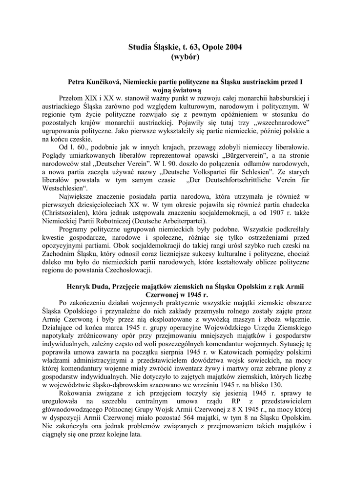 Studia Śląskie, t. 63, Opole 2004 (wybór) Petra Kunčíková, Niemieckie partie polityczne na Śląsku austriackim przed I wojną światową Przełom XIX i XX w. stanowił ważny punkt w rozwoju całej monarchii habsburskiej i austriackiego Śląska zarówno pod względem kulturowym, narodowym i politycznym. W regionie tym życie polityczne rozwijało się z pewnym opóźnieniem w stosunku do pozostałych krajów monarchii austriackiej. Pojawiły się tutaj trzy „wszechnarodowe” ugrupowania polityczne. Jako pierwsze wykształciły się partie niemieckie, później polskie a na końcu czeskie. Od l. 60., podobnie jak w innych krajach, przewagę zdobyli niemieccy liberałowie. Poglądy umiarkowanych liberałów reprezentował opawski „Bürgerverein”, a na stronie narodowców stał „Deutscher Verein”. W l. 90. doszło do połączenia odłamów narodowych, a nowa partia zaczęła używać nazwy „Deutsche Volkspartei für Schlesien”. Ze starych liberałów powstała w tym samym czasie „Der Deutschfortschrittliche Verein für Westschlesien“. Największe znaczenie posiadała partia narodowa, która utrzymała je również w pierwszych dziesięcioleciach XX w. W tym okresie pojawiła się również partia chadecka (Christsozialen), która jednak ustępowała znaczeniu socjaldemokracji, a od 1907 r. także Niemieckiej Partii Robotniczej (Deutsche Arbeiterpartei). Programy polityczne ugrupowań niemieckich były podobne. Wszystkie podkreślały kwestie gospodarcze, narodowe i społeczne, różniąc się tylko ostrzeżeniami przed opozycyjnymi partiami. Obok socjaldemokracji do takiej rangi urósł szybko ruch czeski na Zachodnim Śląsku, który odnosił coraz liczniejsze sukcesy kulturalne i polityczne, chociaż daleko mu było do niemieckich partii narodowych, które kształtowały oblicze polityczne regionu do powstania Czechosłowacji. Henryk Duda, Przejęcie majątków ziemskich na Śląsku Opolskim z rąk Armii Czerwonej w 1945 r. Po zakończeniu działań wojennych praktycznie wszystkie majątki ziemskie obszarze Śląska Opolskiego i przynależne do nich zakłady przemysłu rolnego zostały zajęte przez Armię Czerwoną i były przez nią eksploatowane z wywózką maszyn i zboża włącznie. Działające od końca marca 1945 r. grupy operacyjne Wojewódzkiego Urzędu Ziemskiego napotykały zróżnicowany opór przy przejmowaniu mniejszych majątków i gospodarstw indywidualnych, zależny często od woli poszczególnych komendantur wojennych. Sytuację tę poprawiła umowa zawarta na początku sierpnia 1945 r. w Katowicach pomiędzy polskimi władzami administracyjnymi a przedstawicielem dowództwa wojsk sowieckich, na mocy której komendantury wojenne miały zwrócić inwentarz żywy i martwy oraz zebrane plony z gospodarstw indywidualnych. Nie dotyczyło to zajętych majątków ziemskich, których liczbę w województwie śląsko-dąbrowskim szacowano we wrześniu 1945 r. na blisko 130. Rokowania związane z ich przejęciem toczyły się jesienią 1945 r. sprawy te uregulowała na szczeblu centralnym umowa rządu RP z przedstawicielem głównodowodzącego Północnej Grupy Wojsk Armii Czerwonej z 8 X 1945 r., na mocy której w dyspozycji Armii Czerwonej miało pozostać 564 majątki, w tym 8 na Śląsku Opolskim. Nie zakończyła ona jednak problemów związanych z przejmowaniem takich majątków i ciągnęły się one przez kolejne lata. 2 Irena Korbelarova, Kilka uwag o rozwoju niższych urzędów stanowych na Górnym Śląsku Artykuł przedstawia na podstawie analizy źródeł położenie i zadania tzw. weichbildów (względnie powiatów) na Śląsku od momentu ich powstania do podziału Śląska. Formułuje też dalsze postulaty badawcze, ze szczególnym uwzględnieniem sytuacji na Górnym Śląsku. Weichbildy zastąpiły na Śląsku niższe jednostki terytorialne zwane kasztelaniami. Wykształciły się z miejskich rejonów sądowych w efekcie sukcesów kolonizacyjnych i od końca XIII w., a szczególnie od XIV w. spełniały funkcję podstawowej jednostki organizacyjnej i administracyjnego zarządu poszczególnych księstw. Na Dolnym Śląsku wykształciły się w tej randze zjazdy stanowe i organa egzekutywy, zebrania weichbildowe, urzędy itd. Na Górnym Śląsku te najniższe organy, nazywane tutaj powiatami, nie uzyskały takiego znaczenia. Jeśli w niektórych księstwach, jak np. na obszarze cieszyńskim, po okresowo gwałtownym rozwoju, działalność ich załamała się, to w innych rejonach, jak np. w księstwie opolsko-raciborskim uległa ona skostnieniu. Przetrwały one aż po wiek XVIII, jednak jedynie jako jednostka pomocnicza, przy pomocy której szlachta wysyłała swoich przedstawicieli do ciał wyższych, a w niektórych przypadkach spełniały one rolę organu władzy zwierzchniej. Gerard Kosmala, Pomniki wojenne w krajobrazie kulturowym województwa opolskiego – zróżnicowanie i konflikt Pomniki poświęcone poległym w wojnach światowych żołnierzom, jak i wszystkie upamiętnienia, są ważnym elementem krajobrazu kulturowego i procesów politycznych. Wspomagają kształtowanie mitu narodowego, są elementem budowy tożsamości. Znaczenie posiadają także ich niewątpliwe walory estetyczne. Razem, wszystkie te elementy mają przede wszystkim oddziaływać na emocje, choć także przekazywać pewne (nie zawsze zgodne z prawdą) informacje o upamiętnionych ludziach lub zdarzeniach. W województwie opolskim od ponad 10 lat toczy się spór wokół pomników upamiętniających poległych żołnierzy niemieckich w I i II wojnie światowej. Spór, który budzi wielkie zainteresowanie mediów, polityków i władz ale, jak dotąd, niewielki badaczy. Artykuł analizuje wybrane aspekty omawianego sporu. Liczba upamiętnień nie jest przez nikogo znana, a prowadzone badania terenowe wykazały istnienie ponad 150 obiektów i nie jest to liczba ostateczna. Koncentrują się one w gminach, w których notowano wysokie poparcie dla list kandydatów