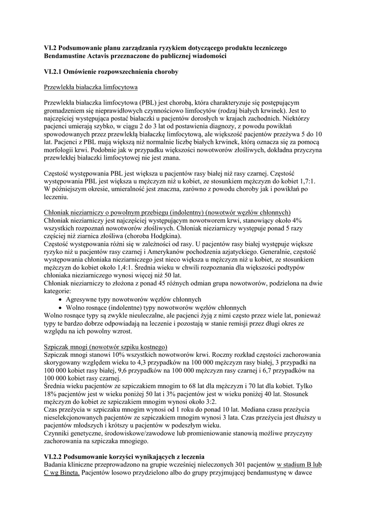 VI.2 Podsumowanie planu zarządzania ryzykiem dotyczącego produktu leczniczego Bendamustine Actavis przeznaczone do publicznej wiadomości VI.2.1 Omówienie rozpowszechnienia choroby Przewlekła białaczka limfocytowa Przewlekła białaczka limfocytowa (PBL) jest chorobą, która charakteryzuje się postępującym gromadzeniem się nieprawidłowych czynnościowo limfocytów (rodzaj białych krwinek). Jest to najczęściej występująca postać białaczki u pacjentów dorosłych w krajach zachodnich. Niektórzy pacjenci umierają szybko, w ciągu 2 do 3 lat od postawienia diagnozy, z powodu powikłań spowodowanych przez przewlekłą białaczkę limfocytową, ale większość pacjentów przeżywa 5 do 10 lat. Pacjenci z PBL mają większą niż normalnie liczbę białych krwinek, którą oznacza się za pomocą morfologii krwi. Podobnie jak w przypadku większości nowotworów złośliwych, dokładna przyczyna przewlekłej białaczki limfocytowej nie jest znana. Częstość występowania PBL jest większa u pacjentów rasy białej niż rasy czarnej. Częstość występowania PBL jest większa u mężczyzn niż u kobiet, ze stosunkiem mężczyzn do kobiet 1,7:1. W późniejszym okresie, umieralność jest znaczna, zarówno z powodu choroby jak i powikłań po leczeniu. Chłoniak nieziarniczy o powolnym przebiegu (indolentny) (nowotwór węzłów chłonnych) Chłoniak nieziarniczy jest najczęściej występującym nowotworem krwi, stanowiący około 4% wszystkich rozpoznań nowotworów złośliwych. Chłoniak nieziarniczy występuje ponad 5 razy częściej niż ziarnica złośliwa (choroba Hodgkina). Częstość występowania różni się w zależności od rasy. U pacjentów rasy białej występuje większe ryzyko niż u pacjentów rasy czarnej i Amerykanów pochodzenia azjatyckiego. Generalnie, częstość występowania chłoniaka nieziarniczego jest nieco większa u mężczyzn niż u kobiet, ze stosunkiem mężczyzn do kobiet około 1,4:1. Średnia wieku w chwili rozpoznania dla większości podtypów chłoniaka nieziarniczego wynosi więcej niż 50 lat. Chłoniak nieziarniczy to złożona z ponad 45 różnych odmian grupa nowotworów, podzielona na dwie kategorie: Agresywne typy nowotworów węzłów chłonnych Wolno rosnące (indolentne) typy nowotworów węzłów chłonnych Wolno rosnące typy są zwykle nieuleczalne, ale pacjenci żyją z nimi często przez wiele lat, ponieważ typy te bardzo dobrze odpowiadają na leczenie i pozostają w stanie remisji przez długi okres ze względu na ich powolny wzrost. Szpiczak mnogi (nowotwór szpiku kostnego) Szpiczak mnogi stanowi 10% wszystkich nowotworów krwi. Roczny rozkład częstości zachorowania skorygowany względem wieku to 4,3 przypadków na 100 000 mężczyzn rasy białej, 3 przypadki na 100 000 kobiet rasy białej, 9,6 przypadków na 100 000 mężczyzn rasy czarnej i 6,7 przypadków na 100 000 kobiet rasy czarnej. Średnia wieku pacjentów ze szpiczakiem mnogim to 68 lat dla mężczyzn i 70 lat dla kobiet. Tylko 18% pacjentów jest w wieku poniżej 50 lat i 3% pacjentów jest w wieku poniżej 40 lat. Stosunek mężczyzn do kobiet ze szpiczakiem mnogim wynosi około 3:2. Czas przeżycia w szpiczaku mnogim wynosi od 1 roku do ponad 10 lat. Mediana czasu przeżycia nieselekcjonowanych pacjentów ze szpiczakiem mnogim wynosi 3 lata. Czas przeżycia jest dłuższy u pacjentów młodszych i krótszy u pacjentów w podeszłym wieku. Czynniki genetyczne, środowiskowe/zawodowe lub promieniowanie stanowią możliwe przyczyny zachorowania na szpiczaka mnogiego. VI.2.2 Podsumowanie korzyści wynikających z leczenia Badania kliniczne przeprowadzono na grupie wcześniej nieleczonych 301 pacjentów w stadium B lub C wg Bineta. Pacjentów losowo przydzielono albo do grupy przyjmującej bendamustynę w dawce 100 mg/m2 pc., albo do grupy przyjmującej chlorambucyl w dawce 0,8 mg/kg mc. Wyniki pokazały wyższy wskaźnik ogólnej odpowiedzi (90 vs. 38) i dłuższy czas przeżycia wolny od progresji dla bendamustyny w porównaniu do chlorambucylu (18 miesięcy vs. 6 miesięcy) (Knauf WU i wsp., 2009; Trenada US Prescribing Information, 2008). 100 pacjentów chorych na chłoniaki nieziarnicze B-komórkowe o powolnym przebiegu, z opornością na rytuksymab było leczonych bendamustyną stosowaną dożylnie w monoterapii w dawce 120 mg/m2 pc. w dniach 1 i 2, w schemacie planowanym na co najmniej 6 cykli leczenia. Całkowity odsetek odpowiedzi wynosił 75% (17% odpowiedzi całkowitych i 58% odpowiedzi częściowych). Mediana czasu trwania remisji wynosiła 40 tygodni (Levact, Charakterystyka Produktu Leczniczego, 2012). Badanie przeprowadzone na grupie 100 pacjentów z chłoniakami nieziarniczymi B-komórkowymi o powolnym przebiegu, z progresją podczas lub w ciągu sześciu miesięcy po leczeniu rytuksymabem w monoterapii lub leczeniu skojarzonym, wykazało całkowity odsetek odpowiedzi na poziomie 77% (15% całkowitych odpowiedzi, 19% niepotwierdzonych całkowitych odpowiedzi i 43% częściowych odpowiedzi) po leczeniu bendamustyną w dawce 120 mg/m2 pc., podawaną w dniach 1 i 2 w 21-dniowym cyklu leczenia. Pacjentom podawano do 8 cykli leczenia. Mediana czasu trwania odpowiedzi wynosiła 9 miesięcy dla pacjentów z powolnym przebiegiem choroby (Friedberg JW i wsp., 2008). Badanie porównujące leczenie bendamustyną i prednizonem (BP) (n=68) do leczenia melfalanem i prednizonem (MP) (n=63) u pacjentów ze szpiczakiem mnogim wcześniej nieleczonych. Całkowity odsetek odpowiedzi wynosił 75% w grupie BP i 70% w grupie MP. Znacznie większa liczba pacjentów leczona BP uzyskała całkowitą remisję w porównaniu do grupy otrzymującej MP (32% vs. 13%) i maksymalną odpowiedź uzyskano szybciej u pacjentów leczonych BP w porównaniu do pacjentów otrzymujących MP (6,8 cykli vs. 8,7 cykli) (Ponisch W i wsp., 2006). VI.2.3 Niewiadome związane z korzyściami z leczenia Obecnie nie są dostępne dane dotyczące stosowania bendamustyny u pacjentów z 