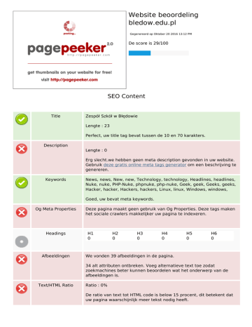 Website beoordeling bledow.edu.pl Gegenereerd op Oktober 20 2016 13:12 PM De score is 29/100 SEO Content Title Zespół Szkół w Błędowie Lengte : 23 Perfect, uw title tag bevat tussen de 10 en 70 karakters. Description Lengte : 0 Erg slecht.we hebben geen meta description gevonden in uw website. Gebruik deze gratis online meta tags generator om een beschrijving te genereren. Keywords News, news, New, new, Technology, technology, Headlines, headlines, Nuke, nuke, PHP-Nuke, phpnuke, php-nuke, Geek, geek, Geeks, geeks, Hacker, hacker, Hackers, hackers, Linux, linux, Windows, windows, Goed, uw bevat meta keywords. Og Meta Properties Headings Afbeeldingen Deze pagina maakt geen gebruik van Og Properties. Deze tags maken het sociale crawlers makkelijker uw pagina te indexeren. H1 0 H2 0 H3 0 H4 0 H5 0 H6 0 We vonden 39 afbeeldingen in de pagina. 34 alt attributen ontbreken. Voeg alternatieve text toe zodat zoekmachines beter kunnen beoordelen wat het onderwerp van de afbeeldingen is. Text/HTML Ratio Ratio : 0% De ratio van text tot HTML code is below 15 procent, dit betekent dat uw pagina waarschijnlijk meer tekst nodig heeft. SEO Content Flash Iframe Perfect, geen Flash content gevonden in uw website. Jammer, u heeft Iframes in uw website, dit betekent dat deze content niet kan worden geïndexeerd. SEO Links Herschreven URL Slecht. Uw links maken gebruik van een query string. Underscores in de URLs We hebben underscores gevonden in uw URLs. U zou het minteken moeten gebruiken ten behoeven van SEO. In-page links We vonden een totaal van 58 links inclusie 1 link(s) naar bestanden Statistics Externe Links : noFollow 0% Externe Links : doFollow 5.17% Interne Links 94.83% In-page links Ankertekst Type samenstelling Home Intern doFollow Tematy Intern doFollow Pliki Intern doFollow Twoje konto Intern doFollow Wyślij artykuł Intern doFollow Top 10 Intern doFollow Archiwum artykułów Intern doFollow Blogi Intern doFollow Ciekawe strony Intern doFollow Encyclopedia Intern doFollow In-page links FAQ Intern doFollow Forum Intern doFollow Galeria Intern doFollow Kontakt Intern doFollow Poleć znajomym Intern doFollow Statystyki Intern doFollow nasza szkoła Intern doFollow świetlica szkolna Intern doFollow plan lekcji Intern doFollow samorząd uczniowski Intern doFollow klasy Intern doFollow nauczyciele Intern doFollow pedagog Intern doFollow psycholog Intern doFollow dydaktyka Intern doFollow absolwenci Intern doFollow informator trzecioklasisty Intern doFollow stara wersja stron Intern doFollow y Extern doFollow Zarejestruj się Intern doFollow izahu Intern doFollow kinia25 Intern doFollow etopyfa Intern doFollow ynavemi Intern doFollow Czytaj więcej... Extern doFollow smok520 Intern doFollow komentarze? Intern doFollow komentarze? Intern doFollow In-page links Katie Intern doFollow 1 komentarz Intern doFollow 2 komentarze Intern doFollow komentarze? Intern doFollow Instrukcja pierwszego logowania Intern doFollow Sprawdź najbliższe zmiany w planie lekcji Intern doFollow Kalendarium 2015/2016 Intern doFollow Godziny dla Rodziców 2015/2016 Intern doFollow Wykaz podręczników na rok szkolny 2016/2017 Intern doFollow 50 faktów na temat wszystkiego! Intern doFollow Wycieczka do Warszawy Intern doFollow Narodowe Czytanie Intern doFollow XIV BIEGI PRZEŁAJOWE W JEZIORZE Intern doFollow Rozpoczęcie roku szkolnego 2016/2017 Intern doFollow Uroczyste zakończenie roku szkolnego 2015/2016 Intern doFollow Wycieczka rowerowa do Wilkowa Intern doFollow Warsztaty dotyczące tworzenia stron internetowych Intern doFollow Ekosystemy łąkowe w gminie Błędów Intern doFollow Święto Szkoły Intern doFollow Extern doFollow SEO Keywords Keywords Cloud Keywords Consistentie Keyword Content Title Keywords Description Headings Bruikbaarheid Url Domein : bledow.edu.pl Lengte : 13 Favicon Goed, uw website heeft een favicon. Printbaarheid Jammer. We vonden geen Print-Vriendelijke CSS. Taal Er is geen taal ingesteld. Gebruik deze gratis meta tags generator om de taal van uw website mee in te stellen. Dublin Core Deze pagina maakt geen gebruik van Dublin Core. Document Doctype HTML 4.01 Transitional Encoding Perfect. Uw ingestelde Charset is ISO-8859-2. W3C Validiteit Fouten : 634 Waarschuwingen : 27 E-mail Privacy Waarschuwing! Er is op zijn minst 1 e-mailadres gevonden als platte tekst. (voorkom spam!). Gebruik deze gratis antispam protector om emailadressen te verbergen voor spammers. Niet ondersteunde HTML Niet ondersteunde tags Voorkomende <center> 6 <font> 40 <big> 24 <u> 3 We hebben niet meer ondersteunde HTML tags gevonden in uw HTML, we adviseren u deze te verwijderen. Speed Tips Attentie! Probeer tabellen in tabellen te voorkomen in uw HTML. Jammer, uw website maakt gebruik van inline styles. Geweldig, uw website heeft een correct aantal CSS bestanden. Document Perfect, uw website heeft een correct aantal JavaScript bestanden. Perfect, uw website haalt voordeel uit gzip. Mobile Mobile Optimization Apple Icon Meta Viewport Tag Flash content Optimalisatie XML Sitemap Ontbrekend Uw website heeft geen XML sitemap- dit kan problematisch zijn. Een sitemap vermeld url's die beschikbaar zijn voor crawlen en kan extra informatie bevatten zoals uw laatste site-updates, frequentie van wijzigingen en het belang van de url's. Dit laat zoekmachines toe om de site intelligenter te doorzoeken. Robots.txt http://bledow.edu.pl/robots.txt Geweldig uw website heeft een robots.txt bestand. Analytics Ontbrekend We hadden niet op te sporen van een analytics tool op deze website geplaatst. Web Analytics laat u toe de bezoekersactiviteit op uw website te meten. U zou minstens 1 Analytics tool geïnstalleerd moeten hebben en een extra tool voor de bevestiging van de resultaten. Powered by TCPDF (www.tcpdf.org)