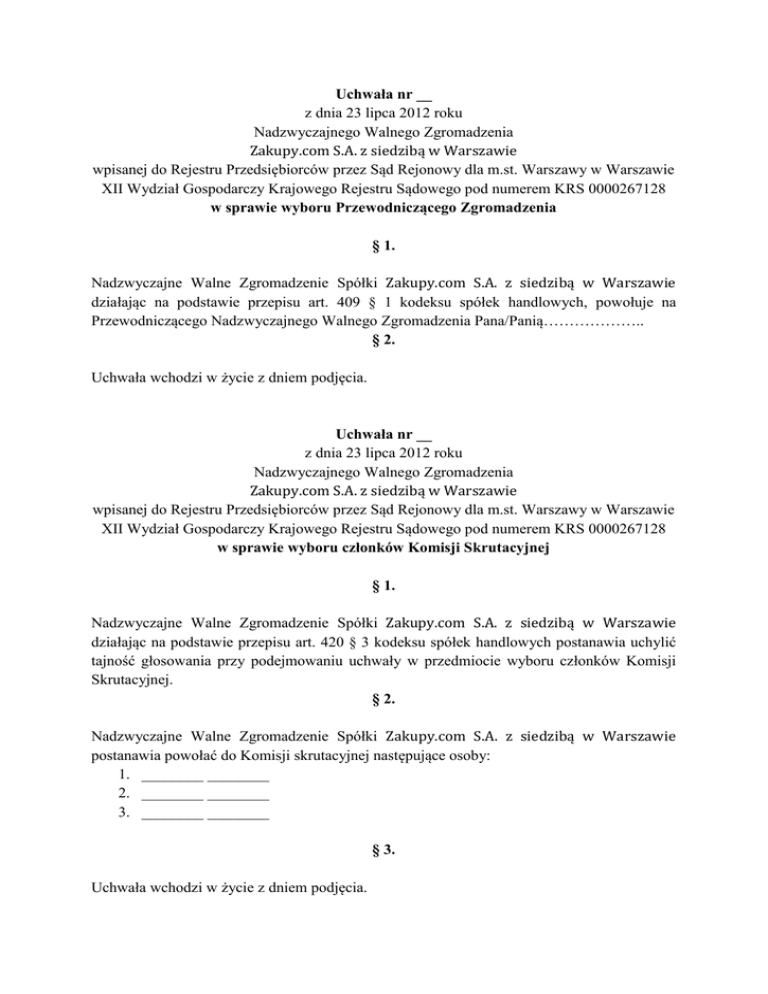 Uchwała nr __ z dnia 23 lipca 2012 roku Nadzwyczajnego Walnego Zgromadzenia Zakupy.com S.A. z siedzibą w Warszawie wpisanej do Rejestru Przedsiębiorców przez Sąd Rejonowy dla m.st. Warszawy w Warszawie XII Wydział Gospodarczy Krajowego Rejestru Sądowego pod numerem KRS 0000267128 w sprawie wyboru Przewodniczącego Zgromadzenia § 1. Nadzwyczajne Walne Zgromadzenie Spółki Zakupy.com S.A. z siedzibą w Warszawie działając na podstawie przepisu art. 409 § 1 kodeksu spółek handlowych, powołuje na Przewodniczącego Nadzwyczajnego Walnego Zgromadzenia Pana/Panią……………….. § 2. Uchwała wchodzi w życie z dniem podjęcia. Uchwała nr __ z dnia 23 lipca 2012 roku Nadzwyczajnego Walnego Zgromadzenia Zakupy.com S.A. z siedzibą w Warszawie wpisanej do Rejestru Przedsiębiorców przez Sąd Rejonowy dla m.st. Warszawy w Warszawie XII Wydział Gospodarczy Krajowego Rejestru Sądowego pod numerem KRS 0000267128 w sprawie wyboru członków Komisji Skrutacyjnej § 1. Nadzwyczajne Walne Zgromadzenie Spółki Zakupy.com S.A. z siedzibą w Warszawie działając na podstawie przepisu art. 420 § 3 kodeksu spółek handlowych postanawia uchylić tajność głosowania przy podejmowaniu uchwały w przedmiocie wyboru członków Komisji Skrutacyjnej. § 2. Nadzwyczajne Walne Zgromadzenie Spółki Zakupy.com S.A. z siedzibą w Warszawie postanawia powołać do Komisji skrutacyjnej następujące osoby: 1. ________ ________ 2. ________ ________ 3. ________ ________ § 3. Uchwała wchodzi w życie z dniem podjęcia. Uchwała nr __ z dnia 23 lipca 2012 roku Nadzwyczajnego Walnego Zgromadzenia Zakupy.com S.A. z siedzibą w Warszawie wpisanej do Rejestru Przedsiębiorców przez Sąd Rejonowy dla m.st. Warszawy w Warszawie XII Wydział Gospodarczy Krajowego Rejestru Sądowego pod numerem KRS 0000267128 w sprawie przyjęcia porządku obrad § 1. Nadzwyczajne Walne Zgromadzenie Spółki Zakupy.com S.A. z siedzibą w Warszawie działając na podstawie postanowienia § 32. ust. 1 Statutu Spółki, przyjmuje następujący porządek obrad: 1/ Otwarcie obrad Nadzwyczajnego Walnego Zgromadzenia. 2/ Wybór Przewodniczącego Nadzwyczajnego Walnego Zgromadzenia. 3/ Stwierdzenie prawidłowości zwołania Nadzwyczajnego Walnego Zgromadzenia i jego zdolności do podejmowania uchwał 4/ Wybór członków Komisji Skrutacyjnej 5/ Przyjęcie porządku obrad 6/ Podjęcie uchwały w sprawie rozpatrzenia i zatwierdzenia sprawozdania Zarządu z działalności przejętej Spółki B2BPartner sp. z o.o. za rok obrotowy obejmujący okres od dnia 01 stycznia 2011 roku do dnia 31 grudnia 2011 roku 7/ Podjęcie uchwały w sprawie rozpatrzenia i zatwierdzenia sprawozdania finansowego przejętej Spółki B2BPartner sp. z o.o. za rok obrotowy obejmujący okres od dnia 01 stycznia 2011 roku do dnia 31 grudnia 2011 roku 8/ Podjęcie uchwały w sprawie podziału zysku przejętej Spółki B2BPartner sp. z o.o. za rok obrotowy obejmujący okres od dnia 01 stycznia 2011 roku do dnia 31 grudnia 2011 roku 9/ Podjęcie uchwały w sprawie udzielenia absolutorium Prezesowi Zarządu przejętej Spółki B2BPartner sp. z o.o. z wykonania obowiązków w roku 2011 10/ Podjęcie uchwały w sprawie udzielenia absolutorium Członkowi Zarządu przejętej Spółki B2BPartner sp. z o.o. z wykonania obowiązków w roku 2011 11/ Wolne wnioski 12/ Zamknięcie obrad. § 2. Uchwała wchodzi w życie z dniem podjęcia. Uchwała nr __ z dnia 23 lipca 2012 roku Nadzwyczajnego Walnego Zgromadzenia Zakupy.com S.A. z siedzibą w Warszawie wpisanej do Rejestru Przedsiębiorców przez Sąd Rejonowy dla m.st. Warszawy w Warszawie XII Wydział Gospodarczy Krajowego Rejestru Sądowego pod numerem KRS 0000267128 w sprawie rozpatrzenia i zatwierdzenia sprawozdania Zarządu z działalności przejętej Spółki B2BPartner sp. z o.o. za rok obrotowy obejmujący okres od dnia 01 stycznia 2011 roku do dnia 31 grudnia 2011 roku Nadzwyczajne Walne Zgromadzenie Spółki Zakupy.com S.A. z siedzibą w Warszawie działając na podstawie przepisu art. 393 pkt 1, art. 395 § 2 pkt 1 oraz art. 494 kodeksu spółek handlowych, mając na uwadze art. 228 pkt1oraz 231 § 2 pkt 1 kodeksu spółek handlowych, w związku z przejęciem przez Spółkę spółki B2BPartner Sp. z o.o., uchwala co następuje, § 1. Walne Zgromadzenie Spółki zatwierdza sprawozdanie Zarządu z działalności przejętej Spółki B2BPartner sp. z o.o. za rok obrotowy obejmujący okres od dnia 01 stycznia 2011 roku do dnia 31 grudnia 2011 roku. § 2. Uchwała wchodzi w życie z dniem podjęcia. Uchwała nr __ z dnia 23 lipca 2012 roku Nadzwyczajnego Walnego Zgromadzenia Zakupy.com S.A. z siedzibą w Warszawie wpisanej do Rejestru Przedsiębiorców przez Sąd Rejonowy dla m.st. Warszawy w Warszawie XII Wydział Gospodarczy Krajowego Rejestru Sądowego pod numerem KRS 0000267128 w sprawie rozpatrzenia i zatwierdzenia sprawozdania finansowego przejętej Spółki B2BPartner sp. z o.o. za rok obrotowy obejmujący okres od dnia 01 stycznia 2011 roku do dnia 31 grudnia 2011 roku Nadzwyczajne Walne Zgromadzenie Spółki Zakupy.com S.A. z siedzibą w Warszawie działając na podstawie przepisu art. 393 pkt 1, art. 395 §2 pkt 1 oraz art. 494 kodeksu spółek handlowych, mając na uwadze art. 228 pkt1 oraz 231 § 2 pkt 1 kodeksu spółek handlowych, w związku z przejęciem przez Spółkę spółki B2BPartner Sp. z o.o., uchwala co następuje: § 1. Walne Zgromadzenie Spółki zatwierdza sprawozdanie finansowe przejętej Spółki B2BPartner sp. z o.o. za rok obrotowy obejmujący okres od dnia 01 stycznia 2011 roku do dnia 31 grudnia 2011 roku, składające się z: 1. wprowadzenia; 2. bilansu sporządzonego na dzień 31 grudnia 2011 roku, który po stronie aktywów i pasywów wykazuje kwotę ___.___,__ zł; 3. rachunku zysków i strat za rok obrotowy obejmujący okres od dnia 01 stycznia 2011 roku do dnia 31 grudnia 2011 roku wykazującego zysk netto w kwocie ___.___,__ zł; 4. informacji dodatkowej. § 2. Uchwała wcho
