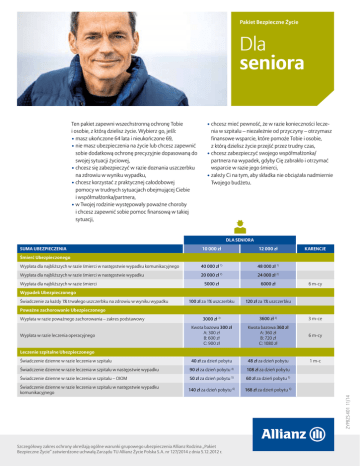 Pakiet Bezpieczne Życie Dla seniora Ten pakiet zapewni wszechstronną ochronę Tobie i osobie, z którą dzielisz życie. Wybierz go, jeśli: •m asz ukończone 64 lata i nieukończone 69, •n ie masz ubezpieczenia na życie lub chcesz zapewnić sobie dodatkową ochronę precyzyjnie dopasowaną do swojej sytuacji życiowej, • c hcesz się zabezpieczyć w razie doznania uszczerbku na zdrowiu w wyniku wypadku, • c hcesz korzystać z praktycznej całodobowej pomocy w trudnych sytuacjach obejmującej Ciebie i współmałżonka/partnera, •w Twojej rodzinie występowały poważne choroby i chcesz zapewnić sobie pomoc finansową w takiej sytuacji, • chcesz mieć pewność, że w razie konieczności leczenia w szpitalu – niezależnie od przyczyny – otrzymasz finansowe wsparcie, które pomoże Tobie i osobie, z którą dzielisz życie przejść przez trudny czas, • chcesz zabezpieczyć swojego współmałżonka/ partnera na wypadek, gdyby Cię zabrakło i otrzymać wsparcie w razie jego śmierci, • zależy Ci na tym, aby składka nie obciążała nadmiernie Twojego budżetu. DLA SENIORA SUMA UBEZPIECZENIA 10 000 zł 12 000 zł KARENCJE Wypłata dla najbliższych w razie śmierci w następstwie wypadku komunikacyjnego 40 000 zł 1) 48 000 zł 1) Wypłata dla najbliższych w razie śmierci w następstwie wypadku 20 000 zł 2) 24 000 zł 2) 5000 zł 6000 zł 100 zł za 1% uszczerbku 120 zł za 1% uszczerbku 3000 zł 3) 3600 zł 3) 3 m-ce Kwota bazowa 300 zł A: 300 zł B: 600 zł C: 900 zł Kwota bazowa 360 zł A: 360 zł B: 720 zł C: 1080 zł 6 m-cy 40 zł za dzień pobytu 48 zł za dzień pobytu 1 m-c Świadczenie dzienne w razie leczenia w szpitalu w następstwie wypadku 90 zł za dzień pobytu 4) 108 zł za dzień pobytu Świadczenie dzienne w razie leczenia w szpitalu – OIOM 50 zł za dzień pobytu 60 zł za dzień pobytu 5) Świadczenie dzienne w razie leczenia w szpitalu w następstwie wypadku komunikacyjnego 140 zł za dzień pobytu 6) Śmierć Ubezpieczonego Wypłata dla najbliższych w razie śmierci 6 m-cy Wypadek Ubezpieczonego Świadczenie za każdy 1% trwałego uszczerbku na zdrowiu w wyniku wypadku Poważne zachorowanie Ubezpieczonego Wypłata w razie poważnego zachorowania – zakres podstawowy Wypłata w razie leczenia operacyjnego Leczenie szpitalne Ubezpieczonego Szczegółowy zakres ochrony określają ogólne warunki grupowego ubezpieczenia Allianz Rodzina „Pakiet Bezpieczne Życie” zatwierdzone uchwałą Zarządu TU Allianz Życie Polska S.A. nr 127/2014 z dnia 5.12.2012 r. 5) 168 zł za dzień pobytu 6) ZYPBZS-K01 11/14 Świadczenie dzienne w razie leczenia w szpitalu DLA SENIORA SUMA UBEZPIECZENIA 10 000 zł 12 000 zł tak tak KARENCJE Całodobowa pomoc Świadczenia opiekuńcze dla Ubezpieczonego i jego rodziny Zdarzenia dotyczące współmałżonka/partnera Wypłata w razie śmierci współmałżonka/partnera Wypłata w razie śmierci współmałżonka/partnera w następstwie wypadku SKŁADKA MIESIĘCZNA 2000 zł 10 000 zł 67,00 zł 2400 zł 7) 12 000 zł 6 m-cy 7) 80,40 zł 1) W ysokość świadczenia podano łącznie z wysokością świadczenia z zakresu podstawowego (zgon Ubezpieczonego) oraz świadczenia z tytułu zgonu Ubezpieczonego w następstwie wypadku 2) Wysokość świadczenia podano łącznie z wysokością świadczenia z zakresu podstawowego (zgon Ubezpieczonego) 3) Z akres podstawowy, tj. 20 jednostek chorobowych obejmuje: zawał serca, zabiegi kardiochirurgiczne w celu leczenia przewlekłej choroby niedokrwiennej serca, zabiegi kardiochirurgiczne wymiany zastawki, operację aorty, udar mózgu, stwardnienie rozsiane, chorobę Parkinsona, chorobę Creutzfelda-Jakoba, łagodny guz mózgu, zakażenie wirusem HIV, oparzenia skóry, całkowita utratę wzroku, całkowitą utratę słuchu, całkowitą utratę mowy, anemię plastyczną wymagającą leczenia, nowotwór, niewydolność nerek, przeszczep, schyłkową niewydolność wątroby, śpiączkę 4) Wysokość świadczenia podano łącznie z wysokością świadczenia z tytułu leczenia Ubezpieczonego w szpitalu 5) Wysokość świadczenia podana jest w wysokości niezależnej od innych świadczeń z tytułu pobytu w szpitalu 6) W ysokość świadczenia podano łącznie z wysokością świadczenia z tytułu leczenia Ubezpieczonego w szpitalu oraz świadczenia z tytułu leczenia Ubezpieczonego w szpitalu wnastępstwie wypadku 7) Wysokość świadczenia podano łącznie z wysokością świadczenia z tytułu zgonu współmałżonka/partnera
