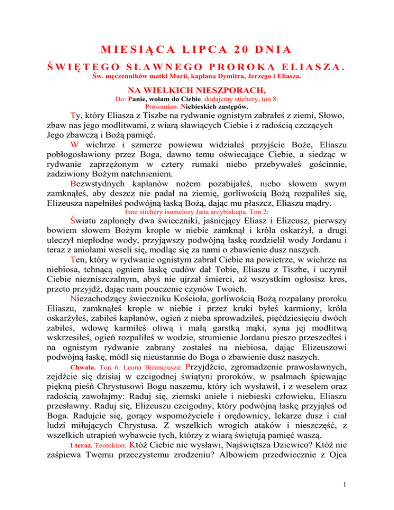 MIESIĄCA LIPCA 20 DNIA ŚWIĘTEGO SŁAWNEGO PROROKA ELIASZA. Św. męczenników matki Marii, kapłana Dymitra, Jerzego i Eliasza. NA WIELKICH NIESZPORACH, Do: Panie, wołam do Ciebie, dodajemy stichery, ton 8: Prosomion: Niebieskich zastępów. Ty, który Eliasza z Tiszbe na rydwanie ognistym zabrałeś z ziemi, Słowo, zbaw nas jego modlitwami, z wiarą sławiących Ciebie i z radością czczących Jego zbawczą i BoŜą pamięć. W wichrze i szmerze powiewu widziałeś przyjście BoŜe, Eliaszu pobłogosławiony przez Boga, dawno temu oświecające Ciebie, a siedząc w rydwanie zaprzęŜonym w cztery rumaki niebo przebywałeś gościnnie, zadziwiony BoŜym natchnieniem. Bezwstydnych kapłanów noŜem pozabijałeś, niebo słowem swym zamknąłeś, aby deszcz nie padał na ziemię, gorliwością BoŜą rozpaliłeś się, Elizeusza napełniłeś podwójną łaską BoŜą, dając mu płaszcz, Eliaszu mądry. Inne stichery isomelosy Jana arcybiskupa. Ton 2: Światu zapłonęły dwa świeczniki, jaśniejący Eliasz i Elizeusz, pierwszy bowiem słowem BoŜym krople w niebie zamknął i króla oskarŜył, a drugi uleczył niepłodne wody, przyjąwszy podwójną łaskę rozdzielił wody Jordanu i teraz z aniołami weseli się, modląc się za nami o zbawienie dusz naszych. Ten, który w rydwanie ognistym zabrał Ciebie na powietrze, w wichrze na niebiosa, tchnącą ogniem łaskę cudów dał Tobie, Eliaszu z Tiszbe, i uczynił Ciebie niezniszczalnym, abyś nie ujrzał śmierci, aŜ wszystkim ogłosisz kres, przeto przyjdź, dając nam pouczenie czynów Twoich. Niezachodzący świeczniku Kościoła, gorliwością BoŜą rozpalany proroku Eliaszu, zamknąłeś krople w niebie i przez kruki byłeś karmiony, króla oskarŜyłeś, zabiłeś kapłanów, ogień z nieba sprowadziłeś, pięćdziesięciu dwóch zabiłeś, wdowę karmiłeś oliwą i małą garstką mąki, syna jej modlitwą wskrzesiłeś, ogień rozpaliłeś w wodzie, strumienie Jordanu pieszo przeszedłeś i na ognistym rydwanie zabrany zostałeś na niebiosa, dając Elizeuszowi podwójną łaskę, módl się nieustannie do Boga o zbawienie dusz naszych. Chwała. Ton 6. Leona Bizancjusza: Przyjdźcie, zgromadzenie prawosławnych, zejdźcie się dzisiaj w czcigodnej świątyni proroków, w psalmach śpiewając piękną pieśń Chrystusowi Bogu naszemu, który ich wysławił, i z weselem oraz radością zawołajmy: Raduj się, ziemski aniele i niebieski człowieku, Eliaszu przesławny. Raduj się, Elizeuszu czcigodny, który podwójną łaskę przyjąłeś od Boga. Radujcie się, gorący wspomoŜyciele i orędownicy, lekarze dusz i ciał ludzi miłujących Chrystusa. Z wszelkich wrogich ataków i nieszczęść, z wszelkich utrapień wybawcie tych, którzy z wiarą świętują pamięć waszą. I teraz. Teotokion: KtóŜ Ciebie nie wysławi, Najświętsza Dziewico? KtóŜ nie zaśpiewa Twemu przeczystemu zrodzeniu? Albowiem przedwiecznie z Ojca 1 zajaśniały Syn Jednorodzony, z Ciebie, Czysta, przyszedł, wcieliwszy się w niewypowiedziany sposób, Bogiem będąc z natury ze względu na nas stał się człowiekiem, nie w dwóch oddzielnych osobach, ale w dwóch niepomieszanych naturach poznawany. Módl się do Niego, Czysta, najbardziej błogosławiona, aby zmiłował się nad duszami naszymi. Wejście. Prokimenon dnia i trzy czytania. Czytanie III Księgi Królewskiej (17, 1-24). Było słowo Pańskie do Eliasza Proroka i rzekł do Achaba: «Na Ŝycie Pana, Boga Mocy, Boga Izraela, przed którym stoję dzisiaj! Nie będzie w tych latach ani rosy, ani deszczu, dopóki nie powiedzą usta moje». Potem Pan skierował do Eliasza słowo, mówiąc: «Odejdź stąd i udaj się na wschód, aby ukryć się przy potoku Kerit, który jest na wschód od Jordanu. Wodę będziesz pił z potoku, krukom zaś nakaŜę, Ŝeby cię tam Ŝywiły». Poszedł więc Eliasz, aby uczynić według słowa Pańskiego, i zamieszkał przy potoku Kerit na wschód od Jordanu, a kruki przynosiły mu rano chleb i mięso wieczorem, a wodę pijał z potoku. Lecz po upływie pewnego czasu potok wysechł, gdyŜ deszcz nie padał na ziemię. Wówczas Pan skierował słowo do Eliasza, mówiąc: «Wstań i idź do Sarepty koło Sydonu i tam zamieszkaj, albowiem kazałem tam pewnej wdowie, aby cię Ŝywiła». Wtedy wstał i poszedł do Sarepty, a kiedy wchodził do bramy tego miasta, pewna wdowa zbierała tam sobie drwa, więc Eliasz zawołał ją i powiedział do niej: «Przynieś mi, proszę, trochę wody w naczyniu, abym się napił». Ona zaś poszła, aby jej nabrać, ale zawołał na nią Eliasz i rzekł: «Weź, proszę, dla mnie i kawałek chleba w rękę moją, abym jadł!» Na to odrzekła niewiasta: «Na Ŝycie Pana Boga mego! JuŜ nie mam pieczywa, tylko garść mąki w dzbanie i trochę oliwy w baryłce. Właśnie zbieram kilka polan drewna i kiedy przyjdę, przyrządzę sobie i dzieciom moim strawę. Zjemy to, a potem pomrzemy». Eliasz zaś jej powiedział: «Nie bój się! Idź, zrób, jak rzekłaś, tylko najpierw zrób z tego mały podpłomyk dla mnie i przynieś mi! A sobie i dzieciom twoim zrobisz potem. Albowiem Pan Bóg Izraela rzekł tak: "Dzban mąki nie wyczerpie się i baryłka oliwy nie opróŜni się aŜ do dnia, w którym Pan spuści deszcz na ziemię"». Poszła więc niewiasta i zrobiła, jak Eliasz powiedział, i podała mu, a on zjadł i ona oraz dzieci jej. I od tego dnia dzban mąki nie wyczerpał się i baryłka oliwy nie opróŜniła się według obietnicy Pana, którą wypowiedział przez Eliasza. Po tych wydarzeniach zachorował syn tej niewiasty, będącej głową rodziny, a niebawem jego choroba tak bardzo się wzmogła, Ŝe przestał oddychać. Wówczas powiedziała niewiasta do Eliasza: «Czego ty, człowieku BoŜy, chcesz ode mnie? Czy po to przyszedłeś do mnie, aby mi przypomnieć grzechy moje i przyprawić o śmierć syna mego?» Na to Eliasz jej odpowiedział: «Daj mi syna twego!» Następnie, wziąwszy go z jej łona, zaniós