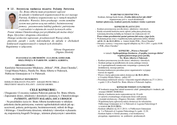 W 12. Rocznicę nadania miastu Puławy Patrona Św. Brata Alberta mam przyjemność zaprosić do udziału w konkursach organizowanych ku czci naszego Patrona. Konkursy organizowane są w ramach miejskich obchodów. Wartości, które przekazuje swoim ziemskim Ŝyciem nasz patron uczą nas miłości, bezinteresownej pomocy, poszanowania ludzkiej godności, patriotyzmu i wytrwałości w dąŜeniu do swoich Ŝyciowych celów. Postać Adama Chmielowskiego jest przykładem jak moŜna słuŜyć Bogu, Ojczyźnie i drugiemu człowiekowi. Dlatego serdecznie zapraszam przedstawicieli Waszej szkoły, placówki, parafii i osoby indywidualne do udziału w obchodach konkursach organizowanych w ramach tych obchodów. Regulaminy w załączeniu. Główny Organizator Zbigniew Śliwiński INAUGURACJA OBCHODÓW- 13.11.2011R. GODZ.18.00. MSZA ŚWIĘTA W PARFII ŚW. ALBRTA ALBERTA. WARUNKI UCZESTNICTWA Konkurs, którego hasło brzmi „Trzeba dobrym być jak chleb” organizowany jest w trzech dziedzinach: konkurs plastyczny, konkurs poetycki, konkurs wiedzy o patronie KONKURS PLASTYCZNY - Konkurs przeznaczony jest dla dzieci, młodzieŜy i dorosłych. - KaŜdy uczestnik konkursu moŜe zgłosić jedną pracę plastyczną wykonaną dowolną techniką na formacie nie większym niŜ A3. Praca winna przedstawiać postać patrona lub scenę z jego Ŝycia. - Wykonaną pracę wraz z wypełnioną kartą zgłoszenia naleŜy składać od 22. 11. do 24.11.2011r. w Galerii Sztuki POK „ Dom Chemika” - Otwarcie wystawy i wręczenie nagród odbędzie się 30.11.2011. o godz.10.00. w POK „Dom Chemika” - ORGANIZATORZY: Katolickie Stowarzyszenie MłodzieŜy „Miłość”, POK „Dom Chemika”, Urząd Miasta Puławy, Parafia Św. Brata Alberta w Puławach, Publiczne Gimnazjum nr 3 w Puławach. PATRONAT HONOROWY: DZIEKAN DEKANATU PUŁAWY - KSIĄDZ PIOTR TRELA PREZYDENT MIASTA PUŁAWY - JANUSZ GROBEL CELE KONKURSU: - Ubogacenie 12-rocznicy nadania Puławom patrona Św. Brata Alberta. - Zapoznanie dzieci, młodzieŜy i dorosłych z postacią A. Chmielowskiego: PATRIOTY, ARTYSTY MALARZA, OJCA UBOGICH. - Na przykładzie Ŝycia św. Brata Alberta kształtowanie w młodym pokoleniu ducha patriotyzmu, wartości ogólnoludzkich takich jak np.: uczciwość, pokora, poświęcenie, bezinteresowność, miłość do Boga i bliźniego.- UmoŜliwienie dzieciom, młodzieŜy i dorosłym wykazania się znajomością biografii Świętego., talentem plastycznym i autorskim. - KONKURS „Wiersz o Patronie” w ramach Ogólnopolskiego Konkursu „O pajdkę razowego chleba” współorganizowanego przez parafię Św. Brata Alberta w Puławach Konkurs przeznaczony jest dla dzieci, młodzieŜy i dorosłych. Konkurs polega na przedłoŜeniu do oceny jednego wiersza (w 4 egzemplarzach) tematycznie związanego z postacią lub działalnością naszego patrona. Komisja konkursowa powołana przez organizatorów wytypuje wiersze do nagród. Wiersz z kartą zgłoszenia naleŜy dostarczyć do 18.11.2011r. w Urzędzie Miasta Puławy - pokój 107. Prezentacja niektórych wierszy i wręczenie nagród odbędzie się 27.11.2011r. o godz.11.30 w Parafii Św. Brata Alberta w Puławach- kaplica . KONKURS WIEDZY O PATRONIE - W konkursie mogą brać udział uczniowie szkół gimnazjalnych i średnich, jak równieŜ OSOBY DOROSŁE - Szkołę w konkursie moŜe reprezentować do 10 osób. (w sprawie ewentualnego zwiększenie ilości osób proszę o kontakt telefoniczny- Zbigniew Śliwiński - 600925248) - Wypełnioną kartę zgłoszenia naleŜy dostarczyć do sekretariatu Publicznego Gimnazjum nr 3 w Puławach ul. Legionu Puławskiego 8 w terminie do 21.11.2011r. - Konkurs odbędzie się 24.11.2011r. w Publicznym Gimnazjum nr 3 w Puławach ul. Legionu Puławskiego 8 o godz. 12.30. - Konkurs będzie w formie pisemnej, a test konkursowy przygotują organizatorzy na podstawie przekazanych w załączeniu materiałów i zamieszczonej biografii na stronie www.um.pulawy.pl w zakładce Nasze Miasto/Patron miasta. KARTA ZGŁOSZENIA KONKURSU Plastycznego Patron Puław- 2011 1. Imię, nazwisko i wiek uczestnika………………….………………… 2. Nazwa, adres i telefon instytucji patronackiej (jeŜeli jest)........................ ………………………………………………………………………………. 3. Imię i nazwisko nauczycieli- opiekunów: ………………………………………………………………………………. Podpis opiekuna……………………. Podpis opiekuna………………………… OBCHODY 12.ROCZNICY NADANIA MIASTU PUŁAWY PATRONA ŚW. BRATA ALBERTA PATRIOTY, ARTYSTY MALARZA, OJCA UBOGICH wytnij…………………………………………………………………… KARTA ZGŁOSZENIA KONKURSU Poetyckiego „Wiersz o Patronie” Patron Puław- 2011 1. Imię, nazwisko i wiek uczestnika ……………………………….. 2. Nazwa, adres i telefon instytucji patronackiej (jeŜeli jest) ………………………………………………………………………………… 3. Imię i nazwisko nauczycieli opiekunów: ………………………. ………………………………………………………………………………… Podpis opiekuna………………………… wytnij……………………………………………………………………… KARTA ZGŁOSZENIA KONKURS WIEDZY O śYCIU PATRONA 24.11.2011r. godz.12.30- Publiczne Gimnazjum nr 3 w Puławach. KARTA ZGŁOSZENIA 1. Nazwa, adres i telefon szkoły……………………………… …………………………………………………………………………………… 2. Imię i nazwisko nauczycieli- opiekunów:…………………………… ……………………………………………………………………………… 3. Imię, nazwisko i klasa uczestników konkursu: 1…………………………………………………2.……………………………… 3……………………