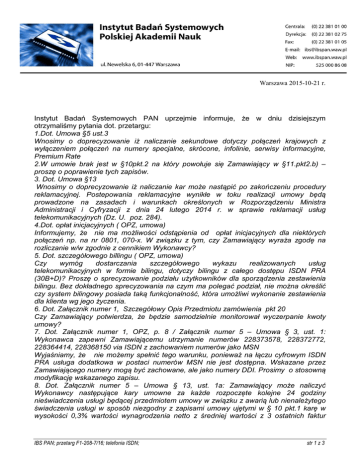 Warszawa 2015-10-21 r. Instytut Badań Systemowych PAN uprzejmie informuje, że w dniu dzisiejszym otrzymaliśmy pytania dot. przetargu: 1.Dot. Umowa §5 ust.3 Wnosimy o doprecyzowanie iż naliczanie sekundowe dotyczy połączeń krajowych z wyłączeniem połączeń na numery specjalne, skrócone, infolinie, serwisy informacyjne, Premium Rate 2.W umowie brak jest w §10pkt.2 na który powołuje się Zamawiający w §11.pkt2.b) – proszę o poprawienie tych zapisów. 3. Dot. Umowa §13 Wnosimy o doprecyzowanie iż naliczanie kar może nastąpić po zakończeniu procedury reklamacyjnej. Postepowania reklamacyjne wynikłe w toku realizacji umowy będą prowadzone na zasadach i warunkach określonych w Rozporządzeniu Ministra Administracji i Cyfryzacji z dnia 24 lutego 2014 r. w sprawie reklamacji usług telekomunikacyjnych (Dz. U. poz. 284). 4.Dot. opłat inicjacyjnych ( OPZ, umowa) Informujemy, że nie ma możliwości odstąpienia od opłat inicjacyjnych dla niektórych połączeń np. na nr 0801, 070-x. W związku z tym, czy Zamawiający wyraża zgodę na rozliczanie w/w zgodnie z cennikiem Wykonawcy? 5. Dot. szczegółowego billingu ( OPZ, umowa) Czy wymóg dostarczania szczegółowego wykazu realizowanych usług telekomunikacyjnych w formie bilingu, dotyczy bilingu z całego dostępu ISDN PRA (30B+D)? Proszę o sprecyzowanie podziału użytkowników dla sporządzenia zestawienia bilingu. Bez dokładnego sprecyzowania na czym ma polegać podział, nie można określić czy system bilingowy posiada taką funkcjonalność, która umożliwi wykonanie zestawienia dla klienta wg jego życzenia. 6. Dot. Załącznik numer 1, Szczegółowy Opis Przedmiotu zamówienia pkt 20 Czy Zamawiający potwierdza, że będzie samodzielnie monitorował wyczerpanie kwoty umowy? 7. Dot. Załącznik numer 1, OPZ, p. 8 / Załącznik numer 5 – Umowa § 3, ust. 1: Wykonawca zapewni Zamawiającemu utrzymanie numerów 228373578, 228372772, 228364414, 228368150 via ISDN z zachowaniem numerów jako MSN Wyjaśniamy, że nie możemy spełnić tego warunku, ponieważ na łączu cyfrowym ISDN PRA usługa dodatkowa w postaci numerów MSN nie jest dostępna. Wskazane przez Zamawiającego numery mogą być zachowane, ale jako numery DDI. Prosimy o stosowną modyfikację wskazanego zapisu. 8. Dot. Załącznik numer 5 – Umowa § 13, ust. 1a: Zamawiający może naliczyć Wykonawcy następujące kary umowne za każde rozpoczęte kolejne 24 godziny nieświadczenia usługi będącej przedmiotem umowy w związku z awarią lub nienależytego świadczenia usługi w sposób niezgodny z zapisami umowy ujętymi w § 10 pkt.1 karę w wysokości 0,3% wartości wynagrodzenia netto z średniej wartości z 3 ostatnich faktur IBS PAN; przetarg F1-208-7/16; telefonia ISDN; str 1 z 3 wystawionych Zamawiającemu za świadczone usługi telekomunikacyjne, gdy czynność określona w § 10 pkt.1 nie zostanie poprawiona w terminach wskazanych w § 11 Czy Zamawiający wyraża zgodę na modyfikacje zapisów w taki sposób, aby były zgodne z Regulaminem SLA Wykonawcy, zgodnie z którym Abonentowi, w przypadku przekroczenia gwarantowanego czasu usunięcia awarii usługi podstawowej, niezależnie od długości tego przekroczenia oraz niezależnie od ilości awarii w danym okresie rozliczeniowym, Orange udziela bonifikaty w wysokości miesięcznego abonamentu za usługę podstawową. Poprośmy o modyfikację wskazanego zapisu 9.Wykonawca zwraca się zatem z pytaniem, czy w razie wyboru oferty Wykonawcy prowadzącego działalność gospodarczą w formie spółki akcyjnej, część komparycyjna Umowy będzie obejmować wszelkie dane wymagane przez art. 374 § 1 ksh (a zatem także informacje o wysokości kapitału zakładowego i kapitału wpłaconego)? 10.Wykonawca mając na uwadze treść § 5 Umowy prosi o potwierdzenie, że czy - mając na uwadze powszechnie akceptowaną w orzecznictwie Europejskiego Trybunału Sprawiedliwości zasadą neutralności VAT dla podatnika, że w ostatecznym rozrachunku podatek ten powinien obciążać odbiorcę towarów i usług, a nie Wykonawcę i w celu uniknięcia konieczności wprowadzania zmian do treści umowy w przypadku zmiany stawki VAT – Zamawiający dopuszcza doprecyzowanie Umowy poprzez zamieszczenie ustępu o treści: „W razie zmiany wysokości obowiązujących stawek VAT dotyczących przedmiotu umowy w okresie obowiązywania niniejszej umowy Zamawiający będzie zobowiązany do zapłaty wynagrodzenia uwzględniającego nową, aktualną wysokość stawek podatku VAT”. 11.Prosimy o potwierdzenie, że stosowanie przewidzianych przez Zamawiającego sankcji w postaci rozwiązania, odstąpienia od umowy oraz kar umownych nie dotyczy sytuacji, w których ewentualne niedotrzymanie terminów lub kryteriów świadczenia usług wynika z okoliczności niezawinionych przez Wykonawcę (jak przykładowo: siła wyższa, przypadek, czy bezprawne działania osób trzecich). Pytanie to ma w swojej podstawie ugruntowaną linię orzeczniczą Sądu Najwyższego, w szczególności wyrażoną w wyroku SN z dnia 20 marca 1968 r. (sygn. akt II CR 419/67) zgodnie z którym, jeżeli niewykonanie lub nienależyte wykonanie danego zobowiązania jest następstwem okoliczności, za które strona zobowiązana nie podnosi odpowiedzialności (art. 471 k. c.), kary umownej nie nalicza się. 12.Czy Zamawiający dopuszcza modyfikację postanowień § 13 Umowy , tak by zawierała również treść „Całkowita suma kar umownych naliczonych Wykonawcy na podstawie umowy nie przekroczy 20% wartości łącznego wynagrodzenia brutto? Odpowiedzi: 1. Tak wymóg naliczania sekundowego nie dotyczy połączeń na numery specjalne, skrócone, infolinie, serwisy informacyjne, Premium Rate 2. Poprawiamy oczywistą pomyłkę pisarską tj. zmieniamy numer punktu umowy „…Dostarczaniu z każdą fakturą…” z §10pkt.3 na §10pkt.2. 3. Zgadzamy się na zapis: naliczanie kar może nastąpić po zakończeniu procedury reklamacyjnej. Postepowania re