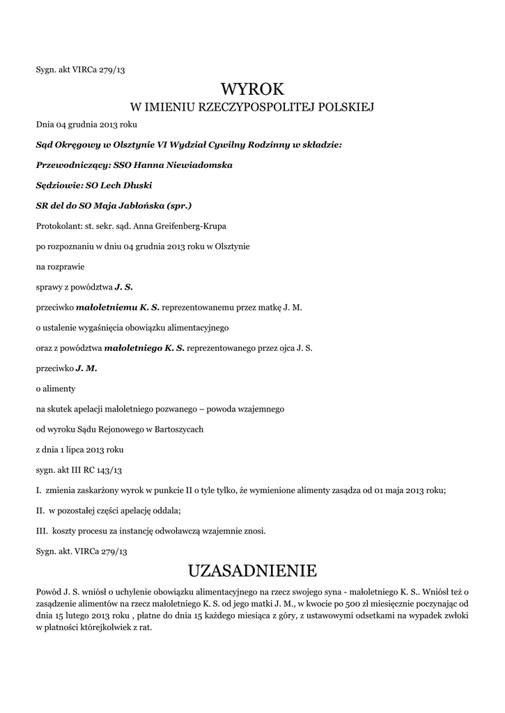 Sygn. akt VIRCa 279/13 WYROK W IMIENIU RZECZYPOSPOLITEJ POLSKIEJ Dnia 04 grudnia 2013 roku Sąd Okręgowy w Olsztynie VI Wydział Cywilny Rodzinny w składzie: Przewodniczący: SSO Hanna Niewiadomska Sędziowie: SO Lech Dłuski SR del do SO Maja Jabłońska (spr.) Protokolant: st. sekr. sąd. Anna Greifenberg-Krupa po rozpoznaniu w dniu 04 grudnia 2013 roku w Olsztynie na rozprawie sprawy z powództwa J. S. przeciwko małoletniemu K. S. reprezentowanemu przez matkę J. M. o ustalenie wygaśnięcia obowiązku alimentacyjnego oraz z powództwa małoletniego K. S. reprezentowanego przez ojca J. S. przeciwko J. M. o alimenty na skutek apelacji małoletniego pozwanego – powoda wzajemnego od wyroku Sądu Rejonowego w Bartoszycach z dnia 1 lipca 2013 roku sygn. akt III RC 143/13 I. zmienia zaskarżony wyrok w punkcie II o tyle tylko, że wymienione alimenty zasądza od 01 maja 2013 roku; II. w pozostałej części apelację oddala; III. koszty procesu za instancję odwoławczą wzajemnie znosi. Sygn. akt. VIRCa 279/13 UZASADNIENIE Powód J. S. wniósł o uchylenie obowiązku alimentacyjnego na rzecz swojego syna - małoletniego K. S.. Wniósł też o zasądzenie alimentów na rzecz małoletniego K. S. od jego matki J. M., w kwocie po 500 zł miesięcznie poczynając od dnia 15 lutego 2013 roku , płatne do dnia 15 każdego miesiąca z góry, z ustawowymi odsetkami na wypadek zwłoki w płatności którejkolwiek z rat. Żądając uchylenia alimentów należnych od niego na rzecz małoletniego K. S., J. S. wskazał, iż postanowieniem Sądu Rejonowego w Bartoszycach z dnia 22 kwietnia 2013 roku ustalono miejsce pobytu małoletniego przy ojcu, zmieniając jednocześnie orzeczenie Sądu Okręgowego w Olsztynie w sprawie VIRC 2227/10 ustalające miejsce pobytu małoletniego przy matce . Obecnie zatem to on ponosi koszty utrzymania dziecka. Uzasadniając powództwo o alimenty J. S. wskazał, iż małoletni jest w III klasie gimnazjum. Od nowego roku szkolnego rozpocznie naukę w szkole średniej. Jest wysokim chłopcem, co skutkuje dużymi wydatkami na odzież. Wskazał również, że koszt zakupu podręczników jest znaczny. Podniósł, że syn ma skłonność do chorób dróg oddechowych. Odnosząc się do swojej sytuacji materialnej i życiowej J. S. podkreślił, że ma z nowego związku córkę, półroczną. Poza tym na utrzymaniu jego i jego żony pozostaje syn żony, na którego ta nie pobiera alimentów. Podał, iż jego żona przebywa na urlopie macierzyńskim. Wskazał, że wydatki mieszkaniowe, które ponosi, to około 960 zł miesięcznie. Jego zarobki zaś to kwota około 1800 zł miesięcznie. Pozwana J. M., w odpowiedzi na pozew, uznała powództwo o alimenty do kwoty po 220 zł poczynając od dnia 01 czerwca 2013r. zaś od kwietnia 2014 roku do kwoty po 300 zł miesięcznie. W uzasadnieniu swojego stanowiska wskazała, że żądana kwota alimentów przekracza jej możliwości płatnicze. Ma dobre relacje z synem K. S., który ją odwiedza i stołuje się u niej. Ponadto, podała, że kupiła małoletniemu obuwie, odzież i ponosiła koszty związane z nauką. Z tytułu pracy zarobkowej osiąga dochód w wysokości 1.340 zł netto miesięcznie. Spłaca pożyczkę kwocie po 400 zł miesięcznie. Opłaty za mieszkanie wynoszą 650 zł. Podniosła też, że ma na utrzymaniu córkę M., urodzoną (...) Sąd Rejonowy w Bartoszycach, wyrokiem z dnia 1 lipca 2013 roku Sąd uchylił obowiązek alimentacyjny J. S. wobec małoletniego K. S., ustalony ostatnio ugodą zawartą przed Sądem Rejonowym w Bartoszycach w sprawie III RC 276/12 z dnia 19 listopada 2012 roku z dniem 1 maja 2013 roku. Jednocześnie Sąd zasądził od pozwanej J. M. na rzecz małoletniego powoda K. S. alimenty w kwocie po 260 zł miesięcznie, płatne do dnia 15 każdego miesiąca z góry, z ustawowymi odsetkami na wypadek zwłoki w płatności którejkolwiek z rat, poczynając od 1 czerwca 2013 roku. Sąd oddalił powództwo w pozostałym zakresie. Sąd Rejonowy w Bartoszycach ustalił, że małoletni K. S., urodził się (...). Obowiązek alimentacyjny J. S.ustalony był wobec małoletniego orzeczeniem Sądu Okręgowego w Olsztynie na kwotę po 200 zł miesięcznie a następnie ugodą zawartą przed Sądem Rejonowym w Bartoszycach w dniu 19 listopada 2012r., w sprawie III RC 276/12, na kwotę po 360 zł miesięcznie. Ponadto postanowieniem Sądu Rejonowego w Bartoszycach z dnia 22 kwietnia 2013r., w sprawie III Nsm 70/13, zmieniono wyrok Sądu Okręgowego w Olsztynie z dnia 28 lutego 2011r.. w sprawie VI RC 2227/10 w ten sposób, że miejsce pobytu małoletniego K. S.ustalono przy ojcu. Sąd ustalił, że małoletni powód zamieszkuje z ojcem. Jest zdrowy i rozwija się prawidłowo. W 2013 roku ukończył naukę w gimnazjum i zamierza uczyć się dalej w Technikum Mechanicznym w B.. Jego ojciec potrzebuje środków pieniężnych na zakup podręczników, odzieży, obuwia, kosmetyków dla małoletniego powoda. Pozwana J. M. zarabia około 1.340 zł netto miesięcznie. Poza wynagrodzeniem za pracę nie ma innych dochodów. Z jej wynagrodzenia potrącana jest kwota 420 zł na spłatę pożyczki zaciągniętej z zakładu pracy na utrzymanie rodziny, w czasie gdy małoletni zamieszkiwał wraz z nią, a J. S. płacił niższe alimenty. J. M. zamieszkuje wraz z mężem i córką z obecnego małżeństwa. Jej mąż zarabia 1.800 zł netto miesięcznie. Ponoszą koszty utrzymania mieszkania w wysokości około 650 zł, uwzględniając wydatki na energię elektryczną. Ponadto J. M. spłaca raty pożyczki w wysokości 204,18 zł miesięcznie, zaciągniętej na zakup laptopa dla syna. Ostateczny termin spłaty tego kredytu upływa w dniu 19 marca 2014r. J. M. opłaca telefon K. S. po 30 zł miesięcznie. Małoletni zawsze, gdy przebywa u pozwanej otrzymuje od matki 10 - 15 zł na bieżące wydatki. Do czerwca 2013r. J. M. kupowała synowi odzież, finansowała wycieczkę. J. S. jest zatrudniony w fabryce mebli. Zarabia około 1.80