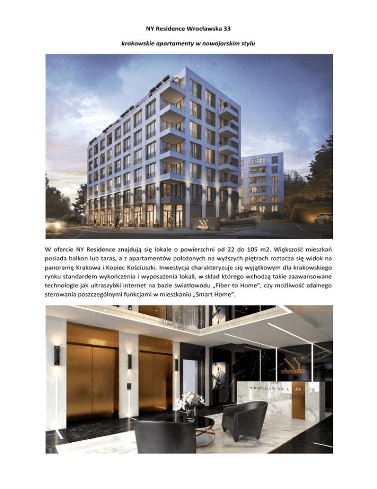 NY Residence Wrocławska 33 krakowskie apartamenty w nowojorskim stylu W ofercie NY Residence znajdują się lokale o powierzchni od 22 do 105 m2. Większość mieszkań posiada balkon lub taras, a z apartamentów położonych na wyższych piętrach roztacza się widok na panoramę Krakowa i Kopiec Kościuszki. Inwestycja charakteryzuje się wyjątkowym dla krakowskiego rynku standardem wykończenia i wyposażenia lokali, w skład którego wchodzą takie zaawansowane technologie jak ultraszybki Internet na bazie światłowodu „Fiber to Home”, czy możliwość zdalnego sterowania poszczególnymi funkcjami w mieszkaniu „Smart Home”. Inwestor NY Residence Wrocławska 33 dużą uwagę przykłada także do funkcjonalności i estetyki części wspólnych. Dla wygody mieszkańców przygotowano parking podziemny na 100 miejsc postojowych z dwoma rowerowniami oraz praktycznymi pomieszczeniami gospodarczymi i boksami użytkowymi. Wejścia do budynku, lobby i korytarze zaprojektowane zostały w sposób wyraźnie nawiązujący do nowojorskich apartamentowców. Ich elegancki wystrój podkreśli doskonale dobrane oświetlenie LED i dyskretna muzyka. Lobby wykończone zostanie z zastosowaniem naturalnego kamienia i innych szlachetnych materiałów. Nowoczesnego sznytu dodadzą panele dotykowe wind oraz multimedialny ekran informacyjny znajdujący się przy recepcji. Nad bezpieczeństwem mieszkańców czuwać będzie concierge, ochrona oraz biometryczny system dostępu. Wejście do budynku prowadzi przez wewnętrzny zaciszny dziedziniec ze specjalnie zaprojektowaną zielenią i małą architekturą. Inwestycja powstaje w atrakcyjnej lokalizacji, w dzielnicy Krowodrza, niecałe 2 km od Starego Miasta, z pełną własnością hipoteczną gruntu. W bezpośrednim sąsiedztwie mieszkańcy znajdą niezbędne punkty usługowe i handlowe, w tym bardzo popularny plac targowy Nowy Kleparz oferujący produkty ekologiczne i zdrową żywność. Bliskość parków oraz historycznej starówki zapewnia szeroką paletę możliwości rozrywki i rekreacji. Miejsce to jest również doskonale skomunikowane z resztą miasta. Więcej informacji na stronie inwestycji: http://nyresidence.pl/ O INWESTORZE Terra Casa S.A. jest inwestorem i deweloperem działającym ponad 19 lat na rynku nieruchomości. Spółka wchodzi w skład Grupy Kapitałowej TC Forum i implementuje w swoich strukturach międzynarodowe wzorce i doświadczenia. Dzięki współpracy z bankami, funduszami i instytucjami finansującymi o globalnym zasięgu, efektywnie pozyskuje finansowanie realizowanych projektów. Terra Casa realizuje nowoczesne wielofunkcyjne i mieszkaniowe przedsięwzięcia inwestycyjne z zakresu zrównoważonego rozwoju. Spółka posiada swoje oddziały w Warszawie i Krakowie i wybiera projekty znajdujące się w unikalnych lokalizacjach lub w centrach miast. W procesie inwestycyjnym dba o atrakcyjny wygląd bryły, wysoki standard wykończenia, bezpieczeństwo i funkcjonalność wnętrz tak, aby zapewnić mieszkańcom i użytkownikom atrakcyjne miejsce do życia i pracy. Tworzy dodatkową wartość, którą bardzo cenią sobie klienci. Dodatkowe informacje na stronie: http://terracasa.pl/