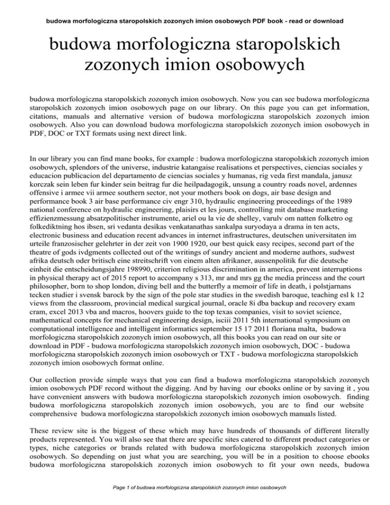 budowa morfologiczna staropolskich zozonych imion osobowych PDF book - read or download budowa morfologiczna staropolskich zozonych imion osobowych budowa morfologiczna staropolskich zozonych imion osobowych. Now you can see budowa morfologiczna staropolskich zozonych imion osobowych page on our library. On this page you can get information, citations, manuals and alternative version of budowa morfologiczna staropolskich zozonych imion osobowych. Also you can download budowa morfologiczna staropolskich zozonych imion osobowych in PDF, DOC or TXT formats using next direct link. In our library you can find mane books, for example : budowa morfologiczna staropolskich zozonych imion osobowych, splendors of the universe, industrie katangaise realisations et perspectives, ciencias sociales y educacion publicacion del departamento de ciencias sociales y humanas, rig veda first mandala, janusz korczak sein leben fur kinder sein beitrag fur die heilpadagogik, unsung a country roads novel, ardennes offensive i armee vii armee southern sector, not your mothers book on dogs, air base design and performance book 3 air base performance civ engr 310, hydraulic engineering proceedings of the 1989 national conference on hydraulic engineering, plaisirs et les jours, controlling mit database marketing effizienzmessung absatzpolitischer instrumente, ariel ou la vie de shelley, varulv om natten folketro og folkediktning hos ibsen, sri vedanta desikas venkatanathas sankalpa suryodaya a drama in ten acts, electronic business and education recent advances in internet infrastructures, deutschen universitaten im urteile franzosischer gelehrter in der zeit von 1900 1920, our best quick easy recipes, second part of the theatre of gods ivdgments collected out of the writings of sundry ancient and moderne authors, sudwest afrika deutsch oder britisch eine streitschrift von einem alten afrikaner, aussenpolitik fur die deutsche einheit die entscheidungsjahre 198990, criterion religious discrimination in america, prevent interruptions in physical therapy act of 2015 report to accompany s 313, mr and mrs gg the media princess and the court philosopher, born to shop london, diving bell and the butterfly a memoir of life in death, i polstjarnans tecken studier i svensk barock by the sign of the pole star studies in the swedish baroque, teaching esl k 12 views from the classroom, provincial medical surgical journal, oracle 8i dba backup and recovery exam cram, excel 2013 vba and macros, hoovers guide to the top texas companies, visit to soviet science, mathematical concepts for mechanical engineering design, isciii 2011 5th international symposium on computational intelligence and intelligent informatics september 15 17 2011 floriana malta, budowa morfologiczna staropolskich zozonych imion osobowych, all this books you can read on our site or download in PDF - budowa morfologiczna staropolskich zozonych imion osobowych, DOC - budowa morfologiczna staropolskich zozonych imion osobowych or TXT - budowa morfologiczna staropolskich zozonych imion osobowych format online. Our collection provide simple ways that you can find a budowa morfologiczna staropolskich zozonych imion osobowych PDF record without the digging. And by having our ebooks online or by saving it , you have convenient answers with budowa morfologiczna staropolskich zozonych imion osobowych. finding budowa morfologiczna staropolskich zozonych imion osobowych, you are to find our website comprehensive budowa morfologiczna staropolskich zozonych imion osobowych manuals listed. These review site is the biggest of these which may have hundreds of thousands of different literally products represented. You will also see that there are specific sites catered to different product categories or types, niche categories or brands related with budowa morfologiczna staropolskich zozonych imion osobowych. So depending on just what you are searching, you will be in a position to choose ebooks budowa morfologiczna staropolskich zozonych imion osobowych to fit your own needs, budowa Page 1 of budowa morfologiczna staropolskich zozonych imion osobowych budowa morfologiczna staropolskich zozonych imion osobowych PDF book - read or download morfologiczna staropolskich zozonych imion osobowych. Page 2 of budowa morfologiczna staropolskich zozonych imion osobowych