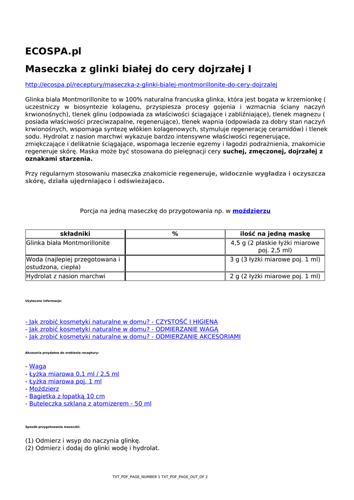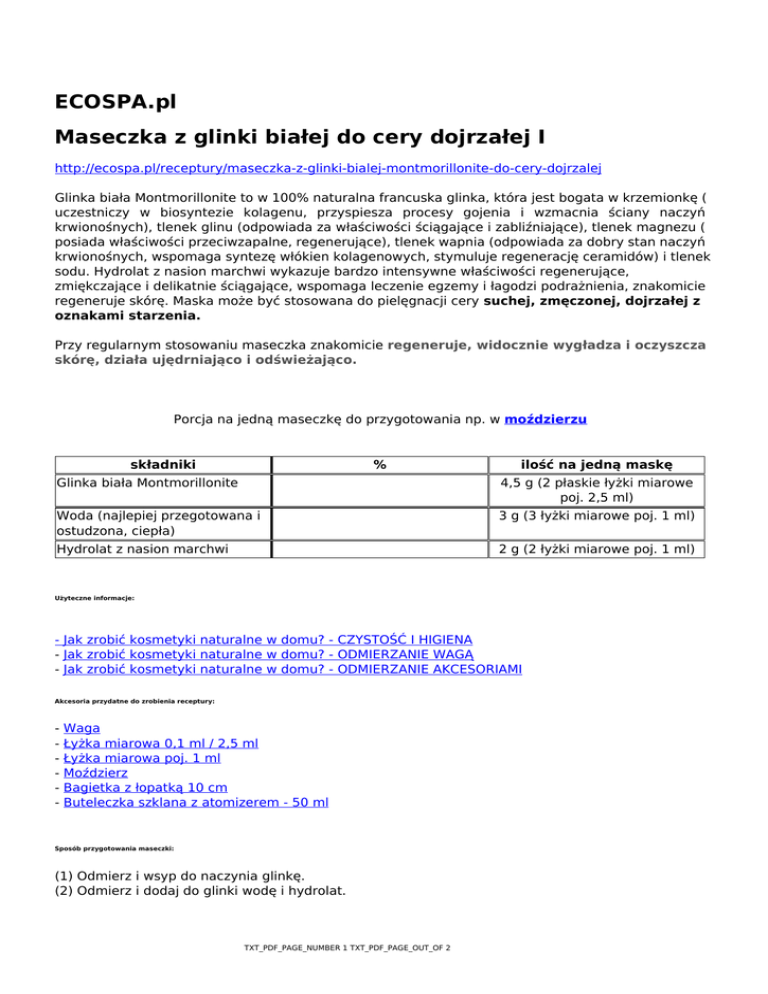 ECOSPA.pl Maseczka z glinki białej do cery dojrzałej I http://ecospa.pl/receptury/maseczka-z-glinki-bialej-montmorillonite-do-cery-dojrzalej Glinka biała Montmorillonite to w 100% naturalna francuska glinka, która jest bogata w krzemionkę ( uczestniczy w biosyntezie kolagenu, przyspiesza procesy gojenia i wzmacnia ściany naczyń krwionośnych), tlenek glinu (odpowiada za właściwości ściągające i zabliźniające), tlenek magnezu ( posiada właściwości przeciwzapalne, regenerujące), tlenek wapnia (odpowiada za dobry stan naczyń krwionośnych, wspomaga syntezę włókien kolagenowych, stymuluje regenerację ceramidów) i tlenek sodu. Hydrolat z nasion marchwi wykazuje bardzo intensywne właściwości regenerujące, zmiękczające i delikatnie ściągające, wspomaga leczenie egzemy i łagodzi podrażnienia, znakomicie regeneruje skórę. Maska może być stosowana do pielęgnacji cery suchej, zmęczonej, dojrzałej z oznakami starzenia. Przy regularnym stosowaniu maseczka znakomicie regeneruje, widocznie wygładza i oczyszcza skórę, działa ujędrniająco i odświeżająco. Porcja na jedną maseczkę do przygotowania np. w moździerzu składniki % ilość na jedną maskę Glinka biała Montmorillonite 4,5 g (2 płaskie łyżki miarowe poj. 2,5 ml) Woda (najlepiej przegotowana i ostudzona, ciepła) 3 g (3 łyżki miarowe poj. 1 ml) Hydrolat z nasion marchwi 2 g (2 łyżki miarowe poj. 1 ml) Użyteczne informacje: - Jak zrobić kosmetyki naturalne w domu? - CZYSTOŚĆ I HIGIENA - Jak zrobić kosmetyki naturalne w domu? - ODMIERZANIE WAGĄ - Jak zrobić kosmetyki naturalne w domu? - ODMIERZANIE AKCESORIAMI Akcesoria przydatne do zrobienia receptury: - Waga - Łyżka miarowa 0,1 ml / 2,5 ml - Łyżka miarowa poj. 1 ml - Moździerz - Bagietka z łopatką 10 cm - Buteleczka szklana z atomizerem - 50 ml Sposób przygotowania maseczki: (1) Odmierz i wsyp do naczynia glinkę. (2) Odmierz i dodaj do glinki wodę i hydrolat. TXT_PDF_PAGE_NUMBER 1 TXT_PDF_PAGE_OUT_OF 2 (3) Odczekaj 2-3 minuty aż glinka zaabsorbuje wodę i hydrolat, wymieszaj. Instrukcja użycia maseczki: (1) Umyj twarz, np. bazowym żelem do mycia EKOLOGICZNYM. (2) Wykonując kuliste ruchy, delikatnie masując skórę opuszkami palców, rozprowadź maseczkę po twarzy omijając oczy i usta. Maseczkę pozostaw na ok. 15 minut. (3) Aby maska nie wyschła co jakiś czas spryskaj twarz wodą używając np. buteleczki z atomizerem. Nie dopuść do przesuszenia maski, gdyż jej zaschnięcie może spowodować zaczerwienienie i podrażnienie skóry. (4) Spłucz maseczkę obficie ciepłą, ale nie gorącą wodą. (5) W celu przywrócenia prawidłowego pH skóry użyj do przemycia twarzy hydrolat*. Może to być hydrolat z nasion marchwi użyty w recepturze. (6) Nałóż na twarz nawilżający krem np. z bazy kremowej EKOLOGICZNEJ. Przechowywanie stosowanie termin przydatności w lodówce 1-2 razy w tygodniu 2-3 dni * Hydrolaty posiadają odczyn kwaśny w zakresie 2,5 - 6,5, z tego względu świetnie sprawdzają się jako toniki. TXT_PDF_PAGE_NUMBER 2 TXT_PDF_PAGE_OUT_OF 2