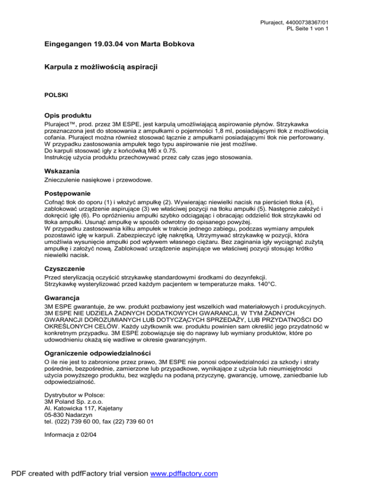 Pluraject, 44000738367/01 PL Seite 1 von 1 Eingegangen 19.03.04 von Marta Bobkova Karpula z możliwością aspiracji POLSKI Opis produktu Pluraject™, prod. przez 3M ESPE, jest karpulą umożliwiającą aspirowanie płynów. Strzykawka przeznaczona jest do stosowania z ampułkami o pojemności 1,8 ml, posiadającymi tłok z możliwością cofania. Pluraject można również stosować łącznie z ampułkami posiadającymi tłok nie perforowany. W przypadku zastosowania ampułek tego typu aspirowanie nie jest możliwe. Do karpuli stosować igły z końcówką M6 x 0.75. Instrukcję użycia produktu przechowywać przez cały czas jego stosowania. Wskazania Znieczulenie nasiękowe i przewodowe. Postępowanie Cofnąć tłok do oporu (1) i włożyć ampułkę (2). Wywierając niewielki nacisk na pierścień tłoka (4), zablokować urządzenie aspirujące (3) we właściwej pozycji na tłoku ampułki (5). Następnie założyć i dokręcić igłę (6). Po opróżnieniu ampułki szybko odciągając i obracając oddzielić tłok strzykawki od tłoka ampułki. Usunąć ampułkę w sposób odwrotny do opisanego powyżej. W przypadku zastosowania kilku ampułek w trakcie jednego zabiegu, podczas wymiany ampułek pozostawić igłę w karpuli. Zabezpieczyć igłę nakrętką. Utrzymywać strzykawkę w pozycji, która umożliwia wysunięcie ampułki pod wpływem własnego ciężaru. Bez zaginania igły wyciągnąć zużytą ampułkę i założyć nową. Zablokować urządzenie aspirujące we właściwej pozycji stosując krótko niewielki nacisk. Czyszczenie Przed sterylizacją oczyścić strzykawkę standardowymi środkami do dezynfekcji. Strzykawkę wysterylizować przed każdym pacjentem w temperaturze maks. 140°C. Gwarancja 3M ESPE gwarantuje, że ww. produkt pozbawiony jest wszelkich wad materiałowych i produkcyjnych. 3M ESPE NIE UDZIELA ŻADNYCH DODATKOWYCH GWARANCJI, W TYM ŻADNYCH GWARANCJI DOROZUMIANYCH LUB DOTYCZĄCYCH SPRZEDAŻY, LUB PRZYDATNOŚCI DO OKREŚLONYCH CELÓW. Każdy użytkownik ww. produktu powinien sam określić jego przydatność w konkretnym przypadku. 3M ESPE zobowiązuje się do naprawy lub wymiany produktów, które po udowodnieniu okażą się wadliwe w okresie gwarancyjnym. Ograniczenie odpowiedzialności O ile nie jest to zabronione przez prawo, 3M ESPE nie ponosi odpowiedzialności za szkody i straty pośrednie, bezpośrednie, zamierzone lub przypadkowe, wynikające z użycia lub nieumiejętności użycia powyższego produktu, bez względu na podaną przyczynę, gwarancję, umowę, zaniedbanie lub odpowiedzialność. Dystrybutor w Polsce: 3M Poland Sp. z.o.o. Al. Katowicka 117, Kajetany 05-830 Nadarzyn tel. (022) 739 60 00, fax (22) 739 60 01 Informacja z 02/04 PDF created with pdfFactory trial version www.pdffactory.com Pluraject, 44000738367/01 PL Seite 2 von 2 PDF created with pdfFactory trial version www.pdffactory.com