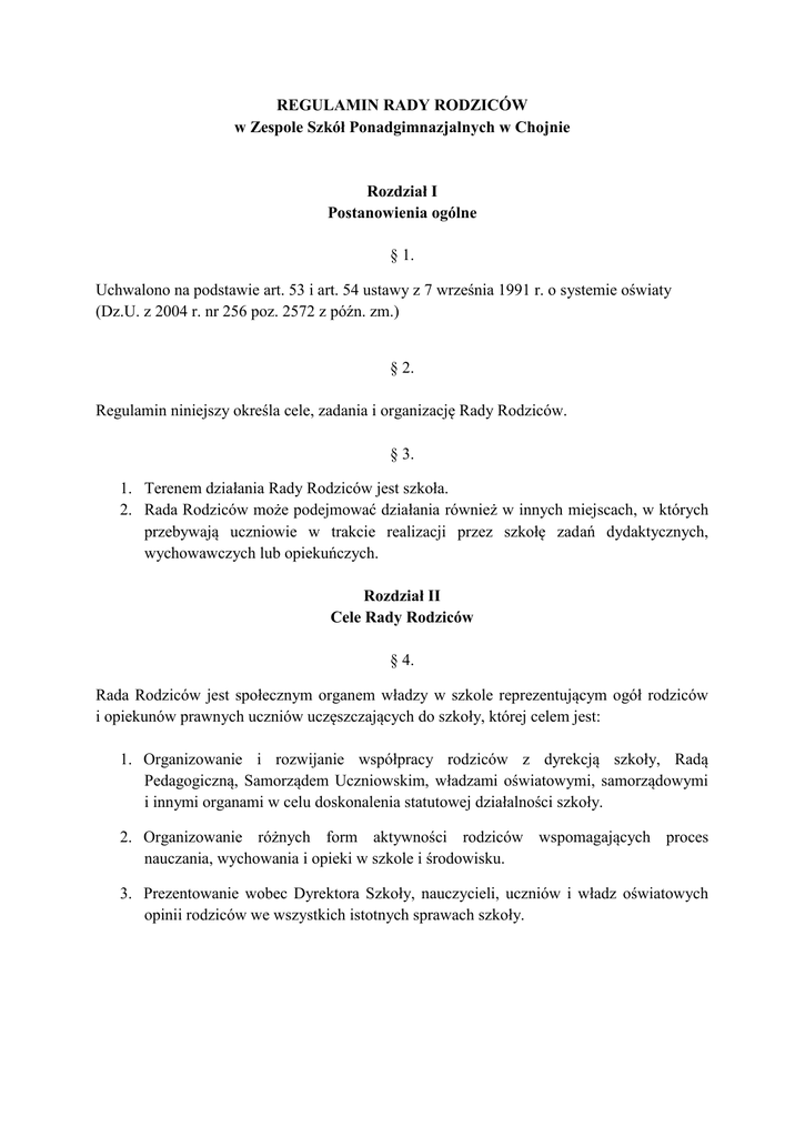 REGULAMIN RADY RODZICÓW w Zespole Szkół Ponadgimnazjalnych w Chojnie Rozdział I Postanowienia ogólne § 1. Uchwalono na podstawie art. 53 i art. 54 ustawy z 7 września 1991 r. o systemie oświaty (Dz.U. z 2004 r. nr 256 poz. 2572 z późn. zm.) § 2. Regulamin niniejszy określa cele, zadania i organizację Rady Rodziców. § 3. 1. Terenem działania Rady Rodziców jest szkoła. 2. Rada Rodziców może podejmować działania również w innych miejscach, w których przebywają uczniowie w trakcie realizacji przez szkołę zadań dydaktycznych, wychowawczych lub opiekuńczych. Rozdział II Cele Rady Rodziców § 4. Rada Rodziców jest społecznym organem władzy w szkole reprezentującym ogół rodziców i opiekunów prawnych uczniów uczęszczających do szkoły, której celem jest: 1. Organizowanie i rozwijanie współpracy rodziców z dyrekcją szkoły, Radą Pedagogiczną, Samorządem Uczniowskim, władzami oświatowymi, samorządowymi i innymi organami w celu doskonalenia statutowej działalności szkoły. 2. Organizowanie różnych form aktywności rodziców wspomagających proces nauczania, wychowania i opieki w szkole i środowisku. 3. Prezentowanie wobec Dyrektora Szkoły, nauczycieli, uczniów i władz oświatowych opinii rodziców we wszystkich istotnych sprawach szkoły. Rozdział III Zadania i kompetencje Rady Rodziców § 5. 1. Rada Rodziców uchwala Regulamin Rady Rodziców, w którym określa szczegółowo: 1) wewnętrzną strukturę i tryb pracy; 2) szczegółowy tryb wyborów do Rady Rodziców i Rady Klasy; 3) zasady wydatkowania funduszy Rady Rodziców. 2. Regulamin Rady Rodziców nie może być sprzeczny z zapisami Statutu Zespołu Szkół Ponadgimnazjalnych w Chojnie. 3. Rada Rodziców może gromadzić fundusze z dobrowolnych składek rodziców oraz innych źródeł w celu wspierania działalności statutowej szkoły. 4. Rada Rodziców w ramach kompetencji stanowiących: 1) uchwala w porozumieniu z Radą Pedagogiczną Program wychowawczy; 2) uchwala w porozumieniu z Radą Pedagogiczną Program profilaktyki. 5. Programy, o których mowa w ust. 9 Rada Rodziców uchwala w terminie 30 dni od rozpoczęcia roku szkolnego, po wcześniejszym uzyskaniu porozumienia z Radą Pedagogiczną. 6. W przypadku, gdy w terminie 30 dni od rozpoczęcia roku szkolnego Rada Rodziców nie uzyska porozumienia z Radą Pedagogiczną w sprawie Programów wychowawczego i profilaktyki, programy te ustala Dyrektor Szkoły w uzgodnieniu z organem sprawującym nadzór pedagogiczny. Program ustalony przez Dyrektora Szkoły obowiązuje do czasu uchwalenia programu przez Radę Rodziców w porozumieniu z Radą Pedagogiczną. 7. Rada Rodziców w szczególności wyraża opinię o: 1) projekcie planu finansowego Szkoły składanego przez Dyrektora Szkoły; 2) pracy nauczyciela do ustalenia oceny dorobku zawodowego za okres stażu; 3) dodatkowych zajęciach edukacyjnych; 4) przedmiotach realizowanych w zakresie rozszerzonym; 5) programie i harmonogramie poprawy efektywności wychowania i kształcenia, w przypadku, gdy nadzór pedagogiczny poleca taki opracować; 6) formach realizacji co najwyżej dwóch godzin wychowania fizycznego; 7) dodatkowych dniach wolnych od zajęć dydaktycznych. § 6. Rada Rodziców ma prawo delegowania przedstawiciela do komisji konkursowej wyłaniającej kandydata na stanowisko Dyrektora. Rozdział IV Tryb przeprowadzania wyborów § 7. Tryb przeprowadzenia wyborów do Rady Klasy: 1. W każdym oddziale utworzonym w szkole tworzy się trzyosobową Radę Klasy 2. Wybory przeprowadza wychowawca klasy na pierwszym zebraniu rodziców, do 30. września każdego roku szkolnego. 3. Rada Klasy wybierana jest w wyborach tajnych spośród kandydatów zgłoszonych za ich zgodą, przez rodziców uczniów danego oddziału. 4. W wyborach jednego ucznia może reprezentować tylko jeden rodzic. 5. Za wybranych do Rady Klasy uważa się trzech pierwszych kandydatów, którzy uzyskali największą liczbę głosów. 6. W przypadku równej liczby głosów otrzymanych przez kandydatów przeprowadza się kolejną turę głosowania. 7. Z przeprowadzonych wyborów sporządza się protokół, który wychowawca klasy przekazuje Dyrektorowi Szkoły. 8. Wybrani członkowie Rady Klasy wyłaniają ze swojego grona przewodniczącego. § 8. Tryb przeprowadzenia wyborów do Rady Rodziców i Prezydium: 1. Przedstawicielem danego oddziału do Rady Rodziców jest przewodniczący Rady Klasy wybrany na pierwszym zebraniu rodziców. 2. Wybory Prezydium Rady Rodziców prowadzi Przewodniczący Rady Rodziców, pełniący w tym czasie obowiązki. 3. Wybory Prezydium Rady Rodziców przeprowadza się w głosowaniu jawnym. 4. W skład Prezydium Rady Rodziców wchodzą wybrani przez Radę Rodziców: 1) przewodniczący, 2) zastępca przewodniczącego, 3) skarbnik, 4) sekretarz, 5) członek. 5. Kandydat na Przewodniczącego Rady Rodziców musi wyrazić zgodę na kandydowanie. 6. Za wybranego Przewodniczącego Rady Rodziców uważa się kandydata, który uzyskał największą liczbę głosów. 7. W przypadku otrzymania przez kandydatów równej największej liczby głosów o wyborze Przewodniczącego Rady Rodziców rozstrzyga kolejna tura wyborów. 8. Wybrany Przewodniczący Rady Rodziców prowadzi dalszą część zebrania. Rozdział V Struktura Rady Rodziców § 9. 1. W skład Rady Rodziców wchodzi po jednym przedstawicielu Rad Klas, wybranych przez zebranie rodziców uczniów danego oddziału. 2. Pracami Rady Rodziców kieruje Prezydium, w którego skład wchodzi: 1) przewodniczący, 2) zastępca przewodniczącego, 3) skarbnik, 4) sekretarz, 5) członek. 3. Kadencja Prezydium trwa trzy lata. 4. W razie ustania członkostwa w Prezydium przed upływem kadencji, na najbliższym zebraniu rodziców przeprowadzane są wybory uzupełniające, na okres do końca kadencji. 5. Rada Rodziców może odwołać Prezydium w całości lub dokonać wyboru nowych jego członków w trybie wyborów uzupełniających. 6. Rada Rodziców może