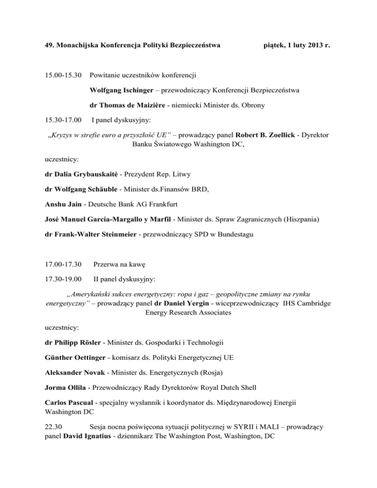 49. Monachijska Konferencja Polityki Bezpieczeństwa 15.00-15.30 piątek, 1 luty 2013 r. Powitanie uczestników konferencji Wolfgang Ischinger – przewodniczący Konferencji Bezpieczeństwa dr Thomas de Maizière - niemiecki Minister ds. Obrony 15.30-17.00 I panel dyskusyjny: „Kryzys w strefie euro a przyszłość UE” – prowadzący panel Robert B. Zoellick - Dyrektor Banku Światowego Washington DC, uczestnicy: dr Dalia Grybauskaitė - Prezydent Rep. Litwy dr Wolfgang Schäuble - Minister ds.Finansów BRD, Anshu Jain - Deutsche Bank AG Frankfurt José Manuel García-Margallo y Marfil - Minister ds. Spraw Zagranicznych (Hiszpania) dr Frank-Walter Steinmeier - przewodniczący SPD w Bundestagu 17.00-17.30 Przerwa na kawę 17.30-19.00 II panel dyskusyjny: „Amerykański sukces energetyczny: ropa i gaz – geopolityczne zmiany na rynku energetyczny” – prowadzący panel dr Daniel Yergin - wiceprzewodniczący IHS Cambridge Energy Research Associates uczestnicy: dr Philipp Rösler - Minister ds. Gospodarki i Technologii Günther Oettinger - komisarz ds. Polityki Energetycznej UE Aleksander Novak - Minister ds. Energetycznych (Rosja) Jorma Ollila - Przewodniczący Rady Dyrektorów Royal Dutch Shell Carlos Pascual - specjalny wysłannik i koordynator ds. Międzynarodowej Energii Washington DC 22.30 Sesja nocna poświęcona sytuacji politycznej w SYRII i MALI – prowadzący panel David Ignatius - dziennikarz The Washington Post, Washington, DC a) sytuacja w Syrii uczestnicy: Lakhdar Brahimi - specjalny przedstawiciel ONZ i Ligi Państw Arabskich ds. Syrii (NY) Sheikh Moaz Al-Khatib - Przewodniczący Opozycyjnej Krajowej Koalicji Syryjskich Sił Rewolucyjnych (Kair) Kenneth Roth - Dyrektor Wykonawczy, Human Rights Watch (NY) b) sytuacja w Mali uczestnicy: Jean-Claude Mallet - Minister ds. Obrony (Francja)