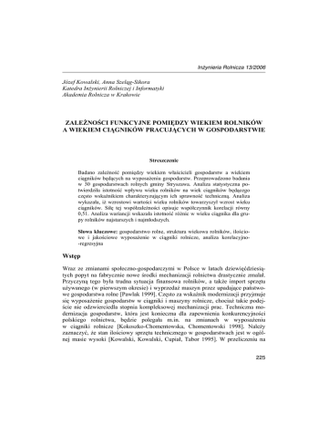 Inżynieria Rolnicza 13/2006 Józef Kowalski, Anna Szeląg-Sikora Katedra Inżynierii Rolniczej i Informatyki Akademia Rolnicza w Krakowie ZALEŻNOŚCI FUNKCYJNE POMIĘDZY WIEKIEM ROLNIKÓW A WIEKIEM CIĄGNIKÓW PRACUJĄCYCH W GOSPODARSTWIE Streszczenie Badano zależność pomiędzy wiekiem właścicieli gospodarstw a wiekiem ciągników będących na wyposażeniu gospodarstw. Przeprowadzono badania w 30 gospodarstwach rolnych gminy Stryszawa. Analiza statystyczna potwierdziła istotność wpływu wieku rolników na wiek ciągników będącego często wskaźnikiem charakteryzującym ich sprawność techniczną. Analiza wykazała, iż wzrostowi wartości wieku rolników towarzyszył wzrost wieku ciągników. Siłę tej współzależności opisuje współczynnik korelacji równy 0,51. Analiza wariancji wskazała istotność różnic w wieku ciągnika dla grupy rolników najstarszych i najmłodszych. Słowa kluczowe: gospodarstwo rolne, struktura wiekowa rolników, ilościowe i jakościowe wyposażenie w ciągniki rolnicze, analiza korelacyjno-regresyjna Wstęp Wraz ze zmianami społeczno-gospodarczymi w Polsce w latach dziewięćdziesiątych popyt na fabrycznie nowe środki mechanizacji rolnictwa drastycznie zmalał. Przyczyną tego była trudna sytuacja finansowa rolników, a także import sprzętu używanego (w pierwszym okresie) i wyprzedaż maszyn przez upadające państwowe gospodarstwa rolne [Pawlak 1999]. Często za wskaźnik modernizacji przyjmuje się wyposażenie gospodarstw w ciągniki i maszyny rolnicze, chociaż takie podejście nie odzwierciedla stopnia kompleksowej mechanizacji prac. Techniczna modernizacja gospodarstw, która jest konieczna dla zapewnienia konkurencyjności polskiego rolnictwa, będzie polegała m.in. na zmianach w wyposażeniu w ciągniki rolnicze [Kokoszko-Chomentowska, Chomentowski 1998]. Należy zaznaczyć, że stan ilościowy sprzętu technicznego w gospodarstwach jest w ogólnej masie wysoki [Kowalski, Kowalski, Cupiał, Tabor 1995]. W przeliczeniu na 225 Józef Kowalski, Anna Szeląg-Sikora 100 ha UR w Polsce przypadało w 2000 roku 8,5 ciągnika fizycznego [Rocznik Statystyczny 2000]. W 1998 roku średni wiek ciągników wynosił około 18 lat [Wójcicki i in. 2000]. Wynika to z systemu nasycenia rolnictwa środkami technicznymi w minionej epoce. W mirę upływu czasu sprzęt ten ulega zużyciu nie tylko technicznemu, ale również ekonomicznemu. W chwili obecnej jest to bardzo często sprzęt wieloletni, wyeksploatowany i przestarzały. W związku z tym należy się liczyć z faktem, że znaczna część maszyn i ciągników musi być wycofana z eksploatacji w rolnictwie. Wprowadzenie na ich miejsce nowych, relatywnie drogich środków technicznych będzie możliwe tylko po spełnienia odpowiednich warunków ekonomicznych. Podstawowy warunek dotyczy zapewnienia odpowiedniego rocznego wykorzystania zakupionego sprzętu [Kowalski J., Kowalski S., Cupiał, Tabor 1995]. Niewątpliwie modernizacja zaplecza technicznego polskich gospodarstw uzależniona jest również od tzw. czynników pozaekonomicznych, m.in. wieku właścicieli gospodarstw. Wydaje się, że niekorzystnym bodźcem było dotychczasowe obniżanie się średniej wieku rolników. Zatrzymania postępującego procesu starzenia się społeczności polskiej w środowisku wiejskim, należy upatrywać w przyspieszonym tempie formalnie („na papierze”) przekazywania gospodarstw młodszym następcom w wyniku upowszechniania się korzystnego sytemu emerytalnego dla rolników. Cel, zakres i metodyka badań Niezadowalający stan wyposażenia technicznego polskich gospodarstw, w tym w ciągniki rolnicze nasuwa konieczność prowadzenia badań w tym kierunku. Przyczyn takiego stanu rzeczy nie należy upatrywać wyłącznie w braku płynności ekonomicznej gospodarstw. Należy pójść dalej i uwzględnić m.in. aspekty socjologiczno – demograficzne, wśród których jednym z ważniejszych wydaje się być wiek właściciela gospodarstwa. Dlatego autorzy w niniejszym opracowaniu weryfikują hipotezę o istotnym wpływie wieku rolników na jakościowy stan ciągników rolniczych. Za zasadniczy, czynnik uznano wiek ciągników pracujących w gospodarstwie. Do badań wybrano tą grupę środków technicznych gdyż one uznawane są powszechnie za wiodące i najbardziej reprezentatywne. Weryfikacji tej dokonano zakładając istnienie istotnej współzależności pomiędzy wiekiem rolników a wiekiem ciągników rolniczych. Przyjmując wiek jako jeden ze wskaźników odzwierciadlających sprawność techniczną i ekonomiczną ciągników. Wiodąca rola ciągników szczególnie uwidacznia się w gospodarstwach o szczególnie trudnych warunkach geograficznych oraz mocno rozdrobnionych, a więc słabych ekonomicznie. Do takich zaliczamy w naszych warunkach gospodarstwa funkcjonujące w rejonach górskich. Biorąc powyższe pod uwagę zakresem badań objętych zostało 30 gospodarstw zlokalizowanych na terenie górskiej gminy Stryszawa w woj. małopolskim. Badania przeprowadzone zostały jedną z metod stosowanych 226 Zależności funkcyjne... w Katedrze Inżynierii Rolniczej Informatyki tj. wywiadu kierowanego. Obliczenia statystyczne zostały ukierunkowane na analizę korelacyjno – regresyjną oraz analizę wariancji. Wyniki badań Wiek właściciela gospodarstwa jako pierwszorzędny czynnik demograficzny warunkuje przemiany polskiego rolnictwa. Zadano pytanie w jakim stopniu warunkuje on przemiany w regionach szczególnie trudnych, jakimi są tereny górskie i podgórskie? Autorzy podjęli próbę naświetlenia tego problemu w niniejszej pracy. Przyjęta do badań populacja rolników mieściła się pomiędzy 24 (najmłodszy) a 69 (najstarszy) lat. Średnia wieku dla całej populacji wyniosła 46,12 lat. Odchylenie standardowe było wysokie i kształtowało się na poziomie 9,82 lat. Chcąc ocenić relacje pomiędzy obydwoma porównywanymi czynnikami w obrębie pewnych grup wiekowych – warunkujących 