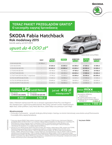 TERAZ PAKIET PRZEGLĄDÓW GRATIS* O szczegóły zapytaj Sprzedawcę ŠKODA Fabia Hatchback Rok modelowy 2015 Cennik ważny od 04.11.2014 upust do 4 000 zł* www.skoda-auto.pl/fabia EASY ACTIVE PLUS FRESH AMBITION PLUS FRESH PLUS ELEGANCE PLUS 1.2/44 kW (60 KM) 37 700 zł – – – – – 1.2/51 kW (70 KM) – 41 349 zł 42 699 zł 44 399 zł 47 699 zł 51 399 zł 1.4 16V/63 kW (85 KM) – 42 649 zł 43 999 zł 45 699 zł 48 999 zł 52 699 zł 1.2 TSI/63 kW (85 KM) – 45 149 zł 46 499 zł 47 199 zł 50 499 zł 54 199 zł 1.2 TSI/77 kW (105 KM) – 47 149 zł 48 499 zł 48 699 zł 51 999 zł 55 699 zł 1.2 TSI/77 kW (105 KM) DSG, 7-stopniowa – 51 749 zł 53 099 zł 53 299 zł 56 599 zł 60 299 zł 1.6 TDI CR DPF/55 kW (75 KM) – 51 649 zł 52 999 zł 54 699 zł 57 999 zł 61 699 zł 1.6 TDI CR DPF/66 kW (90 KM) – 53 649 zł 54 999 zł 56 699 zł 59 999 zł 63 699 zł 1.6 TDI CR DPF/77 kW (105 KM) – 55 649 zł 56 999 zł 58 699 zł 61 999 zł 65 699 zł Instalacja LPG Landi Renzo Dla silnika 1.2 MPI/51 kW (70KM) Dla silnika 1.4 16V/63 kW (85 KM) 4 490 zł 4 790 zł 419 zł już od miesięcznie** Fabia z Pakietami stylistycznymi RS oraz w wersjach wyposażenia Fresh Plus oraz Elegance Plus dostępna jest z ograniczoną paletą kolorów: Biel Candy, Czerwień Corrida, metalizowanych: Błękit Race, Srebrny Brilliant, Szary Metal, Biel Moon, Zieleń Rallye oraz perłowym Czerń Magic Pakiet mixx dla wersji Ambition Plus > przednie reflektory projektorowe > czujniki parkowania z tyłu > obręcze kół ze stopów lekkich ROTARE 15” 2 850 zł teraz za 1 550 zł F2HST15141405A Aktualne promocje • Promocyjne finansowanie – sprawdź atrakcyjną ofertę kredytu i leasingu na stronie internetowej: www.skoda-auto.pl/finansowanie. O szczegóły oferty zapytaj Sprzedawcę *Teraz przy zakupie ŠKODY Fabia możesz otrzymać upust w wysokości 3 000 zł wraz z darmowym Pakietem przeglądów Basic 45 000 km/36 m-cy o wartości 1 530 zł. Pakiet przeglądów nie obejmuje aut z instalacją LPG. Alternatywnie możesz otrzymać upust w wysokości 4 000 zł. Promocja zawiera upust dostawcy oraz autoryzowanego dealera ŠKODY i łączy się z promocyjnym kredytem lub leasingiem. Oferta limitowana i obowiązuje do odwołania. O szczegóły zapytaj Sprzedawcę. **Miesięczna rata SKODA Kredyt Niskich Rat (okres kredytu 48 miesięcy, wkład własny 30%, ostatnia rata 33,4%). Reprezentatywny przykład ustalony i przekazywany zgodnie z ustawą o kredycie konsumenckim: cena samochodu: 58 435 zł; wkład własny: 11 687 zł; całkowita kwota kredytu: 46 748 zł; stopa oprocentowania kredytu: 3,99%; całkowity koszt kredytu: 12 253 zł obejmuje: prowizję bankową: 2 527 zł, odsetki: 5 932 zł, składkę ubezpieczenia komunikacyjnego: 1 590 zł, składkę ubezpieczenia spłaty kredytu: 2 204 zł; rzeczywista stopa oprocentowania 9,30%; czas obowiązywania umowy: 48 miesięcy; całkowita kwota do zapłaty przez konsumenta: 59 001 zł; wysokość raty: 823 zł. Oferta przy skorzystaniu z ubezpieczenia komunikacyjnego i ubezpieczenia spłaty kredytu oferowanych przez Volkswagen Bank Polska S.A. Twój dealer ŠKODA ŠKODA Fabia EASY ACTIVE PLUS FRESH AMBITION PLUS FRESH PLUS ELEGANCE PLUS Poduszka powietrzna dla kierowcy i pasażera Boczne poduszki powietrzne dla kierowcy i pasażera Dezaktywacja czołowej poduszki powietrznej pasażera – 200 200 200 200 200 Kurtyny powietrzne – 1 300 1 300 1 300 1 300 1 300 ESP z ABS, MSR, ASR, EDS, HBA, Dual Rate TPM HHC (standard dla silnika 1.2 TSI/77 kW DSG) – 250 250 250 250 250 PODRÓŻUJ BEZPIECZNIE ACS – system pokolizyjny 1 400 1 400 1 400 1 400 1 400 1 400 Hamulce tarczowe tylnych kół (dotyczy silników 1.2 TSI/77 kW, 1.2 TSI/77 kW DSG oraz 1.6 TDI CR DPF/77 kW) – Trzypunktowe przednie pasy bezpieczeństwa z regulacją wysokości mocowania oraz z pirotechnicznymi napinaczami pasów przednich Przednie zagłówki z regulacją wysokości Trzy zagłówki z tyłu z regulacją wysokości – Trzy trzypunktowe pasy bezpieczeństwa z tyłu Sygnalizacja niezapiętych pasów kierowcy Immobiliser Uchwyty ISOFIX do mocowania fotelika dziecięcego na dwóch tylnych fotelach – Tylne światło przeciwmgielne Trzecie światło stopu Pakiet na bezdroża – 700 700 700 700 700 – 1 400 – 1 400 – – Elektrohydrauliczne wspomaganie układu kierowniczego Regulowana w dwóch płaszczyznach kolumna kierownicy Komputer pokładowy – 200 200 Climatic – klimatyzacja manualna – – – Klimatyzacja automatyczna (Climatronic) z funkcją chłodzenia schowka16 – – – 1 000 Centralny zamek – 850 – 1 350 Alarm z czujnikiem przechyłu i systemem zabezpieczającym SAFE – 1 000 1 000 1 000 1 000 1 000 Elektrycznie sterowane szyby przednie + centralny zamek – 1 850 Elektrycznie sterowane szyby przednie + zdalnie sterowany centralny zamek (składany kluczyk) – 2 350 Elektrycznie sterowane szyby tylne – – – 750 750 750 Elektrycznie otwierane okno dachowe + lampki do czytania z tyłu – – – – 2 500 2 500 Elektrycznie sterowane i podgrzewane lusterka zewnętrzne – 70015 70015 Przyciemniane szyby – ISR 2 – Inteligentny System Ratunkowy22 BĄDŹ EKO Pakiet Green tec25 PODRÓŻUJ KOMFORTOWO Zdalne sterowanie centralnego zamka (składany kluczyk) 1 Oznaczenia w cenniku: podane kwoty w zł / wyposażenie standardowe / – niedostępne / Opcja wymienna 2 ŠKODA Fabia EASY ACTIVE PLUS FRESH AMBITION PLUS FRESH PLUS ELEGANCE PLUS Wewnętrzny obieg powietrza z filtrem przeciwpyłkowym Tempomat (nie dotyczy 1.2/44 kW) – – – 700 700 Podgrzewane fotele przednie – 850 850 850 850 Hak holowniczy – 1 800 1 800 1 800 1 800 1 800 Relingi dachowe w kolorze czarnym – 700 700 700 700 700 Relingi dachowe w kolorze srebrno-czarnym – 1 200 1 200 1 200 1 200 1 200 Asymetrycznie dzielona tylna kanapa – Fotel kierowcy z regulacją wysokości – Fotel pasażera z regulacją wysokości – – – 300 300 Schowek w desce rozdzielczej po stronie kierowcy (