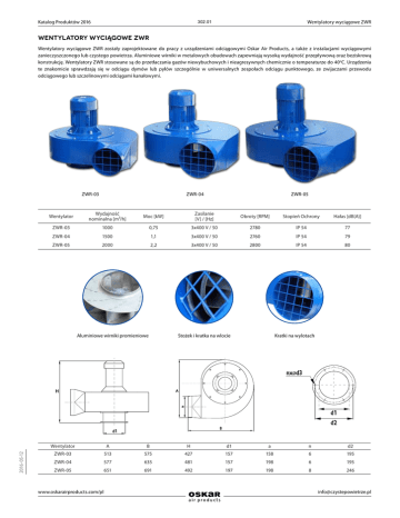 Wentylatory wyciągowe ZWR 302.01 Katalog Produktów 2016 Wentylatory wyciągowe ZWR Wentylatory wyciągowe ZWR zostały zaprojektowane do pracy z urządzeniami odciągowymi Oskar Air Products, a także z instalacjami wyciągowymi zanieczyszczonego lub czystego powietrza. Aluminiowe wirniki w metalowych obudowach zapewniają wysoką wydajność przepływową oraz beziskrową konstrukcję. Wentylatory ZWR stosowane są do przetłaczania gazów niewybuchowych i nieagresywnych chemicznie o temperaturze do 40oC. Urządzenia te znakomicie sprawdzają się w odciągu dymów lub pyłów szczególnie w uniwersalnych zespołach odciągu punktowego, ze zwijaczami przewodu odciągowego lub szczelinowymi odciągami kanałowymi. ZWR-03 ZWR-04 Wentylator Wydajność nominalna [m³/h] Moc [kW] ZWR-05 Zasilanie [V] / [Hz] Obroty [RPM] Stopień Ochrony Hałas [dB(A)] ZWR-03 1000 0,75 3x400 V / 50 2780 IP 54 77 ZWR-04 1500 1,1 3x400 V / 50 2760 IP 54 79 ZWR-05 2000 2,2 3x400 V / 50 2800 IP 54 80 a Aluminiowe wirniki promieniowe Stożek i kratka na wlocie Kratki na wylotach 2016-05-12 a Wentylator A B H d1 a n d2 ZWR-03 513 575 427 157 158 6 195 ZWR-04 577 635 481 157 198 6 195 ZWR-05 651 691 492 197 198 8 246 www.oskarairproducts.com/pl [email protected] 302.02 [Pa] Wentylatory ZWR Katalog Produktów 2016 ZWR -3 -4 -5 ZWR -03-04-05 50Hz (STANDARD) 2600 2500 2400 2300 2200 2100 2000 1900 1800 1700 1600 1500 1400 1300 1200 1100 1000 900 800 700 600 500 400 300 200 100 0 ZWR -05 Wielob. (ZWR-03 - ST Wielob. (ZWR-04 - ST Wielob. (ZWR-05 - ST ZWR -04 ZWR -03 0 200 400 600 800 1 000 1 200 1 400 1 600 1 800 2 000 2 200 2 400 2 600 2 800 3 000 ZWR-03 0,75kW 302-15-0001 Wentylator ZWR-03, wydajność nominalna 1000 m³/h, wlot Ø160 mm, wylot Ø160 mm, silnik 0,75 kW 400 V 3-fazowy (silnik jednofazowy na życzenie), bez włącznika silnikowego 302-15-0002 Wentylator ZWR-03 na stojaku, wydajność nominalna 1000 m³/h, wlot Ø160 mm, wylot Ø160 mm, silnik 0,75kW 400V 3-fazowy, z włącznikiem silnikowym, wyposażenie w kółka transportowe w opcji P07-01-0004 Wspornik montażowy WS-160 P07-01-0013 Wspornik montażowy WSD-160 (model dłuższy) 100 042 Włącznik silnikowy ZAR-WS z zabezpieczeniem przeciążeniowym 1,6-2,5 A 230 016 Zestaw kółek transportowych ZWR ZWR-04 1,1kW 302-20-0001 Wentylator ZWR-04, wydajność nominalna 1500 m³/h, wlot Ø160 mm, wylot Ø200 mm, silnik 1,1 kW 400 V 3-fazowy (silnik jednofazowy na życzenie), bez włącznika silnikowego 302-20-0002 Wentylator ZWR-04 na stojaku, wydajność nominalna 1500 m³/h, wlot Ø160 mm, wylot Ø200 mm, silnik 1,1 kW 400 V 3-fazowy, z włącznikiem silnikowym, wyposażenie w kółka transportowe w opcji P07-01-0013 Wspornik montażowy WSD-160 100 043 Włącznik silnikowy ZAR-WS z zabezpieczeniem przeciążeniowym 2,5-4 A 230 016 Zestaw kółek transportowych ZWR ZWR-05 2,2kW Wentylator ZWR-05, wydajność nominalna 2000 m³/h, wlot Ø160 mm, wylot Ø200 mm, silnik 2,2 kW 400 V 3-fazowy, bez włącznika silnikowego 302-30-0002 Wentylator ZWR-05 na stojaku, wydajność nominalna 2000 m³/h, wlot Ø200 mm, wylot Ø200 mm, silnik 2,2 kW 400 V 3-fazowy, z włącznikiem silnikowym, wyposażenie w kółka transportowe w opcji P07-01-0005 Wspornik montażowy WS-200 100 044 Włącznik silnikowy ZAR-WS z zabezpieczeniem przeciążeniowym 4-6,3 A 230 016 Zestaw kółek transportowych ZWR www.oskarairproducts.com/pl 2016-05-12 302-30-0001 [email protected]