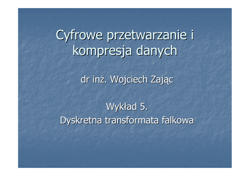 Cyfrowe przetwarzanie i kompresja danych dr inż. Wojciech Zając Wykład 5. Dyskretna transformata falkowa Schemat systemu transmisji danych wizyjnych Źródło danych Przetwarzanie Przesył Kontrolowane Zakłócenia straty Przetwarzanie Prezentacja Obliczanie jednowymiarowej transformaty DCT Przekształcenie proste X × DCT = Y x1 x2 x3 x4 x5 * x6 x7 x8 ? = y1 y2 y3 y4 y5 y6 y7 y8 Obliczanie jednowymiarowej transformaty DCT Przekształcenie proste X × DCT = Y x1 x2 x3 x4 x5 * x6 x7 x8 f1 f2 f3 f4 f5 f6 f7 f8 = y1 y2 y3 y4 y5 y6 y7 y8 Obliczanie jednowymiarowej transformaty DCT Przekształcenie proste X × DCT = Y Przekształcenie odwrotne Y × DCT = X x1 x2 x3 x4 x5 * x6 x7 x8 y1 y2 y3 y4 y5 * y6 y7 y8 = y1 y2 y3 y4 y5 y6 y7 y8 = x'1 x'2 x'3 x'4 x'5 x'6 x'7 x'8 f1 f2 f3 f4 f5 f6 f7 f8 f1 f2 f3 f4 f5 f6 f7 f8 DCT jako analiza sub-pasmowa Podział widma sygnału w analizie subpasmowej DCT _π 1 8 0 f 1 f 2 _π 2 8 _π 4 8 _π 3 8 f 3 f 4 _π 5 8 f 5 _π 6 8 f 6 _π 7 8 f 7 π f 8 Rozkład energii w obrazie Histogram wartości współczynników DCT obraz LENA256 300 250 200 150 100 50 0 0 5 10 15 20 25 30 35 40 Rozkład energii w obrazie Histogram wartości współczynników DCT obraz BABOON 300 250 200 150 100 50 0 0 5 10 15 20 25 30 Szczególna postać analizy subpasmowej X(z) H0 (z) G0 (z) + H1 (z) G1 (z) π _ 2 0 Xl Y(z) π Xh Podział widma sygnału w analizie falkowej H0(z) ↓2 xl H1(z) ↓2 xh x π _ 2 0 Xl π Xh Podział widma sygnału w analizie falkowej xl H0(z) ↓2 xll H1(z) ↓2 xlh ↓2 x H1(z) H0(z) ↓2 xh π _ 4 0 X ll π _ 2 X lh π Xh Podział widma sygnału w analizie falkowej xll xl ↓2 x ↓2 H1(z) H1(z) ↓2 π _ 8 0 X lll xlll H1(z) ↓2 xllh xlh xh π _ 4 X llh ↓2 ↓2 H0(z) H0(z) H0(z) π _ 2 X lh π Xh Analiza falkowa W przeciwieństwie do analizy fourierowskiej i kosinusowej, analiza falkowa nie wyraża badanych funkcji poprzez wielomiany, ale poprzez pewne specjalne funkcje - falki, które są tworzone ze stałej funkcji zwanej falką macierzystą, poddanej wielokrotnym translacjom. Uzyskane w ten sposób falki mają szereg interesujących skalowalnych właściwości. Można je odnosić zarówno do czasu jak i do częstotliwości, dopuszczając bliższe związki pomiędzy badaną funkcją (funkcją reprezentowaną), a jej współczynnikami. W ten sposób uzyskano większą numeryczna stabilność w procesie odtwarzania funkcji. Pokazano, że każde zadanie posługujące się szybką transformatą Fouriera może zostać sformułowane za pomocą falek, dając przy tym więcej informacji przestrzennej (o miejscu położenia) jak i częstotliwościowej. W ten sposób zamiast tworzyć spektrum natężenie-częstotliwość można otrzymać spektrum falkowe (wavelet spectrum). TRANSFORMATA FALKOWA Cechą charakterystyczną funkcji bazowych transformaty falkowej jest to, że ich wartość średnia jest równa zero i mają postać szybko gasnących oscylacji. Ciągła transformata falkowa sygnału ciągłego x(t), z zastosowaniem falki bazowej g(t) jest opisana równaniem: Wf (a, b ) = ∞ t −b x(t )g ∗ dt ∫ a −∞ a 1 gdzie a jest współczynnikiem skali (wpływa na czas trwania) falki, b współczynnikiem przesunięcia (zmienia położenie na osi czasu). Wartość współczynników a i b interpretuje się jako miarę podobieństwa do danego fragmentu analizowanego sygnału. Wynikiem ciągłego przekształcenia falkowego są współczynniki Wf(a,b), które odwzorowują sygnał oryginalny x(t) za pomocą falki bazowej g(t) w przestrzeni czas-częstotliwość. Przekształcenie falkowe Przekształcenie falkowe opiera się na szablonie, który wykorzystuje pewną funkcję podstawową (falkę podstawową). Transformatę falkową oblicza się na podstawie wzoru , poprzez wyznaczanie iloczynu skalarnego z przeskalowanymi i przesuniętymi wersjami falki podstawowej. CWT f (τ , s ) = f (t ), Ψτ , s (t ) = ∞ t −τ f (t )Ψ ∫ s s −∞ 1 dt gdzie: Ψ(t ) – falka podstawowa, s,τ – odpowiednio argumenty skali i czasu, tworzące dziedzinę transformaty Przekształcenie falkowe Teoria falkowej reprezentacji sygnału nie definiuje konkretnej postaci falki, określa jedynie własności jakie musi posiadać taka funkcja. Wymaga się, by falka miała skończoną energię, wartość średnią równą zero oraz by posiadała niezerowe wartości tylko w skończonym przedziale. Spełnienie tych warunków powoduje, że falka posiada postać krótkotrwałej oscylacji , skąd wywodzi się jej nazwa. Przekształcenie falkowe W wyniku jednowymiarowego przekształcenia falkowego otrzymuje się dwuwymiarową półpłaszczyznę , której argumentami są skala i czas. Zmienna skali wywodzi się ze skalowania falki podczas wyznaczania transformaty i posiada znaczenie odwrotności chwilowej częstotliwości. Teoretyczne badania naukowe doprowadziły do opracowania różnych odmian przekształcenia falkowego, przeznaczonych do cyfrowego przetwarzania sygnałów. Największe znaczenie posiada tu dyskretne przekształcenie falkowe, które dostarcza najbardziej zwartą reprezentację falkową sygnału dyskretnego. W wyniku tej transformacji otrzymuje się zbiór współczynników pogrupowanych odpowiednimi poziomami skali, zdyskretyzowanej wykładniczo. Na każdym poziomie skali, odpowiadającym analizowaniu sygnału z różną rozdzielczością, otrzymuje się współczynniki, których gęstość rozmieszczenia w czasie jest zależna od bieżącej wartości skali. Dzięki temu, uzyskuje się własność wielorozdzielczości, pozwalającą na dopasowanie się rozdzielczości czasowej analizy sygnału do aktualnej skali analizy. Jednowymiarowa analiza falkowa x ll xl ↓2 x ↓2 H 1 (z) ↓2 H 1 (z) x lll ↑2 ↑2 ^ xl H0(z) G 0 (z) ↑2 ↑2 π _ 4 X llh ^ + ↑2 π _ 2 X lh HG00(z) (z) HG1(z) (z) xh X lll x llh x lh + x lh π _ 8 ↓2 x ll HG11(z) 0 H 1 (z) ^ + x llh x lll xh (z) HG00(z) ↑2 ↓2 ↓2 H 0 (z) H 0 (z) H 0 (z) G11(z) H (z) π Xh x Dwuwymiarowa analiza falkowa 