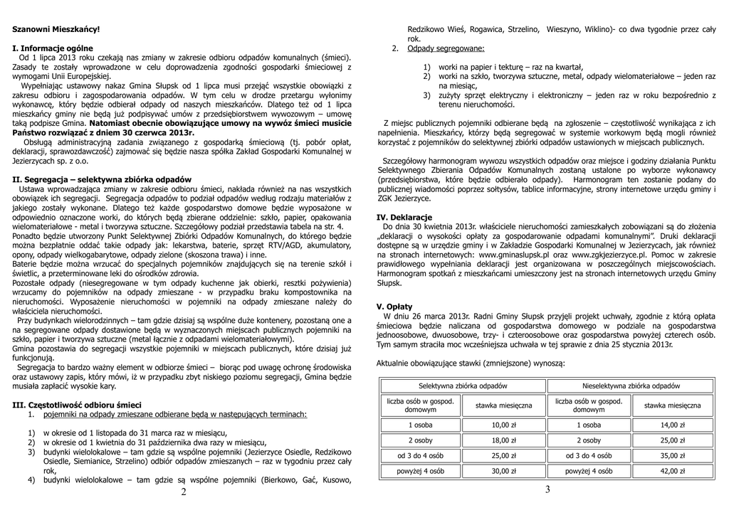 Szanowni Mieszkańcy! I. Informacje ogólne Od 1 lipca 2013 roku czekają nas zmiany w zakresie odbioru odpadów komunalnych (śmieci). Zasady te zostały wprowadzone w celu doprowadzenia zgodności gospodarki śmieciowej z wymogami Unii Europejskiej. Wypełniając ustawowy nakaz Gmina Słupsk od 1 lipca musi przejąć wszystkie obowiązki z zakresu odbioru i zagospodarowania odpadów. W tym celu w drodze przetargu wyłonimy wykonawcę, który będzie odbierał odpady od naszych mieszkańców. Dlatego też od 1 lipca mieszkańcy gminy nie będą już podpisywać umów z przedsiębiorstwem wywozowym – umowę taką podpisze Gmina. Natomiast obecnie obowiązujące umowy na wywóz śmieci musicie Państwo rozwiązać z dniem 30 czerwca 2013r. Obsługą administracyjną zadania związanego z gospodarką śmieciową (tj. pobór opłat, deklaracji, sprawozdawczość) zajmować się będzie nasza spółka Zakład Gospodarki Komunalnej w Jezierzycach sp. z o.o. II. Segregacja – selektywna zbiórka odpadów Ustawa wprowadzająca zmiany w zakresie odbioru śmieci, nakłada również na nas wszystkich obowiązek ich segregacji. Segregacja odpadów to podział odpadów według rodzaju materiałów z jakiego zostały wykonane. Dlatego też każde gospodarstwo domowe będzie wyposażone w odpowiednio oznaczone worki, do których będą zbierane oddzielnie: szkło, papier, opakowania wielomateriałowe - metal i tworzywa sztuczne. Szczegółowy podział przedstawia tabela na str. 4. Ponadto będzie utworzony Punkt Selektywnej Zbiórki Odpadów Komunalnych, do którego będzie można bezpłatnie oddać takie odpady jak: lekarstwa, baterie, sprzęt RTV/AGD, akumulatory, opony, odpady wielkogabarytowe, odpady zielone (skoszona trawa) i inne. Baterie będzie można wrzucać do specjalnych pojemników znajdujących się na terenie szkół i świetlic, a przeterminowane leki do ośrodków zdrowia. Pozostałe odpady (niesegregowane w tym odpady kuchenne jak obierki, resztki pożywienia) wrzucamy do pojemników na odpady zmieszane - w przypadku braku kompostownika na nieruchomości. Wyposażenie nieruchomości w pojemniki na odpady zmieszane należy do właściciela nieruchomości. Przy budynkach wielorodzinnych – tam gdzie dzisiaj są wspólne duże kontenery, pozostaną one a na segregowane odpady dostawione będą w wyznaczonych miejscach publicznych pojemniki na szkło, papier i tworzywa sztuczne (metal łącznie z odpadami wielomateriałowymi). Gmina pozostawia do segregacji wszystkie pojemniki w miejscach publicznych, które dzisiaj już funkcjonują. Segregacja to bardzo ważny element w odbiorze śmieci – biorąc pod uwagę ochronę środowiska oraz ustawowy zapis, który mówi, iż w przypadku zbyt niskiego poziomu segregacji, Gmina będzie musiała zapłacić wysokie kary. III. Częstotliwość odbioru śmieci 1. pojemniki na odpady zmieszane odbierane będą w następujących terminach: 1) 2) 3) 4) w okresie od 1 listopada do 31 marca raz w miesiącu, w okresie od 1 kwietnia do 31 października dwa razy w miesiącu, budynki wielolokalowe – tam gdzie są wspólne pojemniki (Jezierzyce Osiedle, Redzikowo Osiedle, Siemianice, Strzelino) odbiór odpadów zmieszanych – raz w tygodniu przez cały rok, budynki wielolokalowe – tam gdzie są wspólne pojemniki (Bierkowo, Gać, Kusowo, 2 2. Redzikowo Wieś, Rogawica, Strzelino, Wieszyno, Wiklino)- co dwa tygodnie przez cały rok. Odpady segregowane: 1) 2) 3) worki na papier i tekturę – raz na kwartał, worki na szkło, tworzywa sztuczne, metal, odpady wielomateriałowe – jeden raz na miesiąc, zużyty sprzęt elektryczny i elektroniczny – jeden raz w roku bezpośrednio z terenu nieruchomości. Z miejsc publicznych pojemniki odbierane będą na zgłoszenie – częstotliwość wynikająca z ich napełnienia. Mieszkańcy, którzy będą segregować w systemie workowym będą mogli również korzystać z pojemników do selektywnej zbiórki odpadów ustawionych w miejscach publicznych. Szczegółowy harmonogram wywozu wszystkich odpadów oraz miejsce i godziny działania Punktu Selektywnego Zbierania Odpadów Komunalnych zostaną ustalone po wyborze wykonawcy (przedsiębiorstwa, które będzie odbierało odpady). Harmonogram ten zostanie podany do publicznej wiadomości poprzez sołtysów, tablice informacyjne, strony internetowe urzędu gminy i ZGK Jezierzyce. IV. Deklaracje Do dnia 30 kwietnia 2013r. właściciele nieruchomości zamieszkałych zobowiązani są do złożenia „deklaracji o wysokości opłaty za gospodarowanie odpadami komunalnymi”. Druki deklaracji dostępne są w urzędzie gminy i w Zakładzie Gospodarki Komunalnej w Jezierzycach, jak również na stronach internetowych: www.gminaslupsk.pl oraz www.zgkjezierzyce.pl. Pomoc w zakresie prawidłowego wypełniania deklaracji jest organizowana w poszczególnych miejscowościach. Harmonogram spotkań z mieszkańcami umieszczony jest na stronach internetowych urzędu Gminy Słupsk. V. Opłaty W dniu 26 marca 2013r. Radni Gminy Słupsk przyjęli projekt uchwały, zgodnie z którą opłata śmieciowa będzie naliczana od gospodarstwa domowego w podziale na gospodarstwa jednoosobowe, dwuosobowe, trzy- i czteroosobowe oraz gospodarstwa powyżej czterech osób. Tym samym straciła moc wcześniejsza uchwała w tej sprawie z dnia 25 stycznia 2013r. Aktualnie obowiązujące stawki (zmniejszone) wynoszą: Selektywna zbiórka odpadów Nieselektywna zbiórka odpadów liczba osób w gospod. domowym stawka miesięczna liczba osób w gospod. domowym stawka miesięczna 1 osoba 10,00 zł 1 osoba 14,00 zł 2 osoby 18,00 zł 2 osoby 25,00 zł od 3 do 4 osób 25,00 zł od 3 do 4 osób 35,00 zł powyżej 4 osób 30,00 zł powyżej 4 osób 42,00 zł 3 WRZUCAMY NIE WRZUCAMY Tworzywo sztuczne, opakowania wielomateriałowe, metale • czyste opakowania po chemii gospodarczej • reklamówki, worki foliowe, folie, • kubki i tacki jednorazowe, jednorazowe butelki typu PET (po napojach i wodzie mineralnej