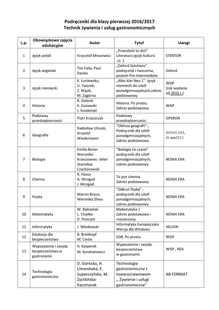 Podręczniki dla klasy pierwszej 2016/2017 Technik żywienia i usług